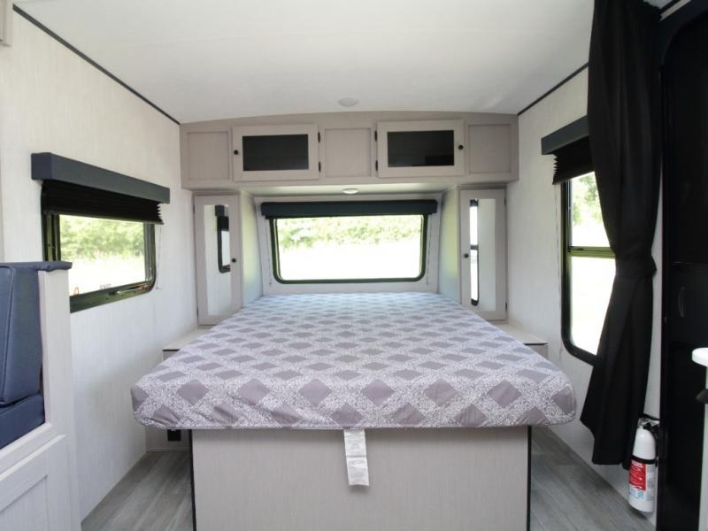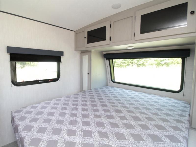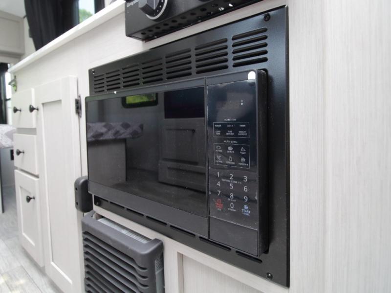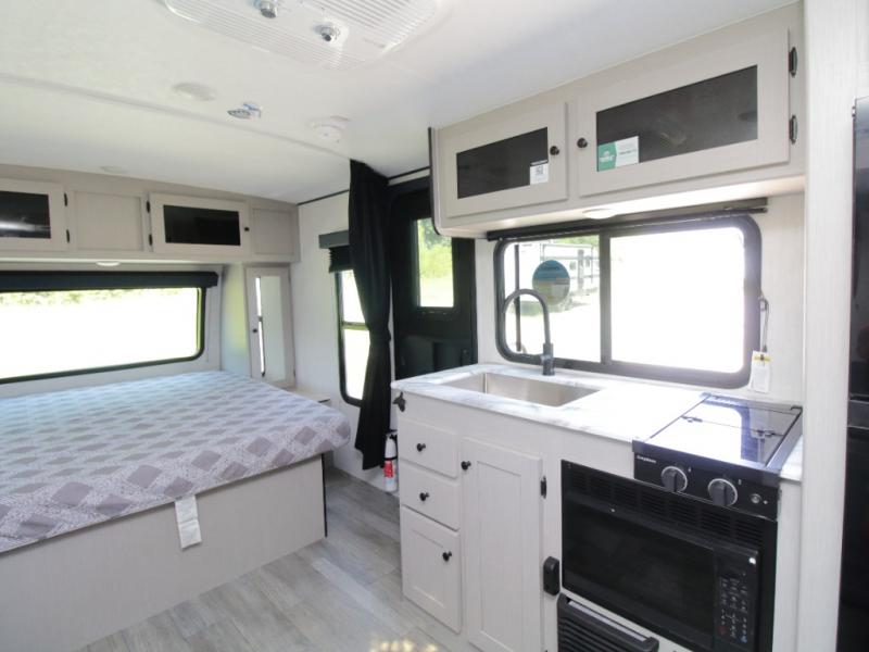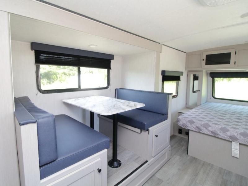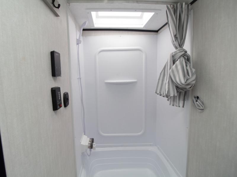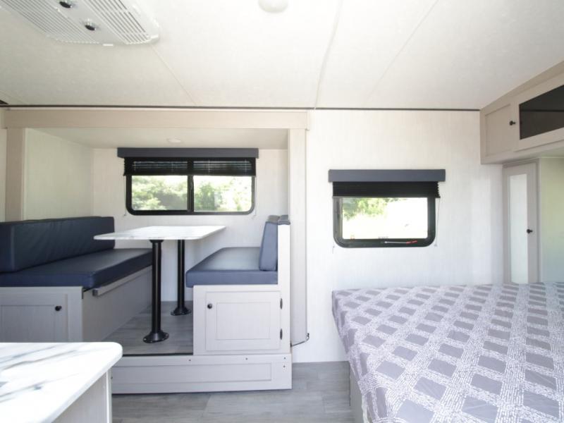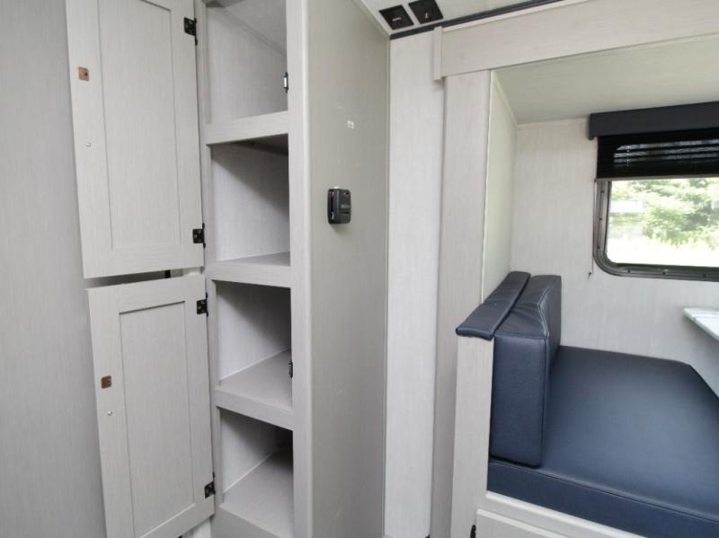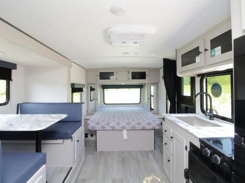 Prepare meals effortlessly with a two-burner cooktop, microwave, and pantry for storing snacks and essentials. Enjoy your meals at the spacious booth dinette slide, which also provides extra interior space. After a day of adventure, refresh in the full rear corner bathroom with a tub/shower combo.