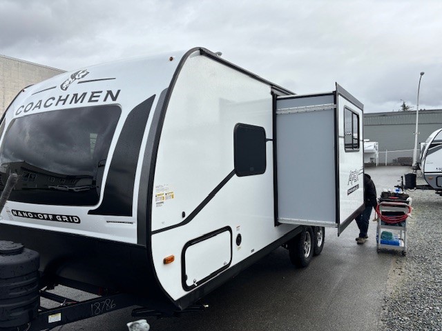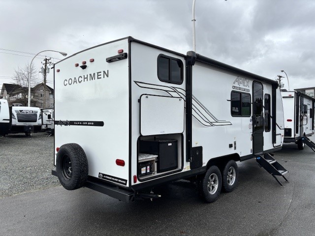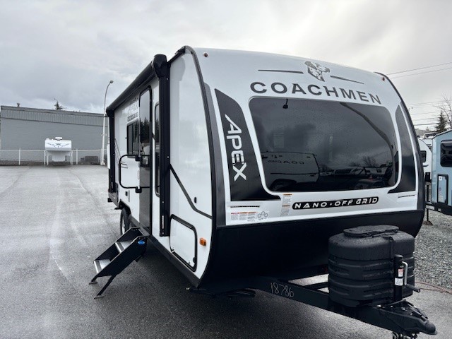 You will find comfort, convenience, and a sturdy construction with each of these Coachmen RV Apex Nano travel trailers! They are held together with an aluma-cage construction, an I-beam chassis, plus vacuum-bonded laminated dual Azdel fiberglass walls for double the protection against the elements. The 200-watt solar panel with a 30 amp control charger is included within the Off-Grid Package, along with two 20 lb. LP tanks, a high velocity power roof vent, plus 12V outlets to keep you powered up. More exterior feature include a hot/cold shower, four stabilizer jacks, a power awning with LED lighting, and magnetic baggage door catches to easily pack and unload your gear. You will love the interior of your Apex Nano with Congoleum residential flooring, one-piece seamless edge countertops, matte black hardware in the galley, and a hand-crafted wood medicine cabinet in the bath.