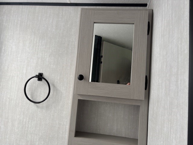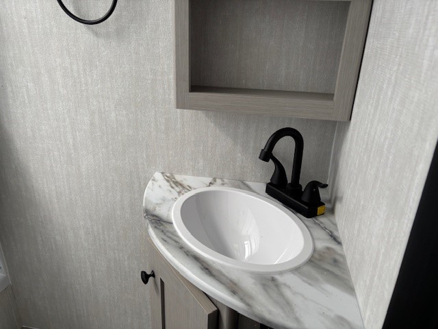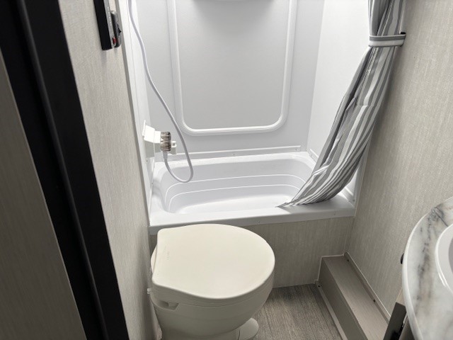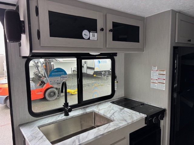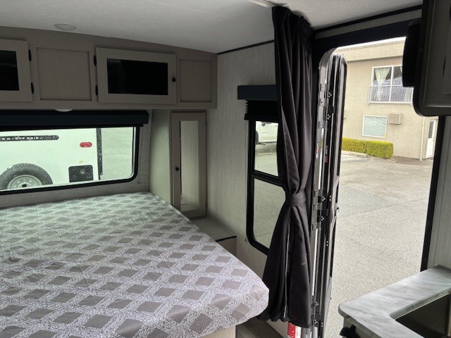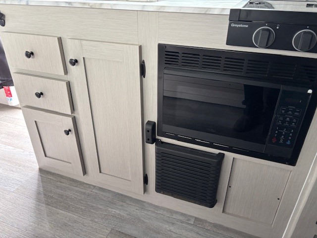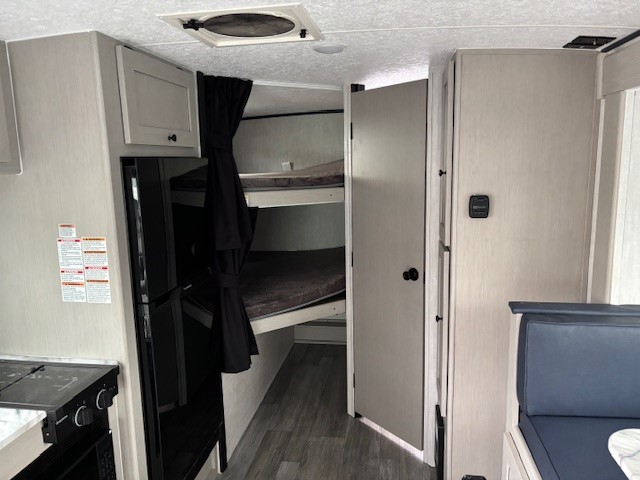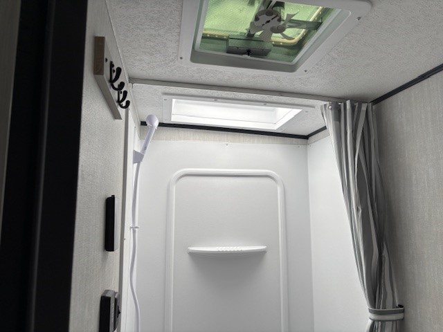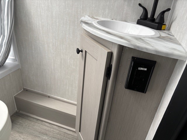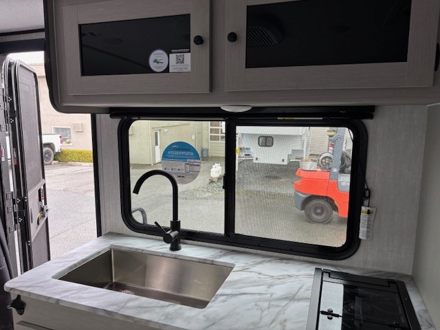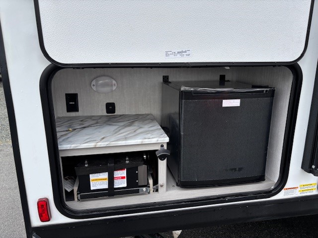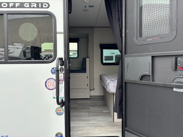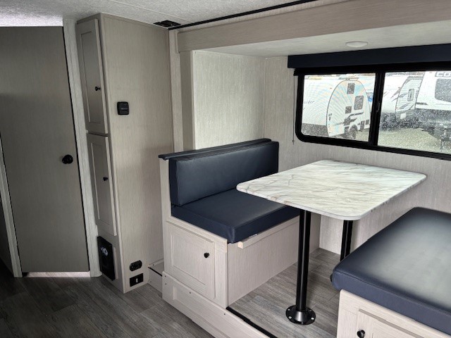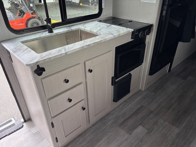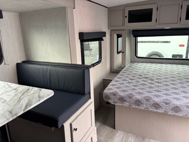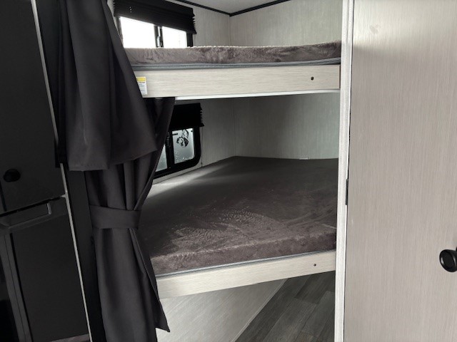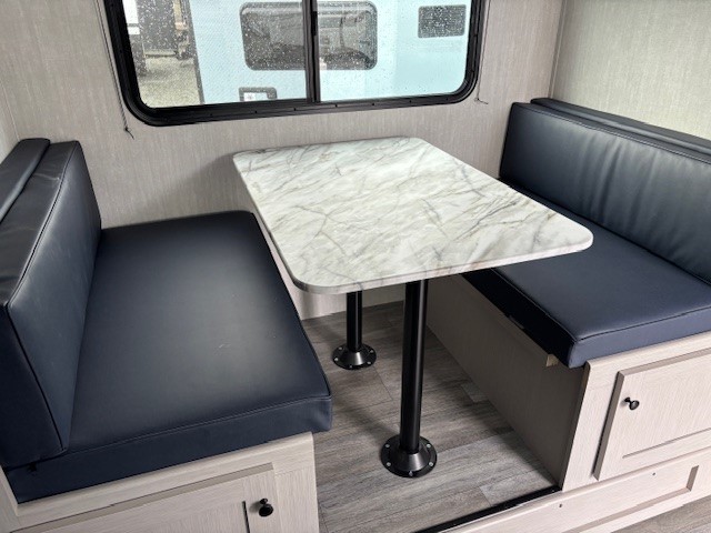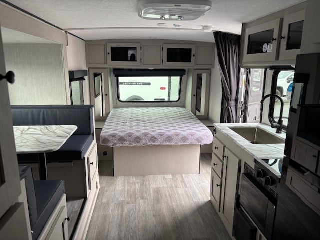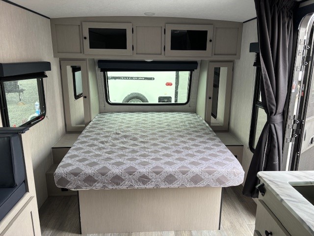 You and a few friends or family members can camp comfortably in this travel trailer! It features a front queen bed with wardrobes on either side to keep your clothes out of the way or you can switch it out for the optional Murphy bed for more versatility. Two others can sleep on the rear corner upper double bed and lower flip up double bed. After you have fried up some eggs on the two burner cooktop and heated up a piece of banana bread in the microwave, you can head to the booth dinette slide to enjoy it. There is even a pantry to store your coffee grounds and snacks. Now that your bellies are full, you can freshen up in the rear corner bathroom with the tub/shower.