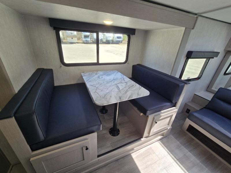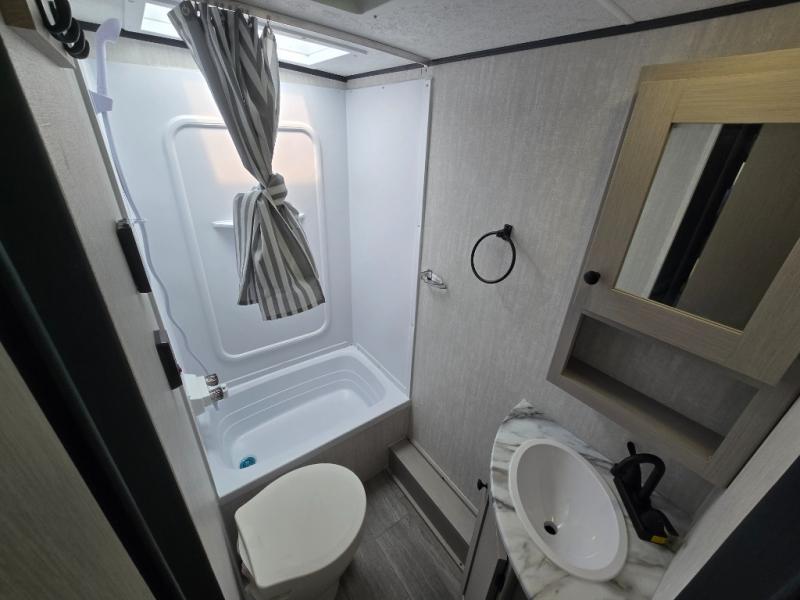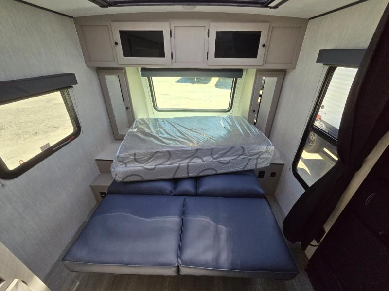 You and a few friends or family members can camp comfortably in this travel trailer! It features a front queen bed with wardrobes on either side to keep your clothes out of the way or you can switch it out for the optional Murphy bed for more versatility. Two others can sleep on the rear corner upper double bed and lower flip up double bed. After you have fried up some eggs on the two burner cooktop and heated up a piece of banana bread in the microwave, you can head to the booth dinette slide to enjoy it. There is even a pantry to store your coffee grounds and snacks. Now that your bellies are full, you can freshen up in the rear corner bathroom with the tub/shower.