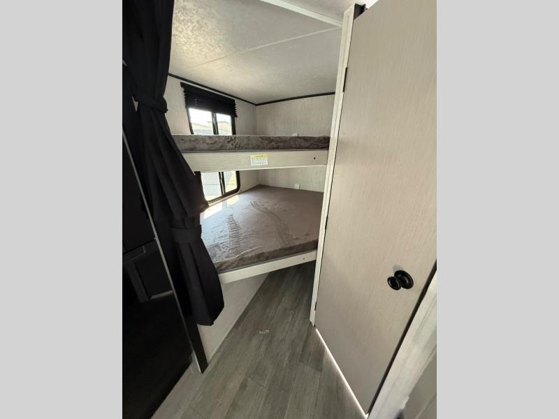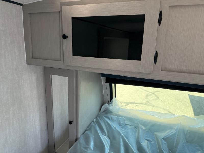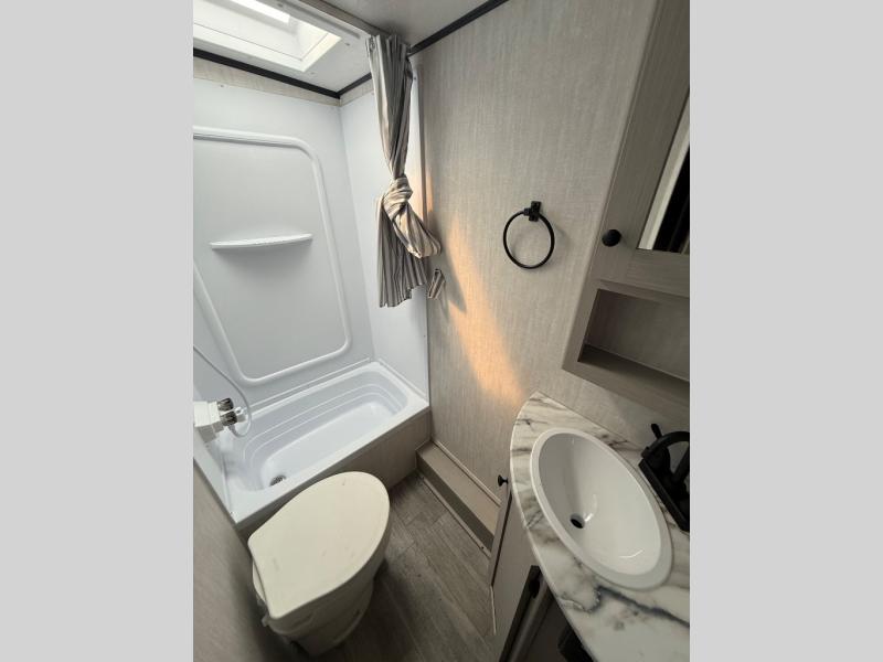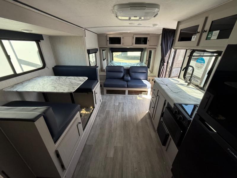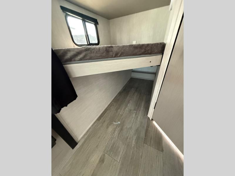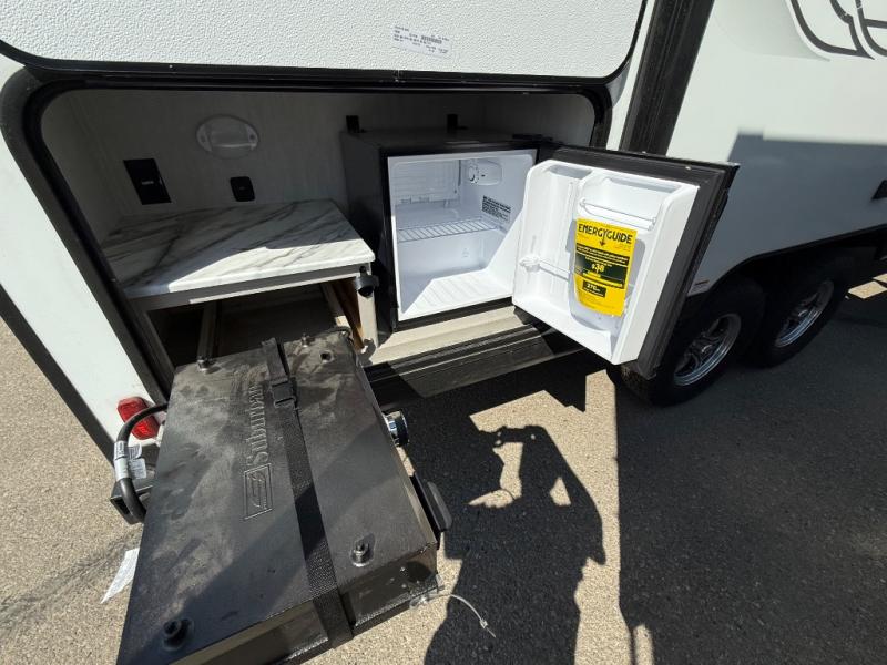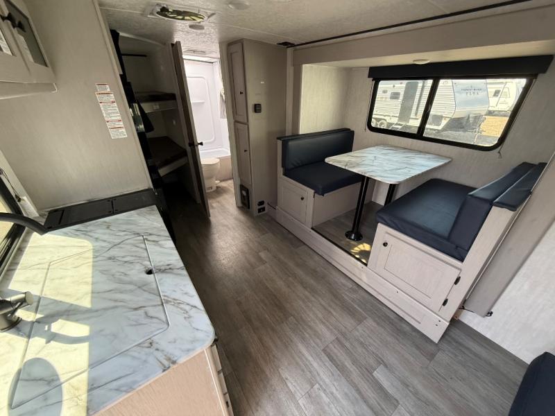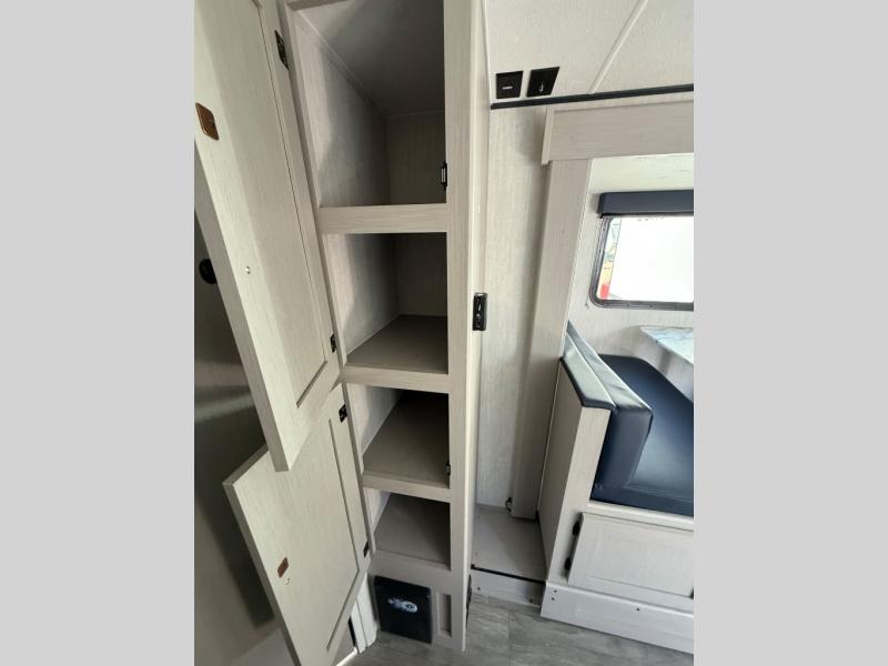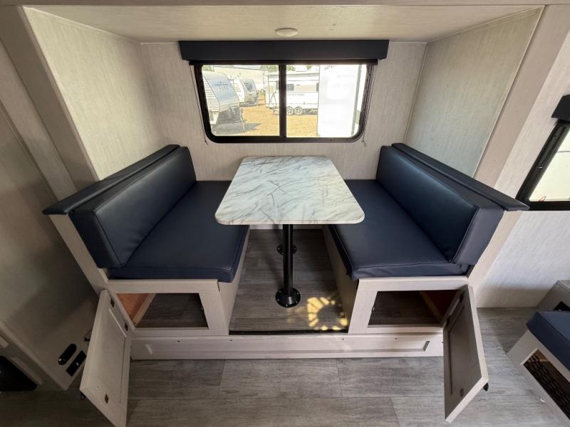 You and a few friends or family members can camp comfortably in this travel trailer! It features a front queen bed with wardrobes on either side to keep your clothes out of the way or you can switch it out for the optional Murphy bed for more versatility. Two others can sleep on the rear corner upper double bed and lower flip up double bed. After you have fried up some eggs on the two burner cooktop and heated up a piece of banana bread in the microwave, you can head to the booth dinette slide to enjoy it. There is even a pantry to store your coffee grounds and snacks. Now that your bellies are full, you can freshen up in the rear corner bathroom with the tub/shower.