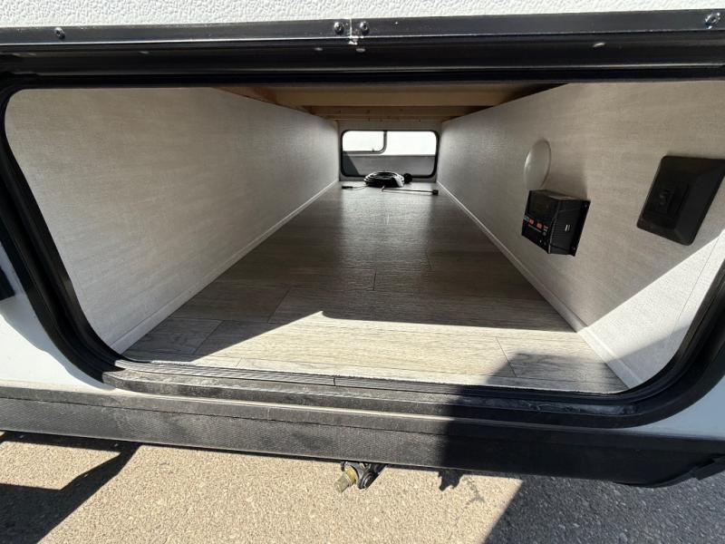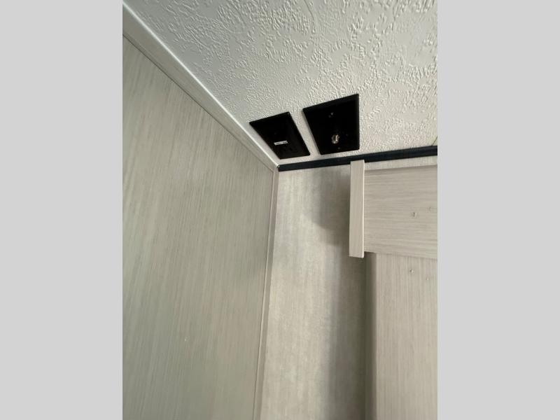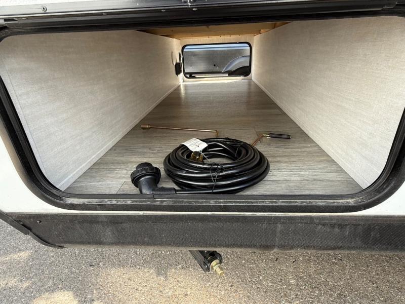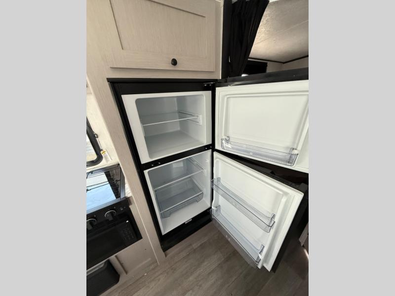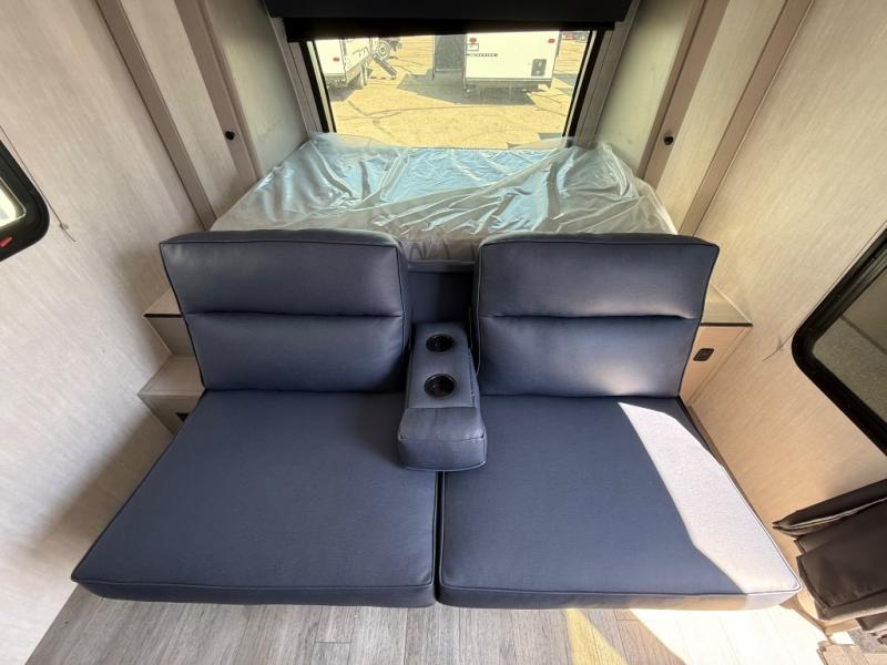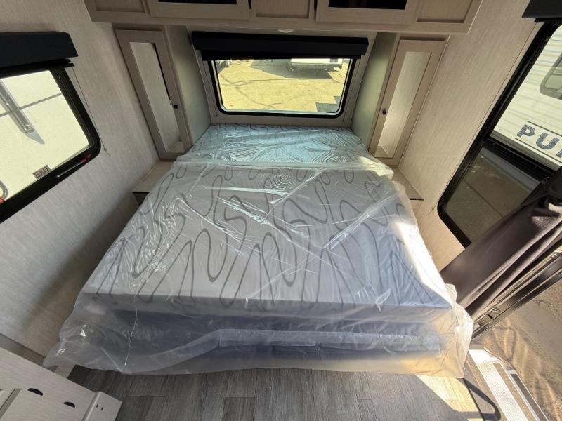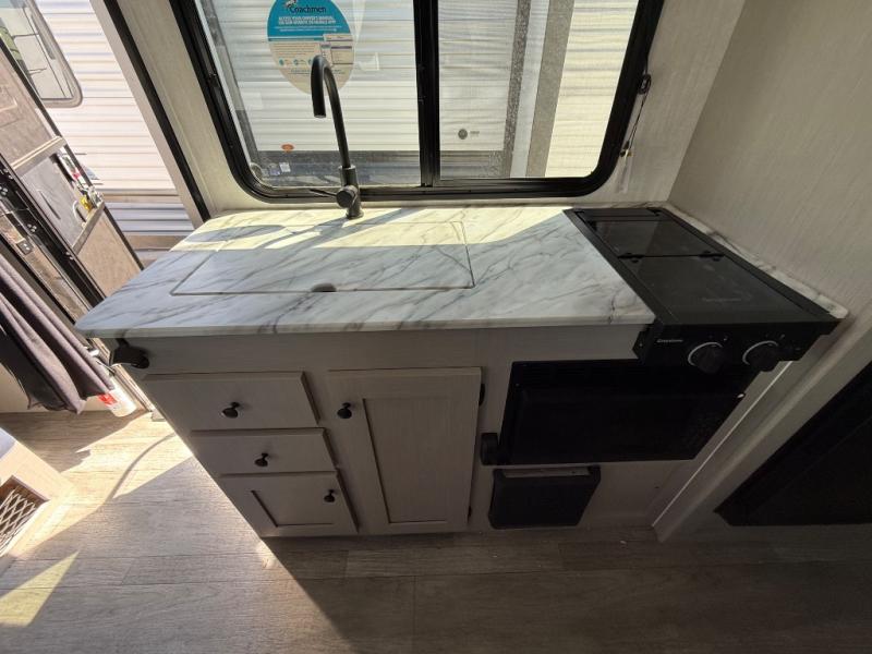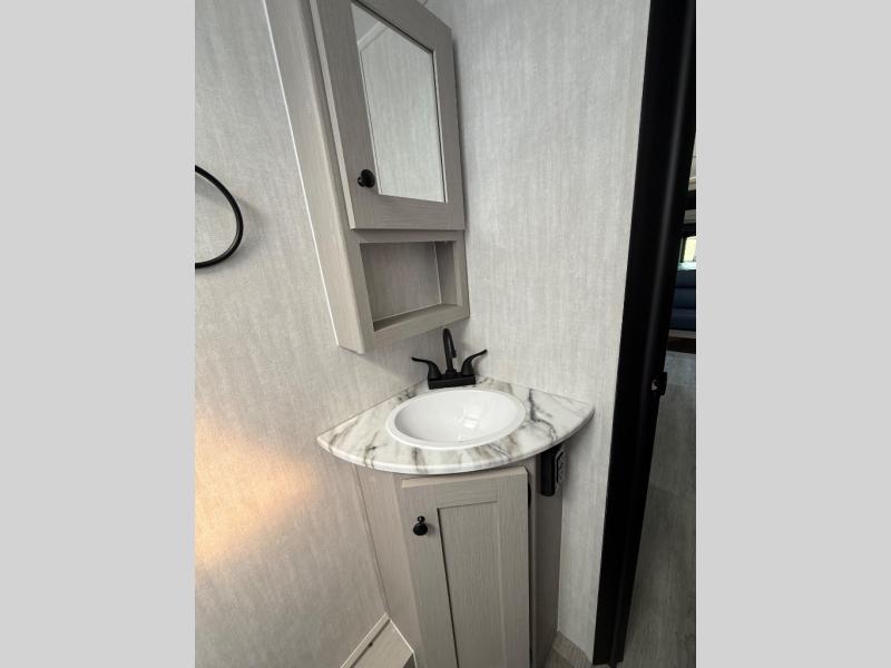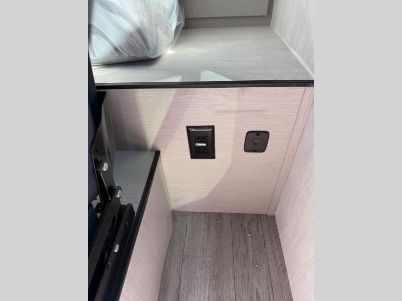 You and a few friends or family members can camp comfortably in this travel trailer! It features a front queen bed with wardrobes on either side to keep your clothes out of the way or you can switch it out for the optional Murphy bed for more versatility. Two others can sleep on the rear corner upper double bed and lower flip up double bed. After you have fried up some eggs on the two burner cooktop and heated up a piece of banana bread in the microwave, you can head to the booth dinette slide to enjoy it. There is even a pantry to store your coffee grounds and snacks. Now that your bellies are full, you can freshen up in the rear corner bathroom with the tub/shower.