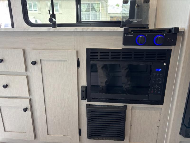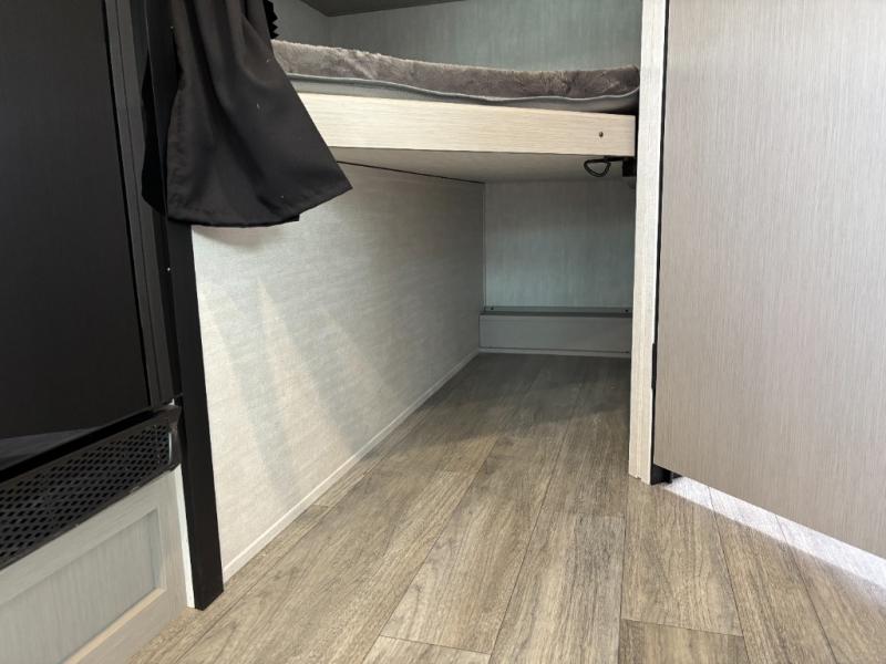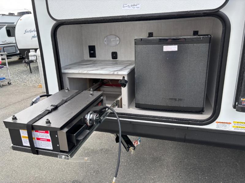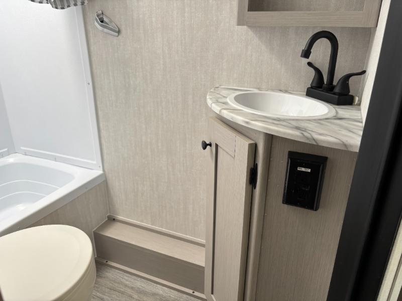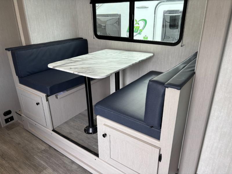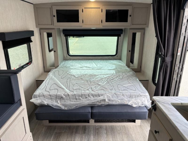 You and a few friends or family members can camp comfortably in this travel trailer! It features a front queen bed with wardrobes on either side to keep your clothes out of the way or you can switch it out for the optional Murphy bed for more versatility. Two others can sleep on the rear corner upper double bed and lower flip up double bed. After you have fried up some eggs on the two burner cooktop and heated up a piece of banana bread in the microwave, you can head to the booth dinette slide to enjoy it. There is even a pantry to store your coffee grounds and snacks. Now that your bellies are full, you can freshen up in the rear corner bathroom with the tub/shower.