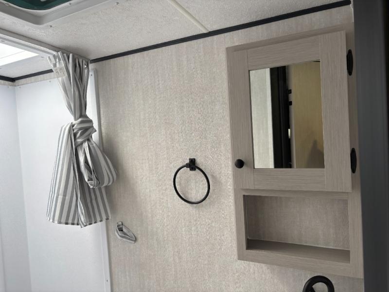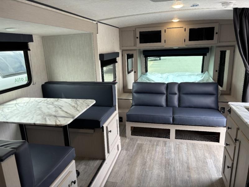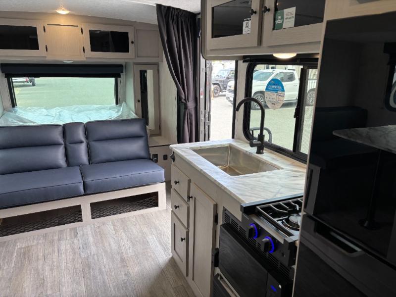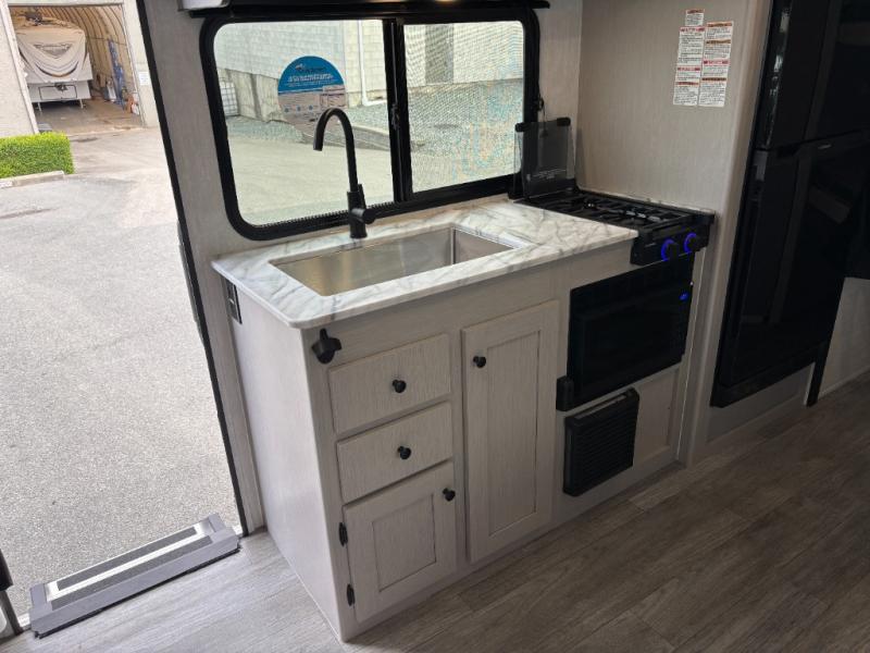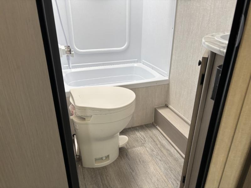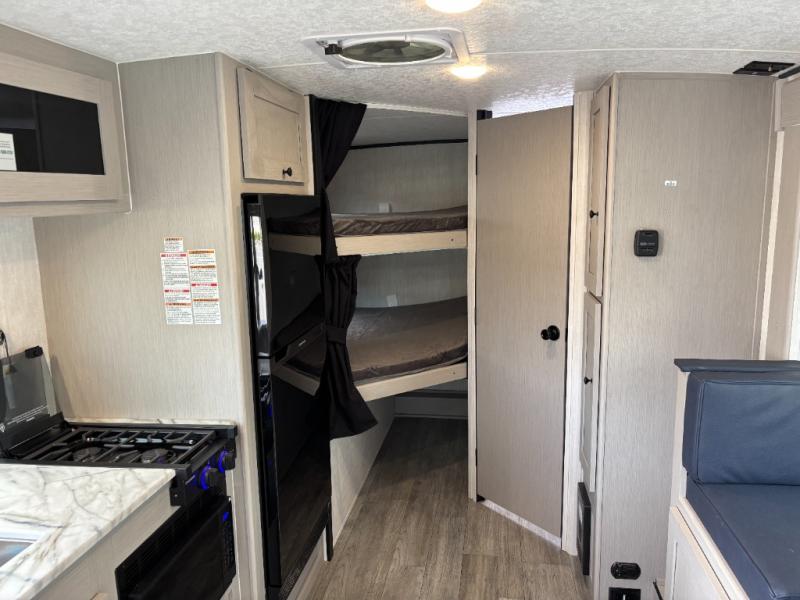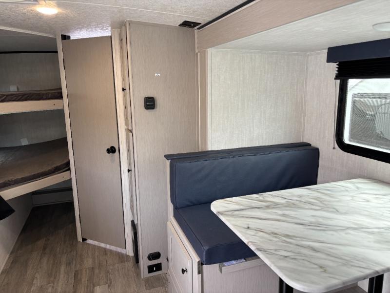You and a few friends or family members can camp comfortably in this travel trailer! It features a front queen bed with wardrobes on either side to keep your clothes out of the way or you can switch it out for the optional Murphy bed for more versatility. Two others can sleep on the rear corner upper double bed and lower flip up double bed. After you have fried up some eggs on the two burner cooktop and heated up a piece of banana bread in the microwave, you can head to the booth dinette slide to enjoy it. There is even a pantry to store your coffee grounds and snacks. Now that your bellies are full, you can freshen up in the rear corner bathroom with the tub/shower.