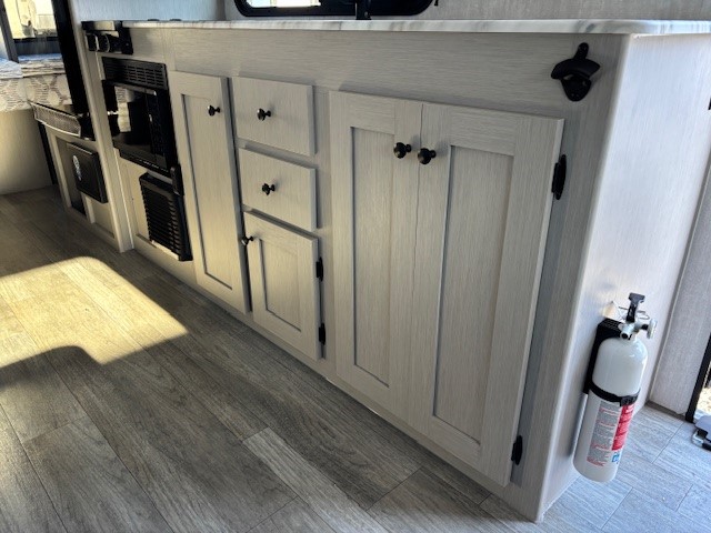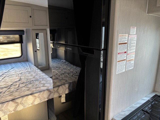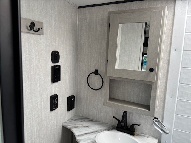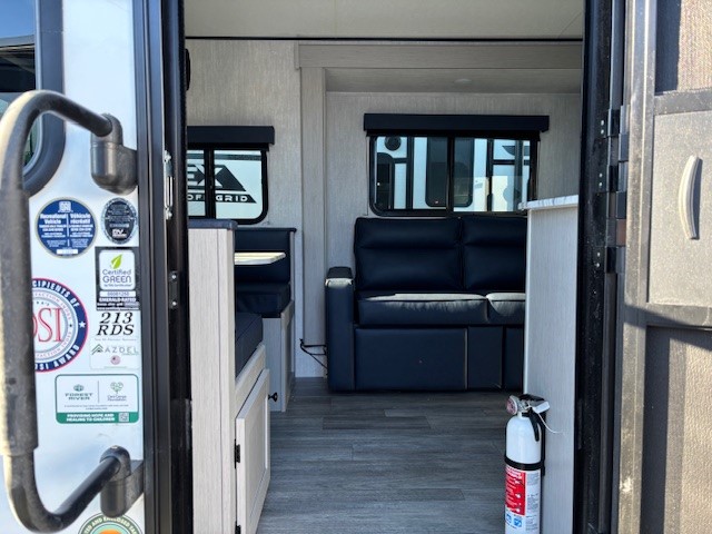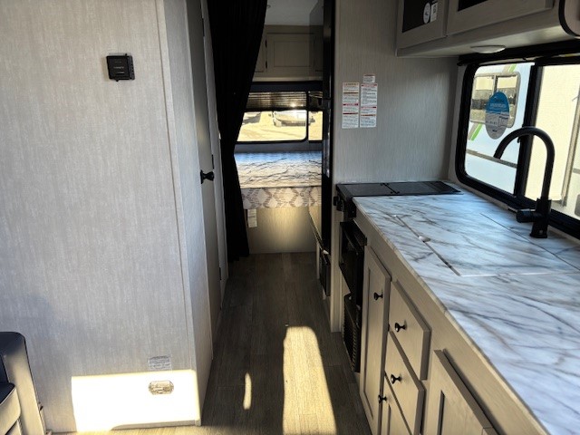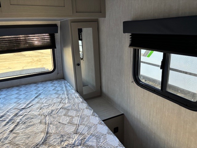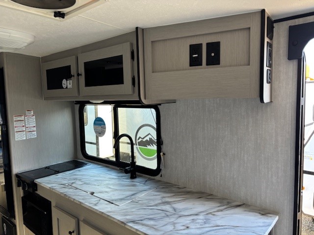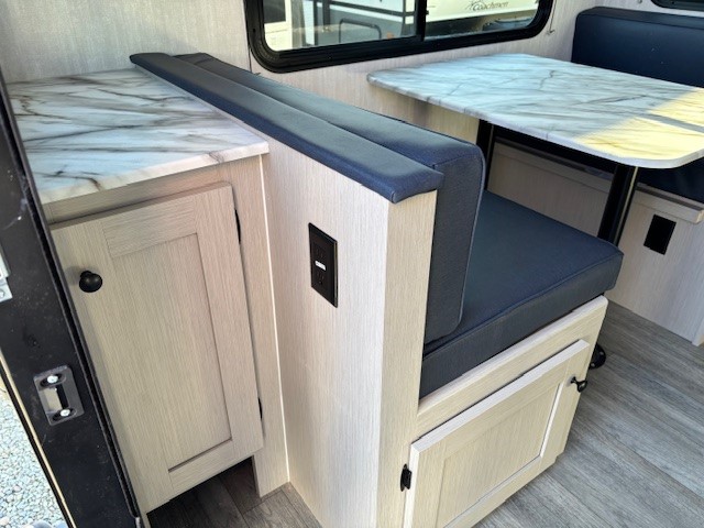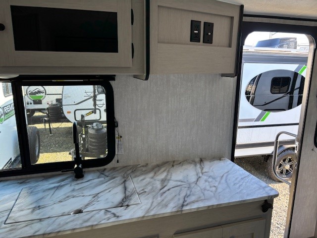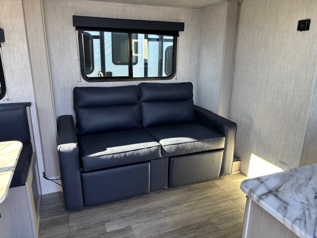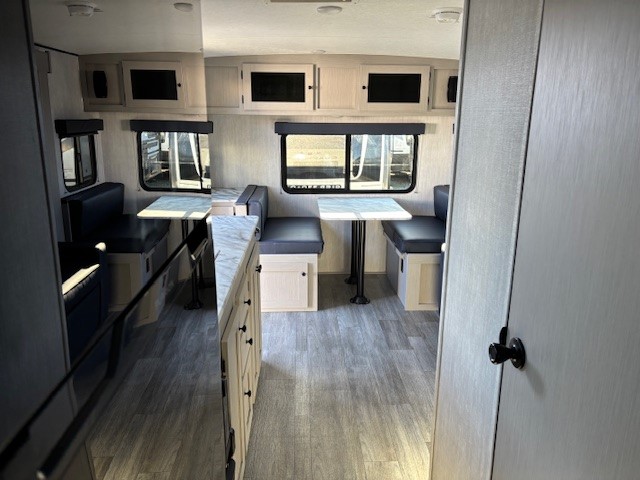 Escape the hustle and bustle of everyday life with this travel trailer! You will start each morning feeling recharged after sleeping on the front queen bed with wardrobes on either side to keep your clothes looking nice. The full bathroom has a neo-angled shower for you to freshen up and a medicine cabinet to store your toiletries. The sofa slide is across from the entertainment center for a comfortable movie night if you add your own TV, or you can play some card games at the rear booth dinette with an end table on one side.