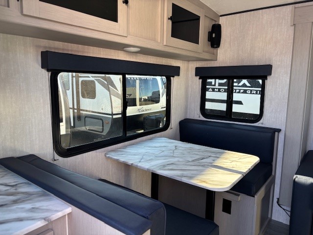 You will find comfort, convenience, and a sturdy construction with each of these Coachmen RV Apex Nano travel trailers! They are held together with an aluma-cage construction, an I-beam chassis, plus vacuum-bonded laminated dual Azdel fiberglass walls for double the protection against the elements. The 200-watt solar panel with a 30 amp control charger is included within the Off-Grid Package, along with two 20 lb. LP tanks, a high velocity power roof vent, plus 12V outlets to keep you powered up. More exterior feature include a hot/cold shower, four stabilizer jacks, a power awning with LED lighting, and magnetic baggage door catches to easily pack and unload your gear. You will love the interior of your Apex Nano with Congoleum residential flooring, one-piece seamless edge countertops, matte black hardware in the galley, and a hand-crafted wood medicine cabinet in the bath.