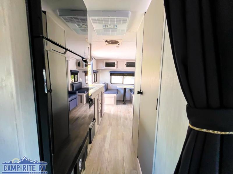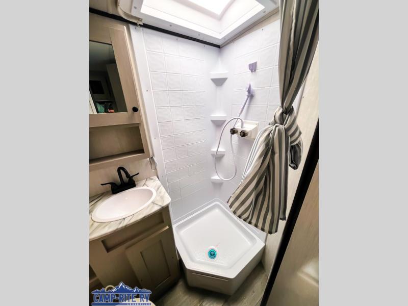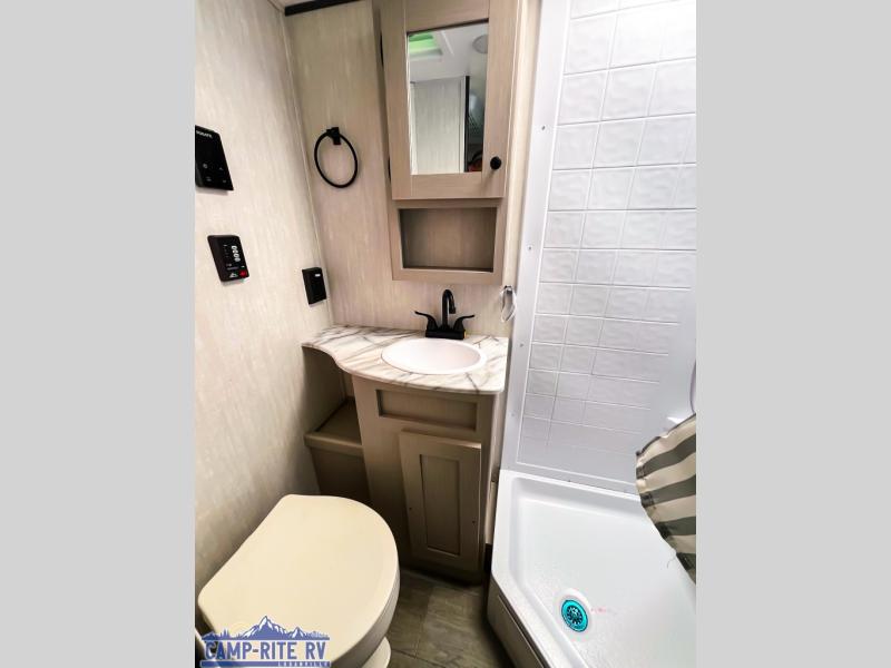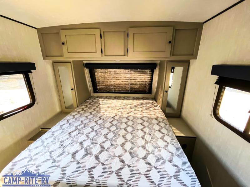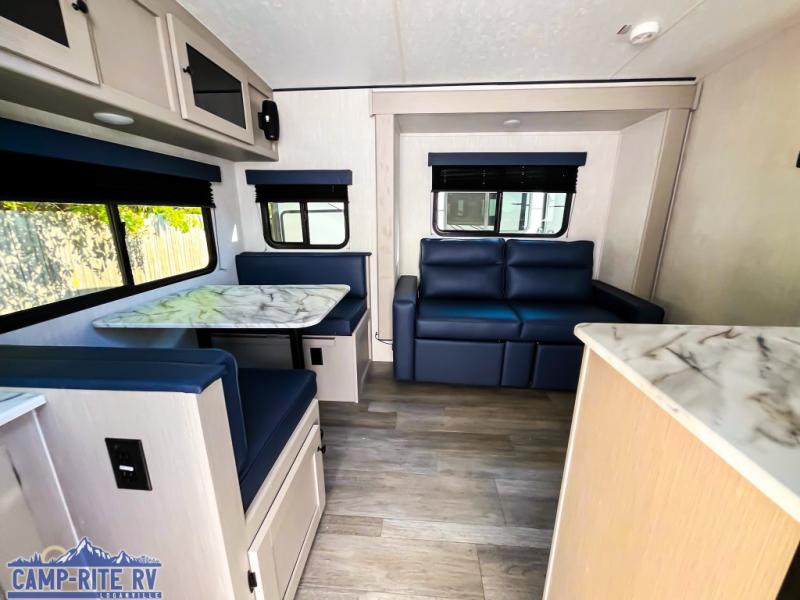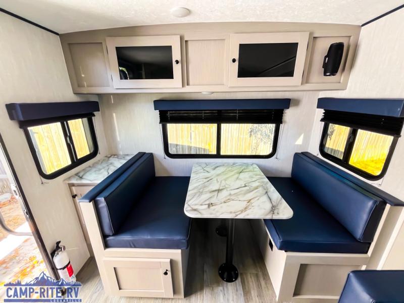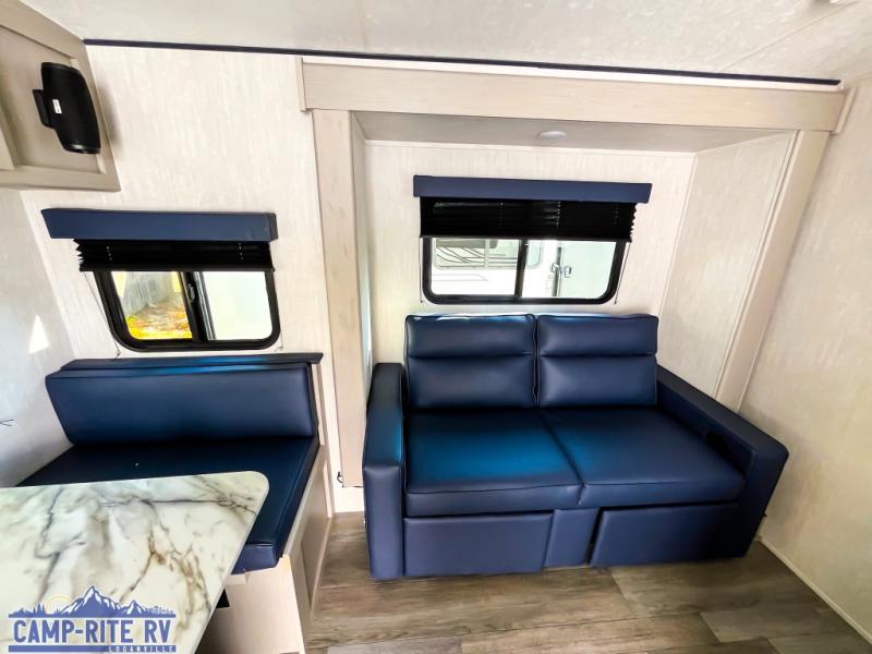 Escape the hustle and bustle of everyday life with this travel trailer! You will start each morning feeling recharged after sleeping on the front queen bed with wardrobes on either side to keep your clothes looking nice. The full bathroom has a neo-angled shower for you to freshen up and a medicine cabinet to store your toiletries. The sofa slide is across from the entertainment center for a comfortable movie night if you add your own TV, or you can play some card games at the rear booth dinette with an end table on one side.