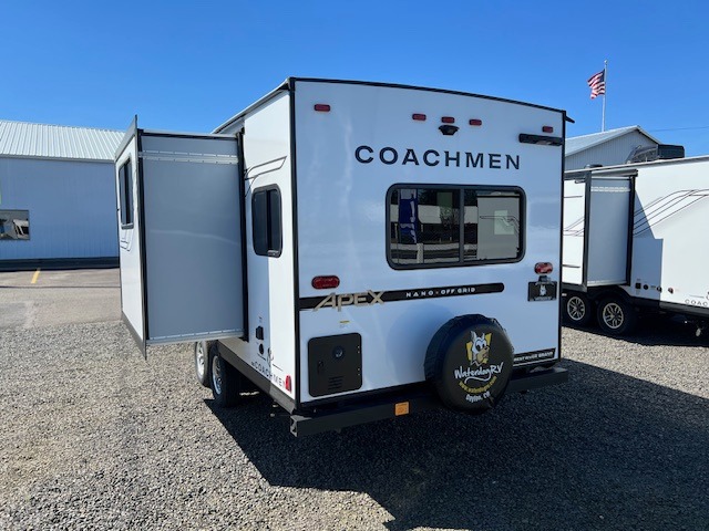 You will find comfort, convenience, and a sturdy construction with each of these Coachmen RV Apex Nano travel trailers! They are held together with an aluma-cage construction, an I-beam chassis, plus vacuum-bonded laminated dual Azdel fiberglass walls for double the protection against the elements. The 200-watt solar panel with a 30 amp control charger is included within the Off-Grid Package, along with two 20 lb. LP tanks, a high velocity power roof vent, plus 12V outlets to keep you powered up. More exterior feature include a hot/cold shower, four stabilizer jacks, a power awning with LED lighting, and magnetic baggage door catches to easily pack and unload your gear. You will love the interior of your Apex Nano with Congoleum residential flooring, one-piece seamless edge countertops, matte black hardware in the galley, and a hand-crafted wood medicine cabinet in the bath.