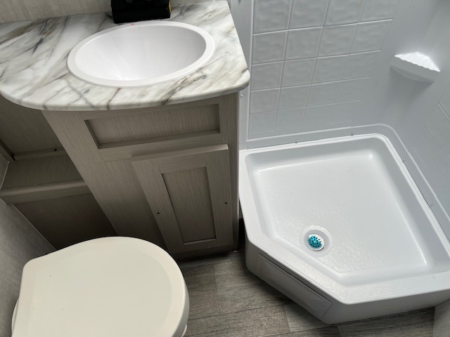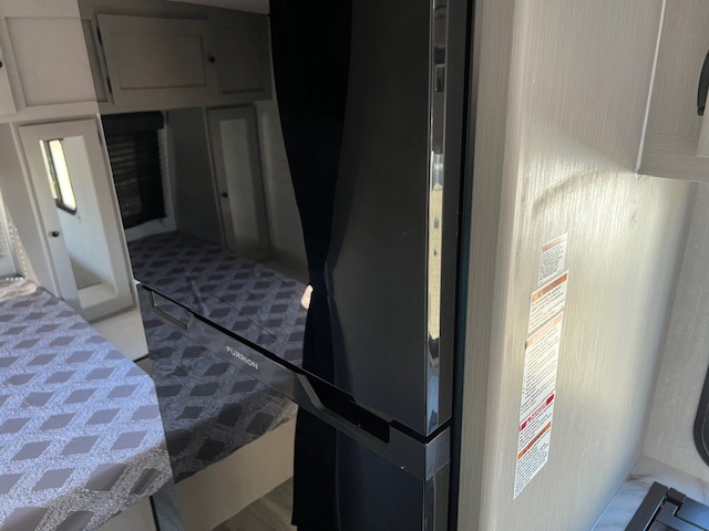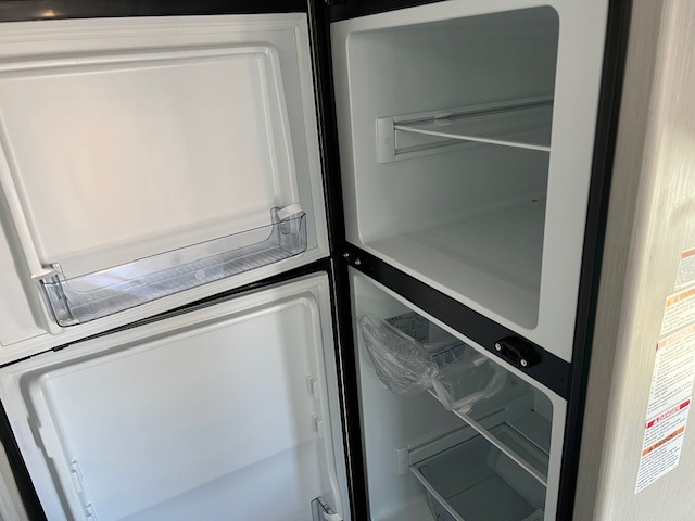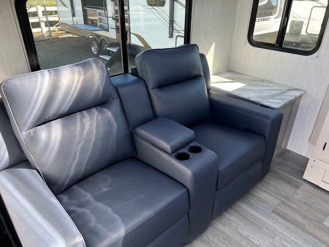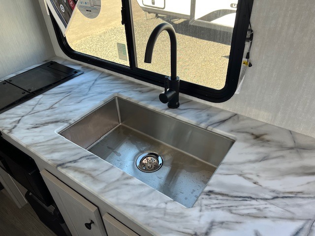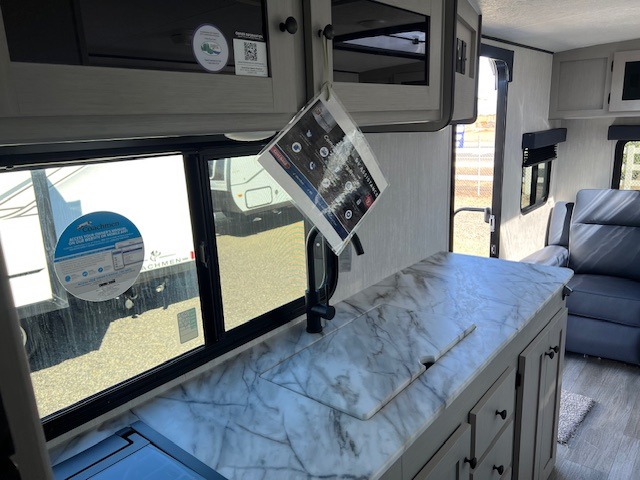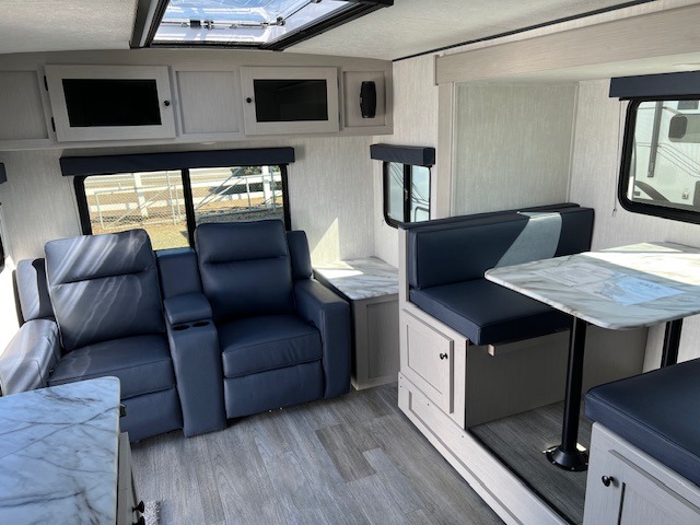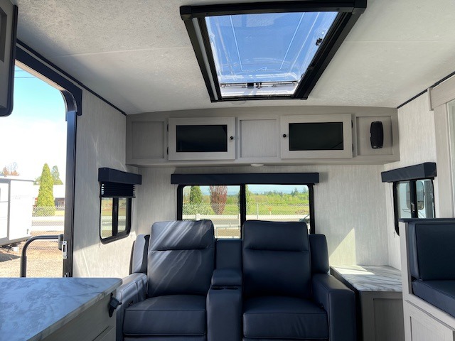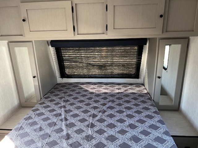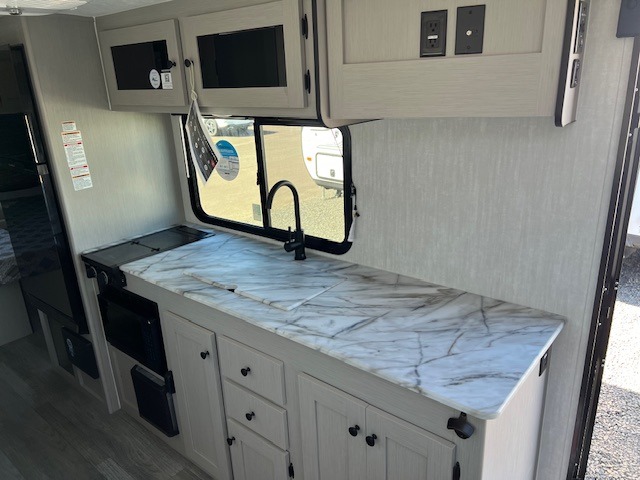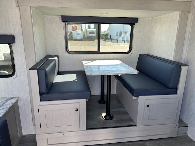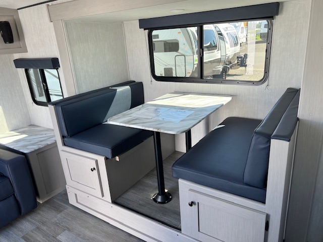 This is the perfect trailer for two, with additional sleeping space on the booth dinette! You can relax each evening on the rear theater seating that includes an end table to set your drink on, and there is a digital TV antenna if you want to add your own television to the entertainment center. It will be so easy to make meals on the flush-mount two burner cooktop or in the microwave oven, and there is an 8 cu. ft. 12V refrigerator for perishables. A full bath lets you freshen up after a day outdoors, and the queen bed in the front bedroom is sure to bring a great night's rest. There are also dual wardrobes on either side of the bed to keep your clothes neat and clean. Head outside to enjoy cooking on the cast iron griddle with a sidewall prep bar, and the power awning will provide much wanted shade during the day plus cozy lighting at night!