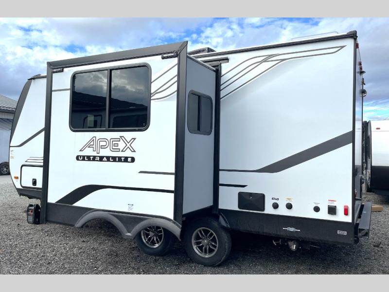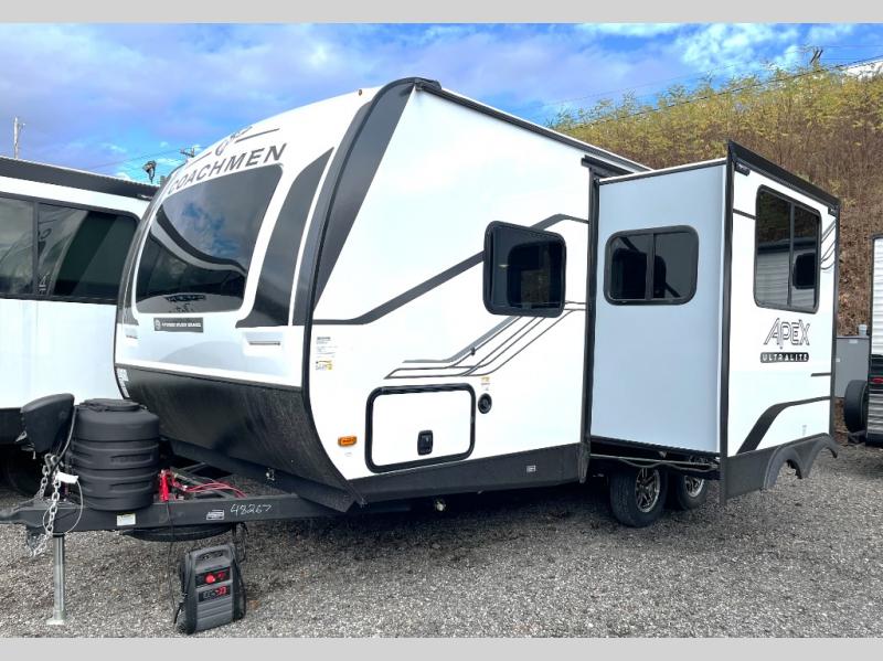 Lightweight living and camping is found with the Apex Ultra-Lite travel trailers by Coachmen. These eco-friendly units are made to last thanks to the Azdel composite sidewalls, the laminated aluminum floor, and the vacuum-bonded laminated crowned roof. Easy lube axles make towing easier than ever, plus there is a friction hinge entrance door, a 200-watt solar panel with a 30 Amp control charger, and slam latch baggage door catches for easy unloading. Some of the interior comforts you'll fall in love with are the one-piece seamless edge countertops, the hard valances with night shades, the matte black hardware, and the Casino Bisque cabinetry. The Apex Ultra-Lite trailers also include a USB charge station, plus a digital TV antenna with cable hook-ups and Wi-Fi capability for the option to stay connected as you camp!