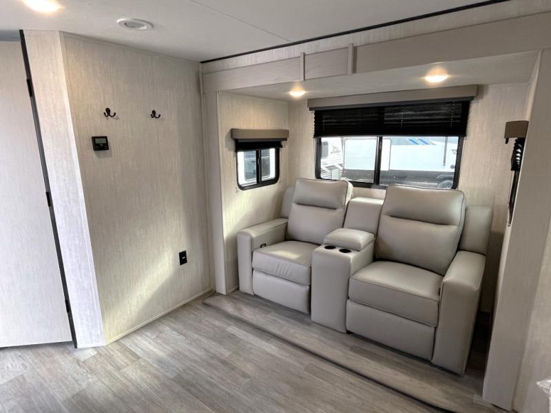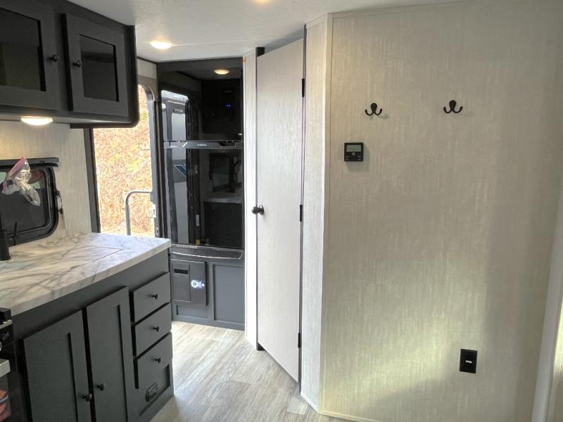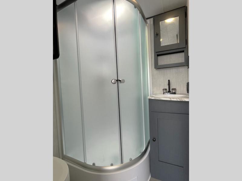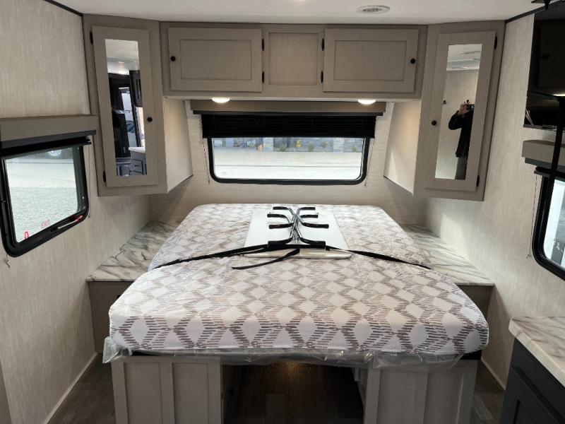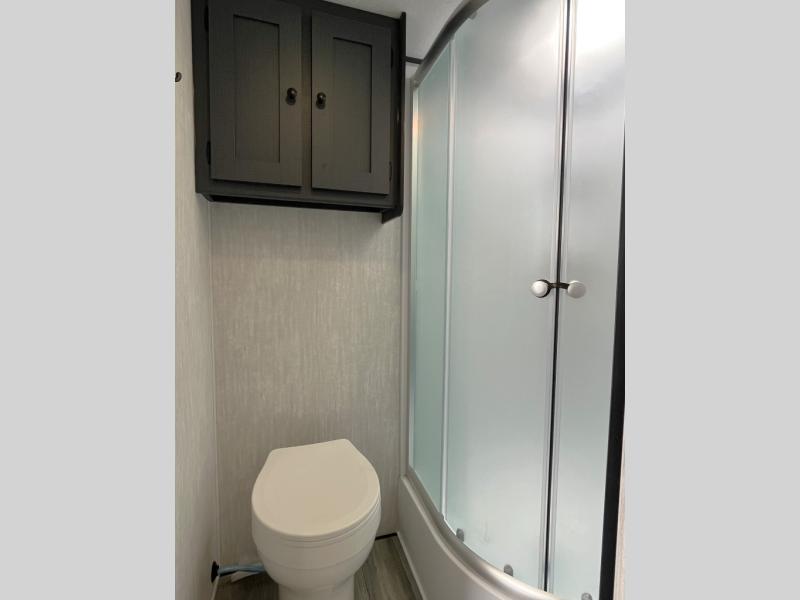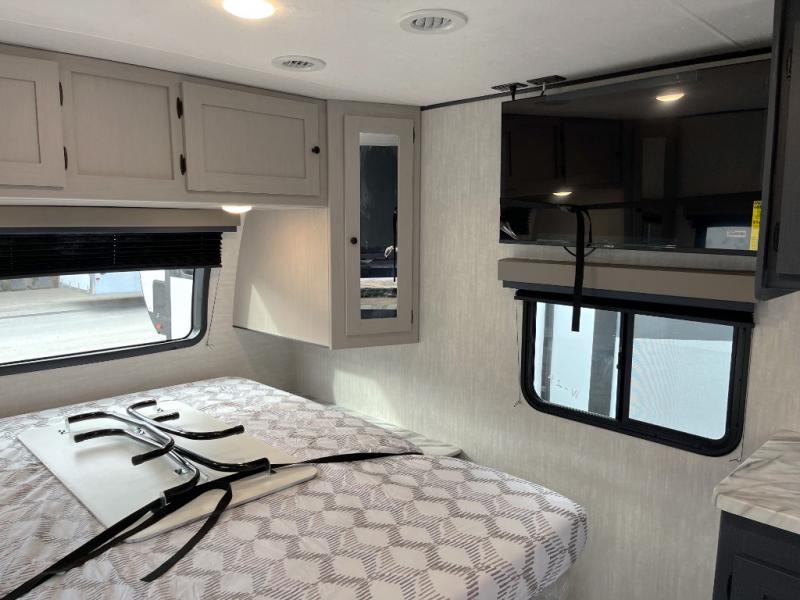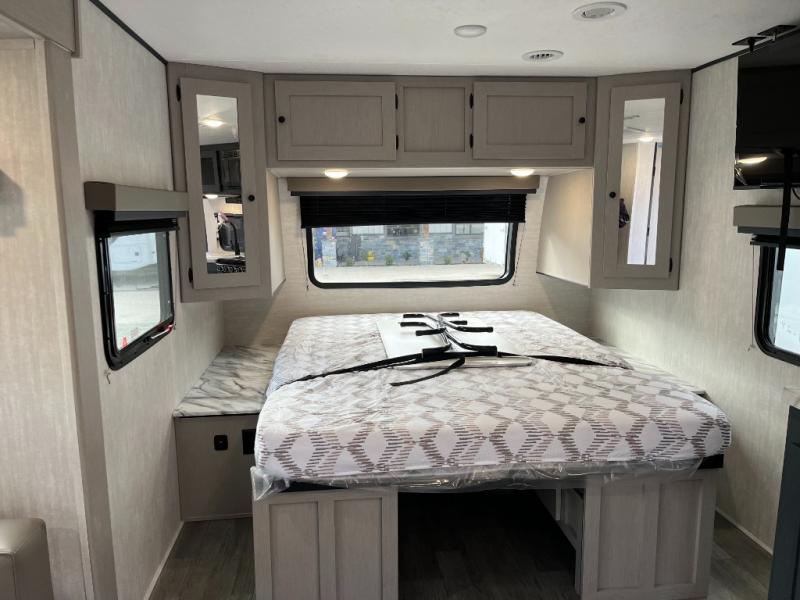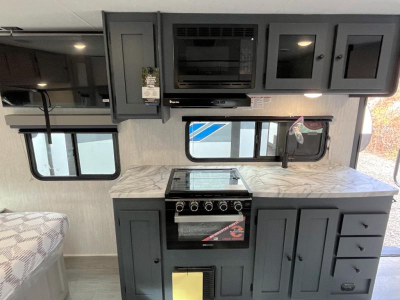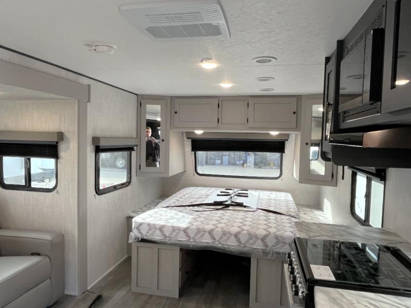 You'll love camping in this single slide out travel trailer. There is a front queen bed with dual wardrobes and nightstands to keep your space tidy, plus there is a free-standing table in front of the bed where you can play a game or dine together. A three burner cooktop and air fryer will let you make meals each day, and the 8 cu. ft. 12V refrigerator can hold your perishables. But you may just find yourself cooking outdoors on the exterior griddle under the power awning!