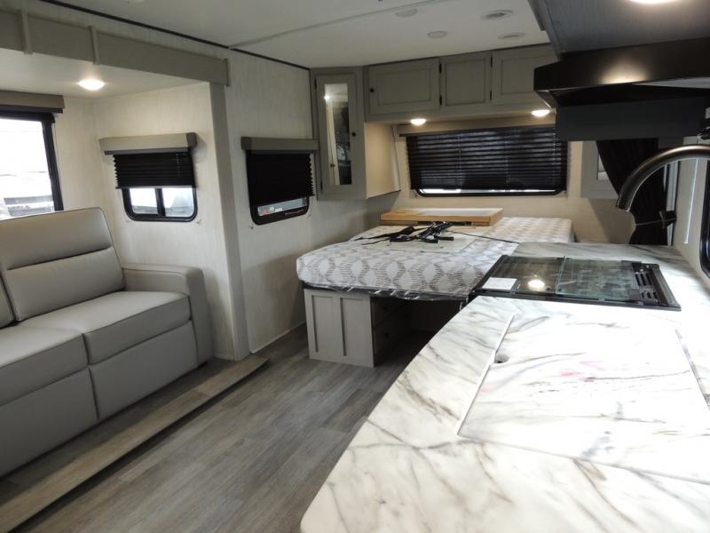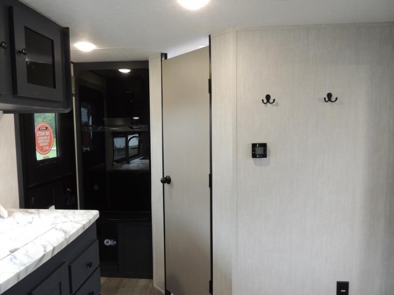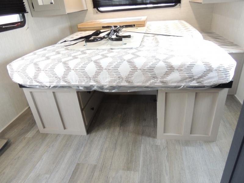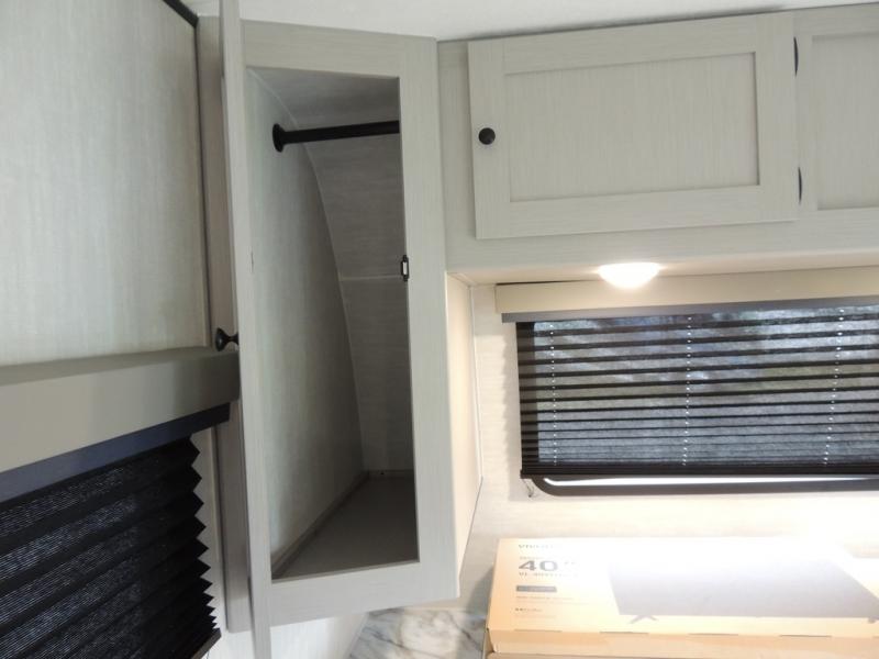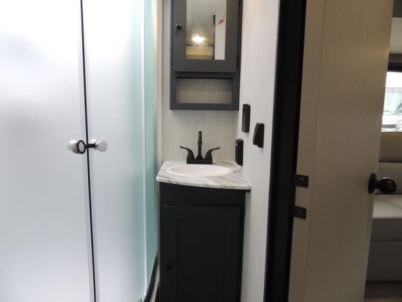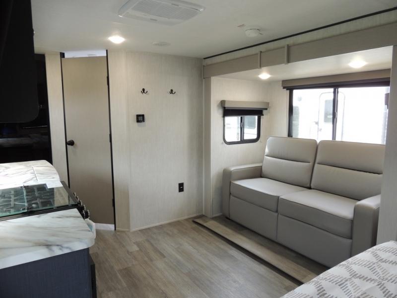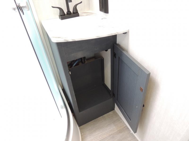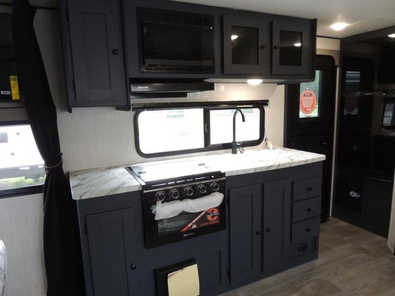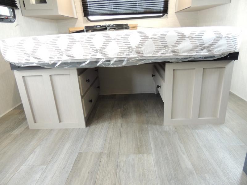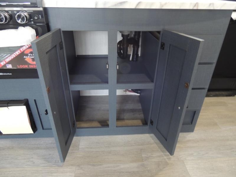 You'll love camping in this single slide out travel trailer. There is a front queen bed with dual wardrobes and nightstands to keep your space tidy, plus there is a free-standing table in front of the bed where you can play a game or dine together. A three burner cooktop and air fryer will let you make meals each day, and the 8 cu. ft. 12V refrigerator can hold your perishables. But you may just find yourself cooking outdoors on the exterior griddle under the power awning!