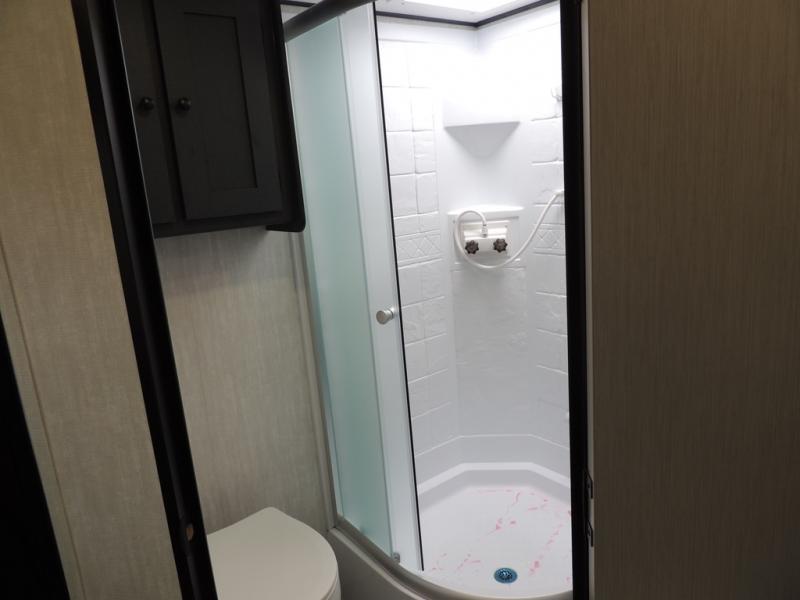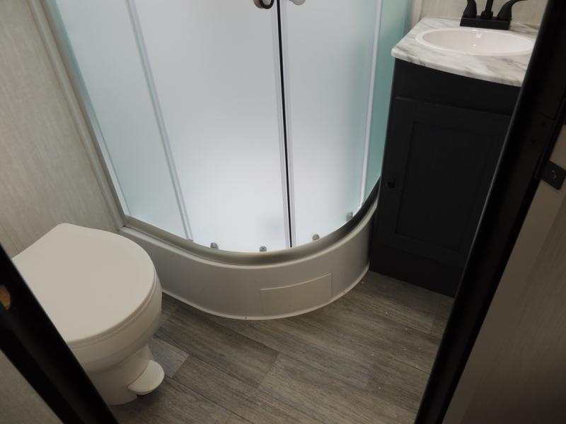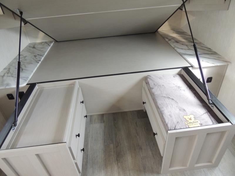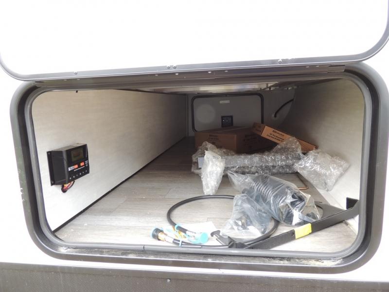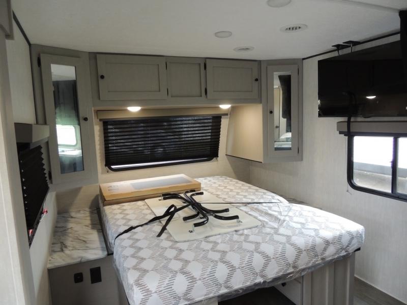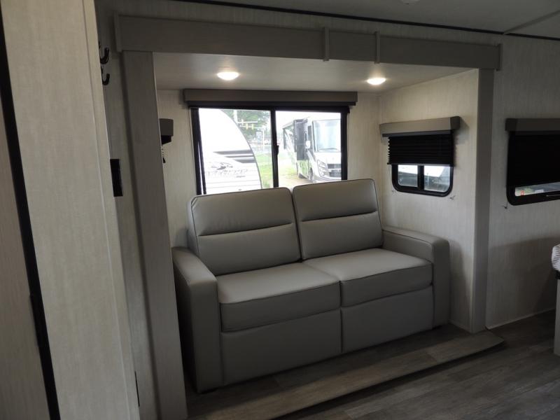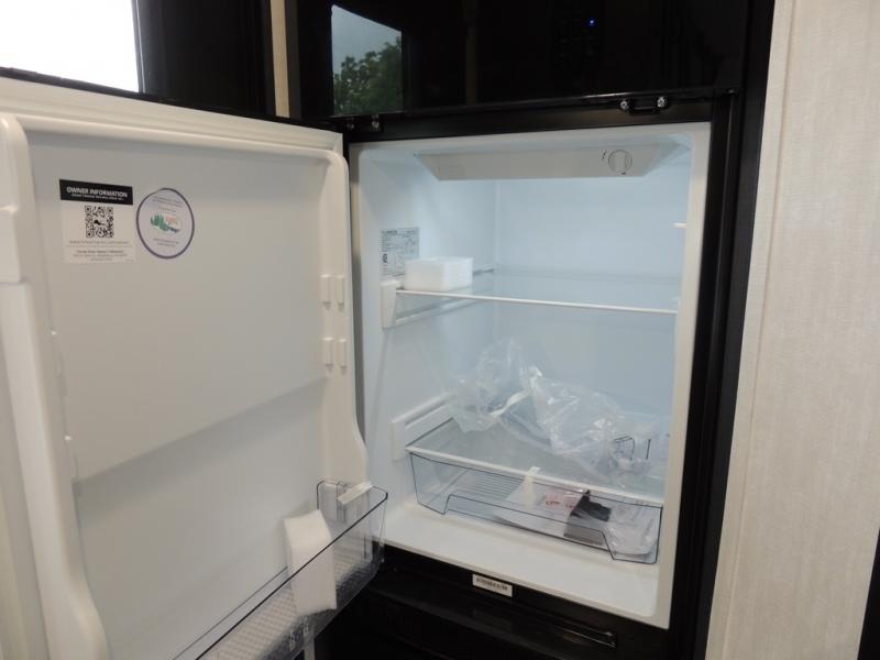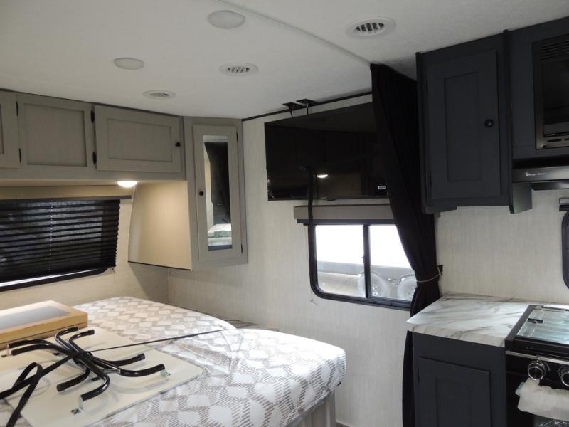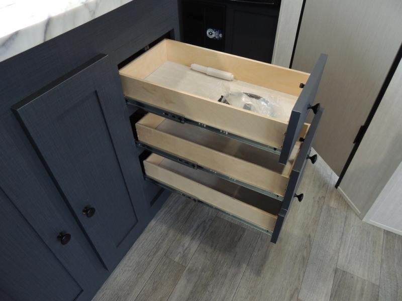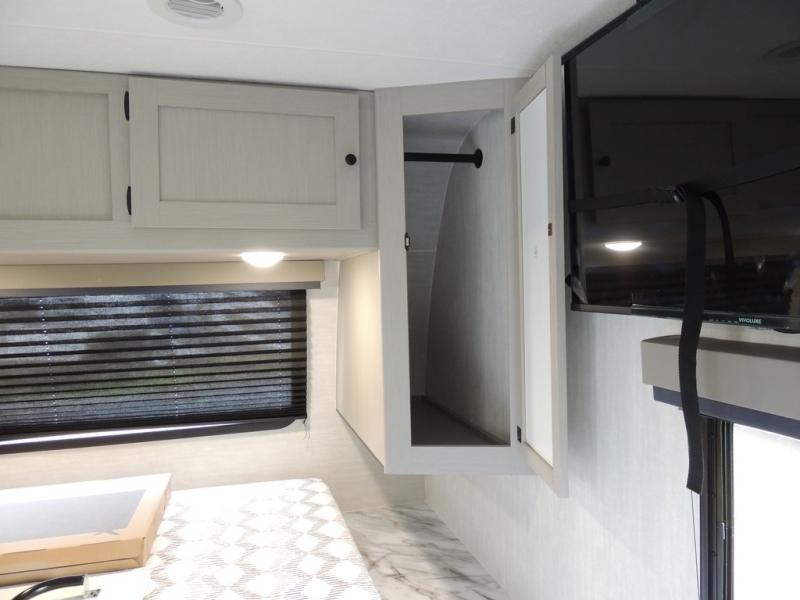 You'll love camping in this single slide out travel trailer. There is a front queen bed with dual wardrobes and nightstands to keep your space tidy, plus there is a free-standing table in front of the bed where you can play a game or dine together. A three burner cooktop and air fryer will let you make meals each day, and the 8 cu. ft. 12V refrigerator can hold your perishables. But you may just find yourself cooking outdoors on the exterior griddle under the power awning!