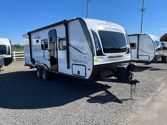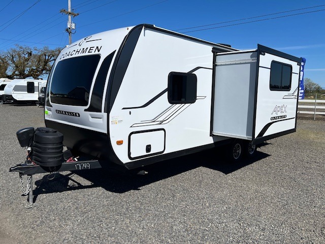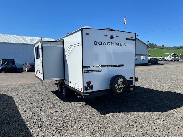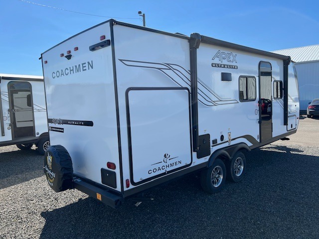 Lightweight living and camping is found with the Apex Ultra-Lite travel trailers by Coachmen. These eco-friendly units are made to last thanks to the Azdel composite sidewalls, the laminated aluminum floor, and the vacuum-bonded laminated crowned roof. Easy lube axles make towing easier than ever, plus there is a friction hinge entrance door, a 200-watt solar panel with a 30 Amp control charger, and slam latch baggage door catches for easy unloading. Some of the interior comforts you'll fall in love with are the one-piece seamless edge countertops, the hard valances with night shades, the matte black hardware, and the Casino Bisque cabinetry. The Apex Ultra-Lite trailers also include a USB charge station, plus a digital TV antenna with cable hook-ups and Wi-Fi capability for the option to stay connected as you camp!