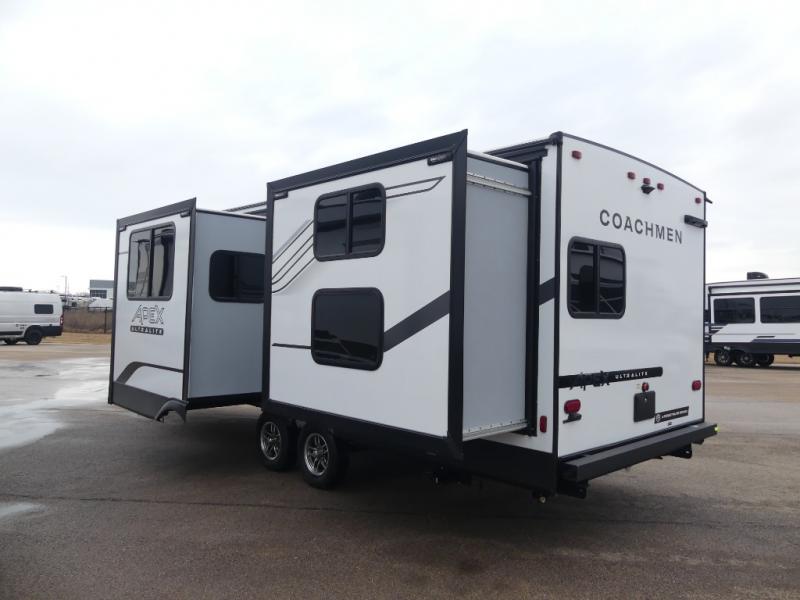 Lightweight living and camping is found with the Apex Ultra-Lite travel trailers by Coachmen. These eco-friendly units are made to last thanks to the Azdel composite sidewalls, the laminated aluminum floor, and the vacuum-bonded laminated crowned roof. Easy lube axles make towing easier than ever, plus there is a friction hinge entrance door, a 200-watt solar panel with a 30 Amp control charger, and slam latch baggage door catches for easy unloading. Some of the interior comforts you'll fall in love with are the one-piece seamless edge countertops, the hard valances with night shades, the matte black hardware, and the Casino Bisque cabinetry. The Apex Ultra-Lite trailers also include a USB charge station, plus a digital TV antenna with cable hook-ups and Wi-Fi capability for the option to stay connected as you camp!