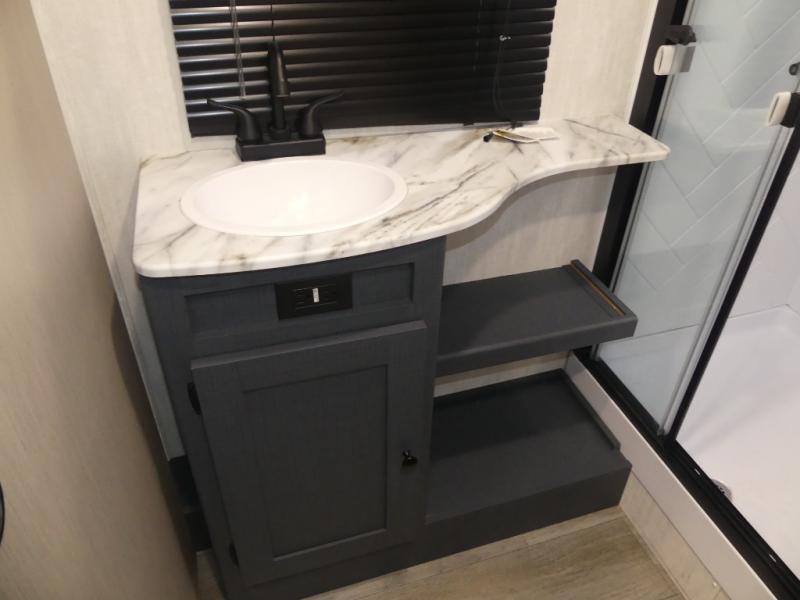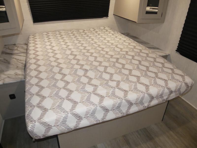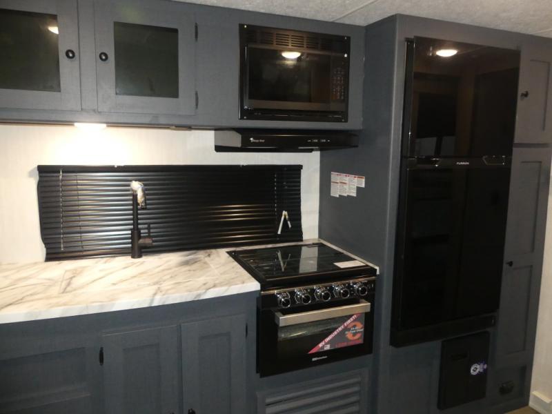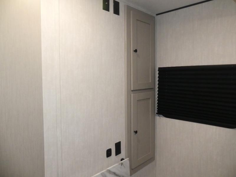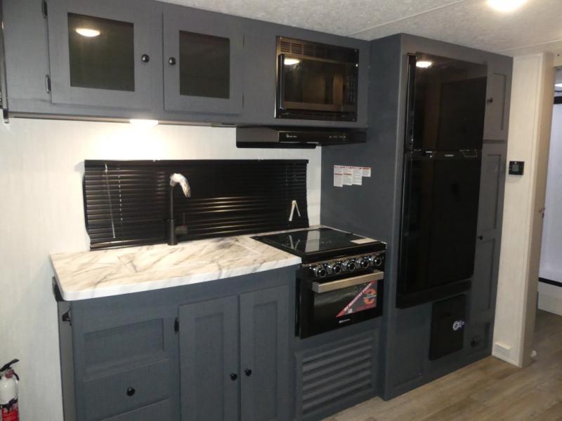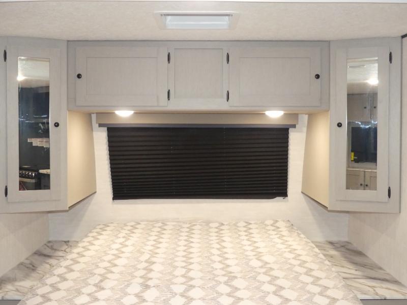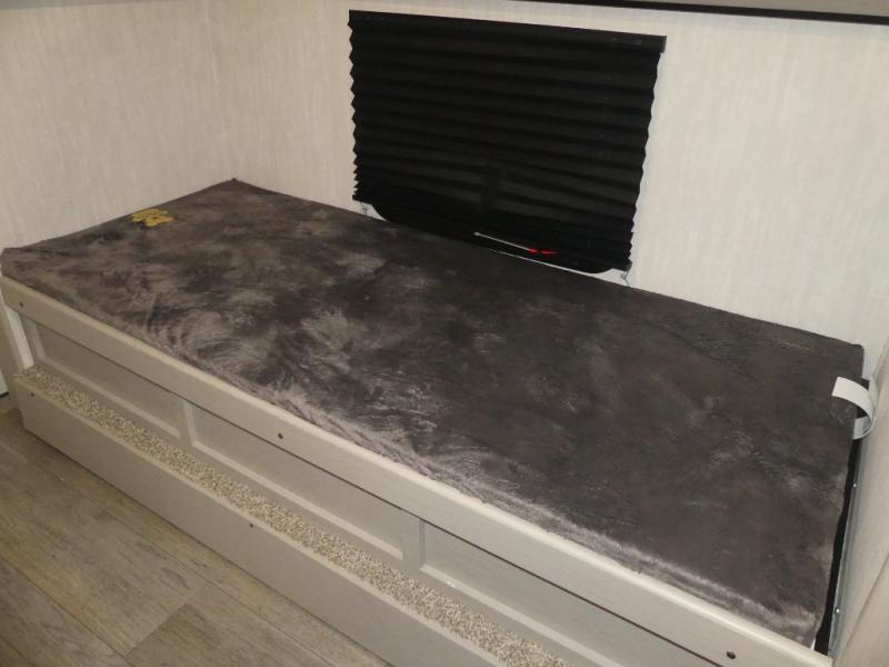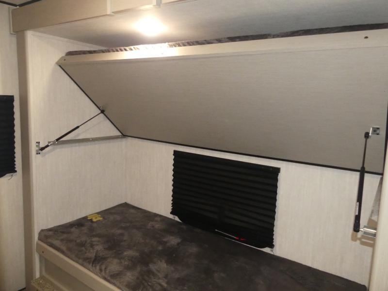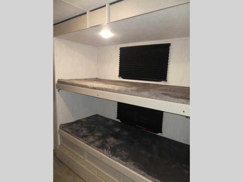 The whole gang will love weekend stays at the campground in this double slide out trailer! The little ones or your guests can take the rear corner bunkhouse that includes flip-up bunks. You'll have the queen bed with super storage up front all to yourselves, and the dual wardrobes plus overhead cabinet will help keep your space tidy. The chef of your group will have a three burner cooktop and an air fryer to cook meals, and there is a booth dinette with a table for dining space. In the evening, you can stay in to watch a movie LED Smart TV, or head outdoors to relax under the power awning.