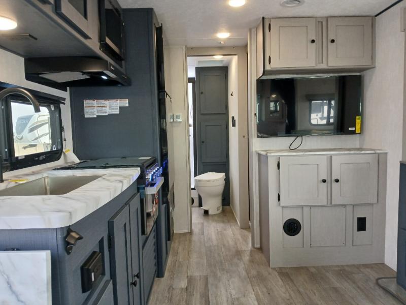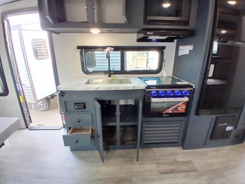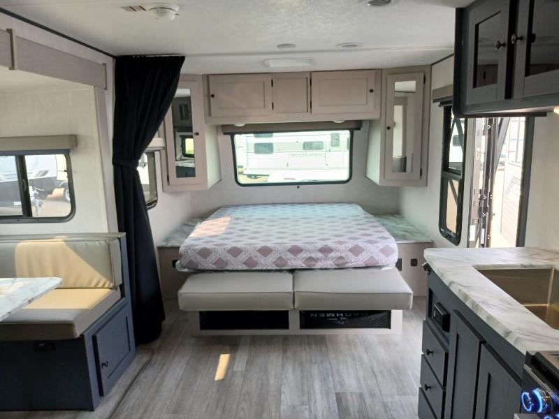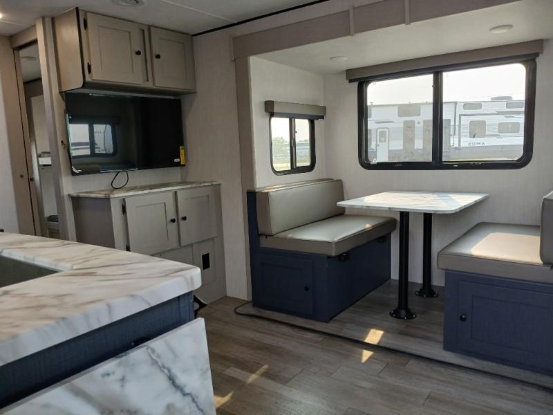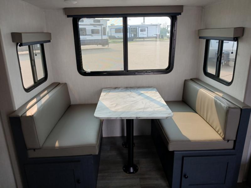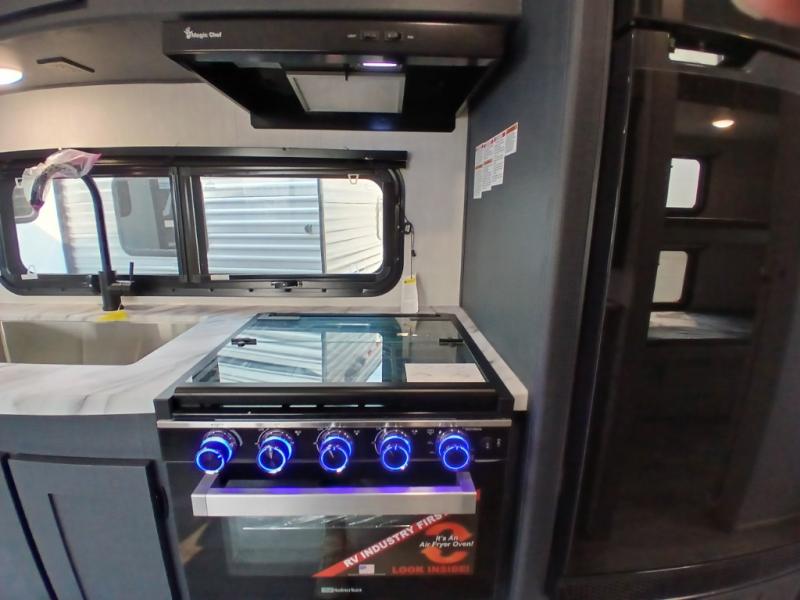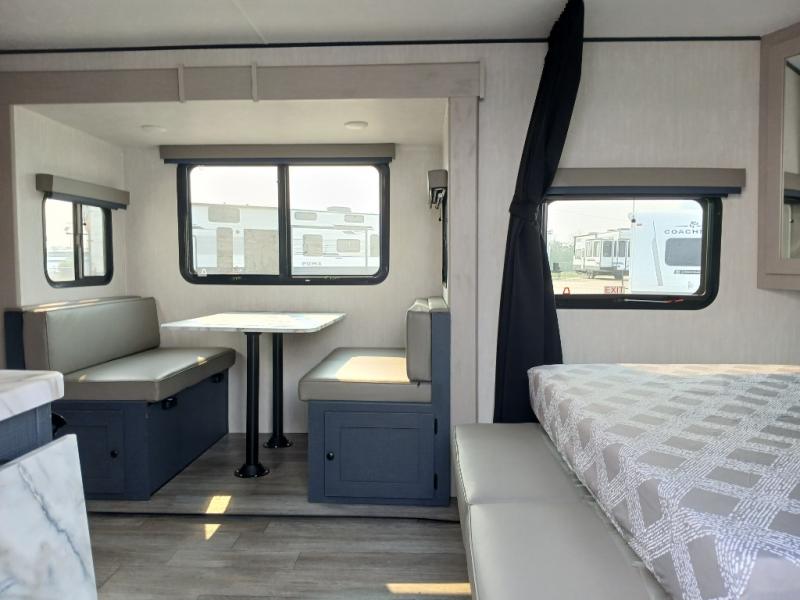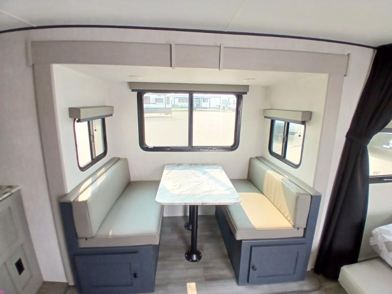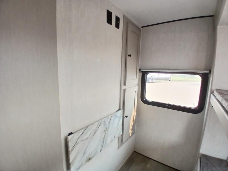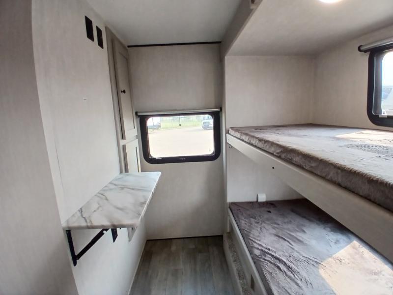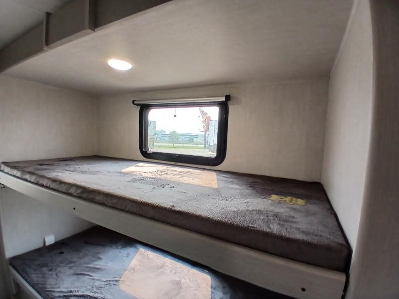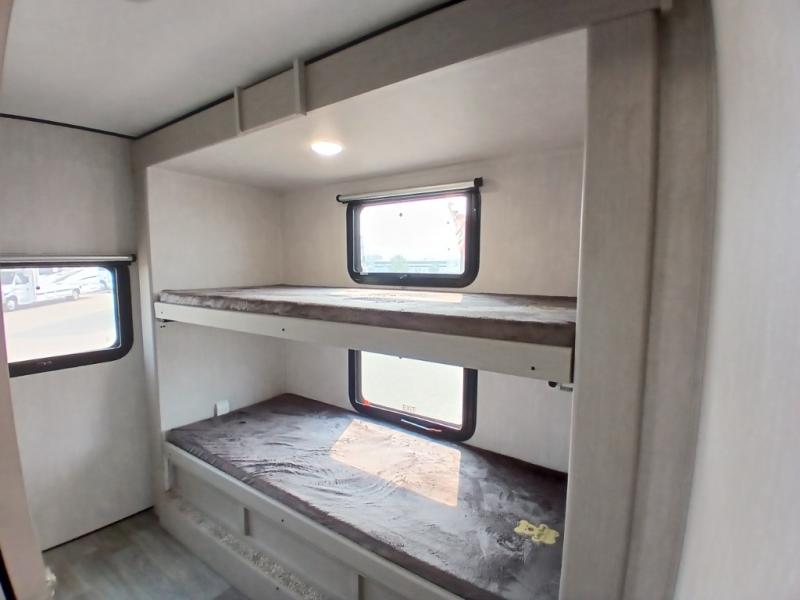 The whole gang will love weekend stays at the campground in this double slide out trailer! The little ones or your guests can take the rear corner bunkhouse that includes flip-up bunks. You'll have the queen bed with super storage up front all to yourselves, and the dual wardrobes plus overhead cabinet will help keep your space tidy. The chef of your group will have a three burner cooktop and an air fryer to cook meals, and there is a booth dinette with a table for dining space. In the evening, you can stay in to watch a movie LED Smart TV, or head outdoors to relax under the power awning.