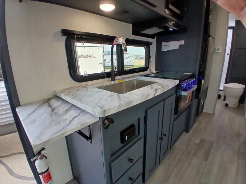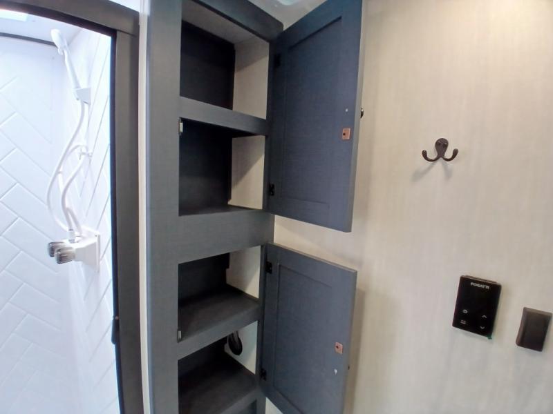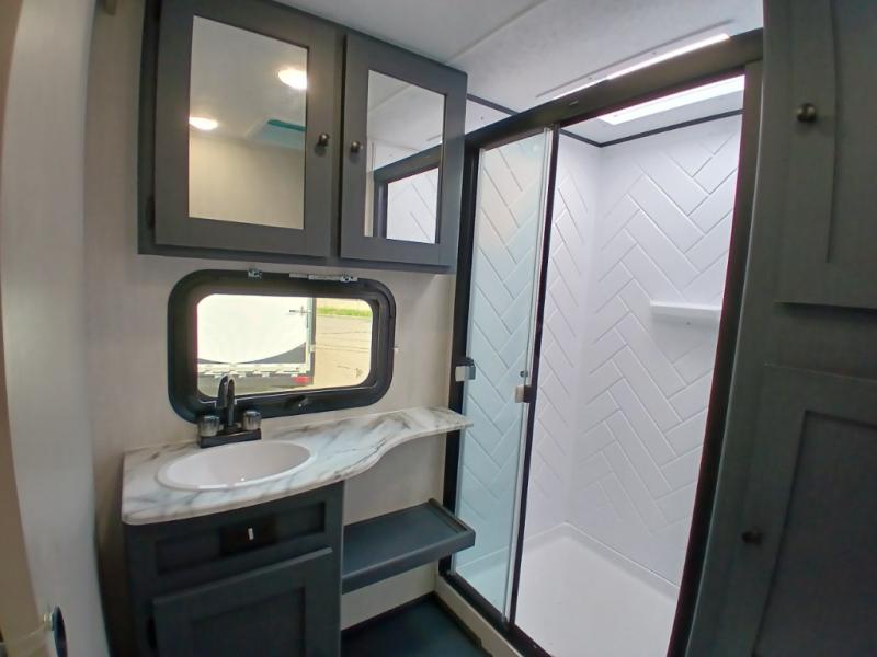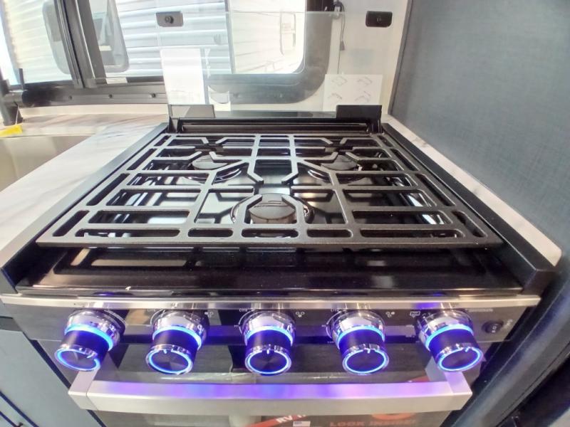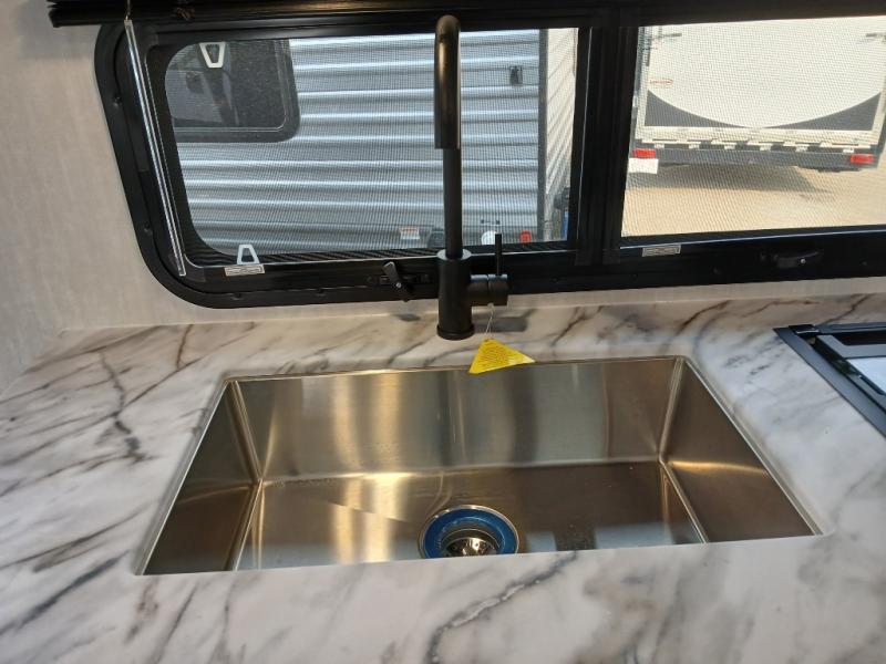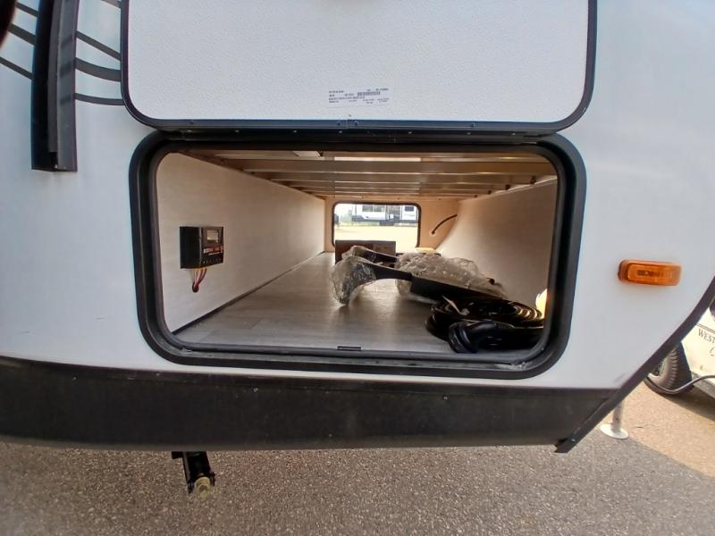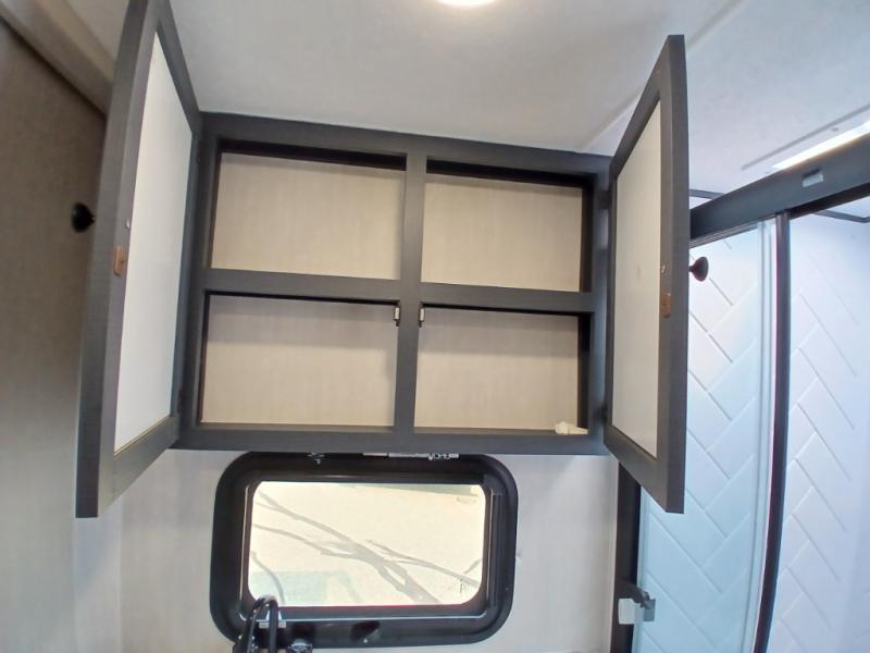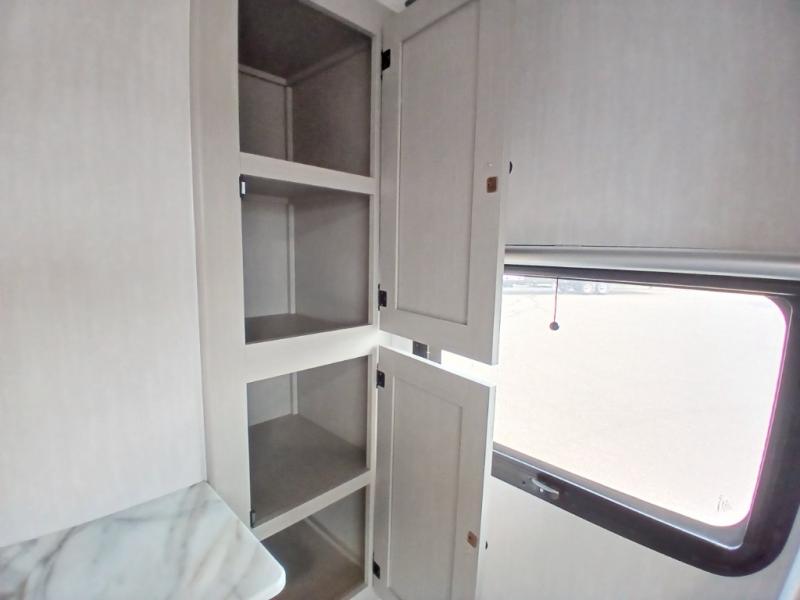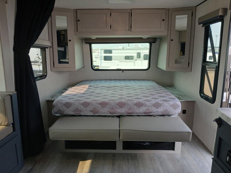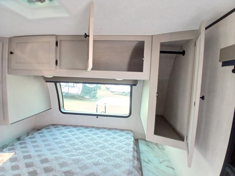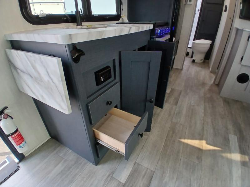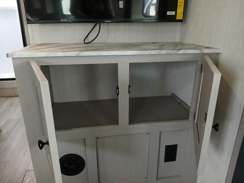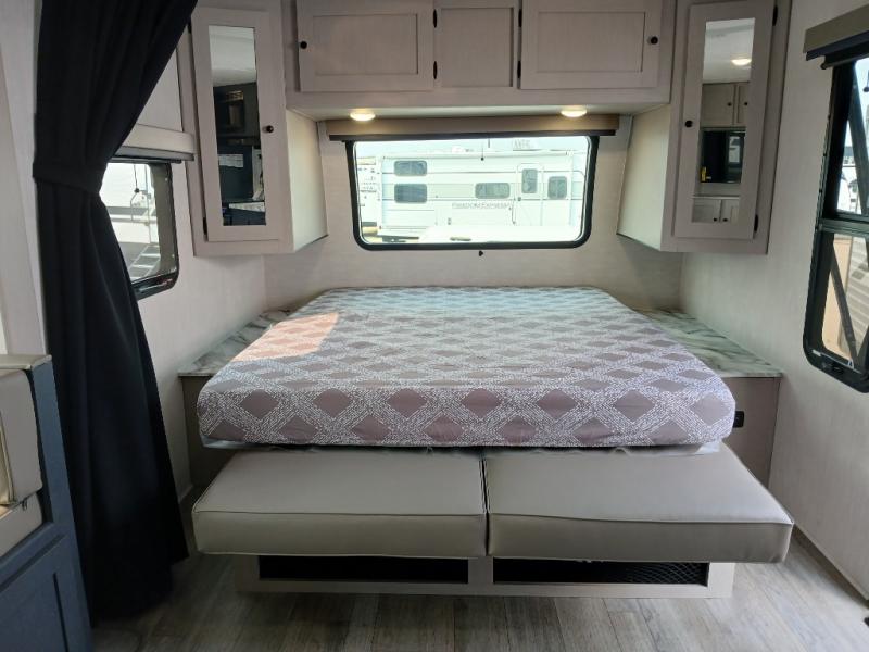 The whole gang will love weekend stays at the campground in this double slide out trailer! The little ones or your guests can take the rear corner bunkhouse that includes flip-up bunks. You'll have the queen bed with super storage up front all to yourselves, and the dual wardrobes plus overhead cabinet will help keep your space tidy. The chef of your group will have a three burner cooktop and an air fryer to cook meals, and there is a booth dinette with a table for dining space. In the evening, you can stay in to watch a movie LED Smart TV, or head outdoors to relax under the power awning.