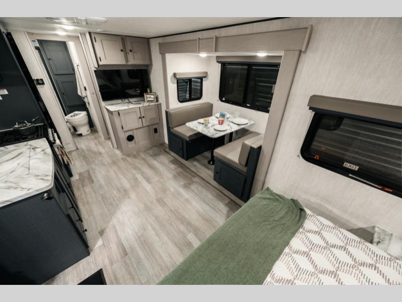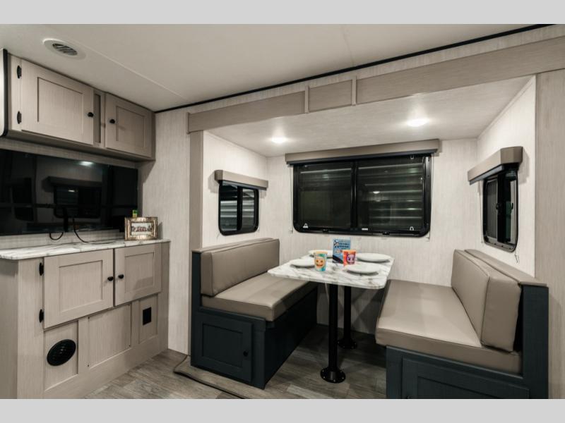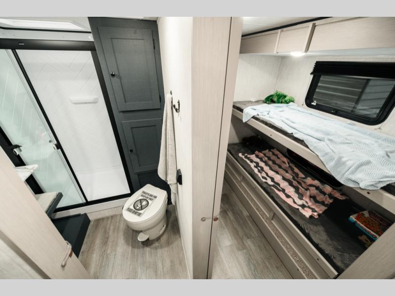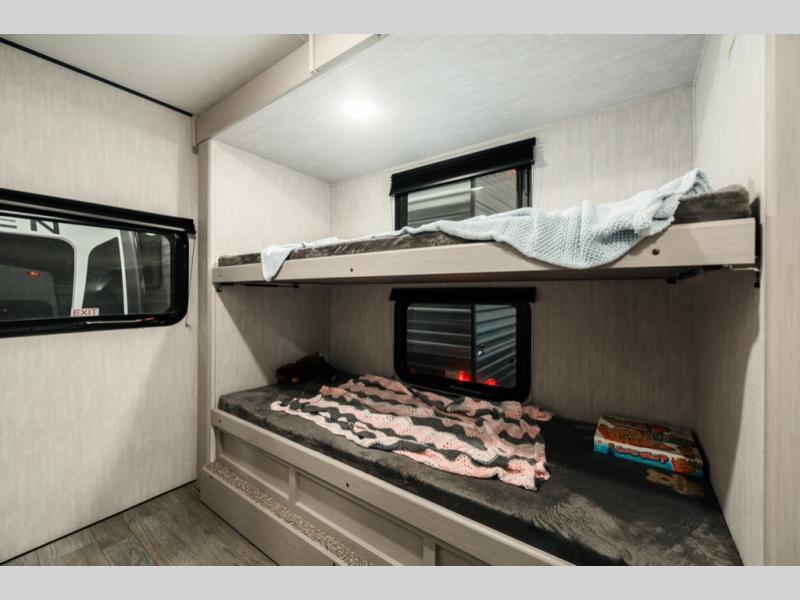 The whole gang will love weekend stays at the campground in this double slide out trailer! The little ones or your guests can take the rear corner bunkhouse that includes flip-up bunks. You'll have the queen bed with super storage up front all to yourselves, and the dual wardrobes plus overhead cabinet will help keep your space tidy. The chef of your group will have a three burner cooktop and an air fryer to cook meals, and there is a booth dinette with a table for dining space. In the evening, you can stay in to watch a movie LED Smart TV, or head outdoors to relax under the power awning.