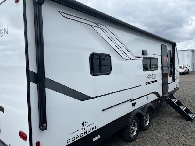 Lightweight living and camping is found with the Apex Ultra-Lite travel trailers by Coachmen. These eco-friendly units are made to last thanks to the Azdel composite sidewalls, the laminated aluminum floor, and the vacuum-bonded laminated crowned roof. Easy lube axles make towing easier than ever, plus there is a friction hinge entrance door, a 200-watt solar panel with a 30 Amp control charger, and slam latch baggage door catches for easy unloading. Some of the interior comforts you'll fall in love with are the one-piece seamless edge countertops, the hard valances with night shades, the matte black hardware, and the Casino Bisque cabinetry. The Apex Ultra-Lite trailers also include a USB charge station, plus a digital TV antenna with cable hook-ups and Wi-Fi capability for the option to stay connected as you camp!