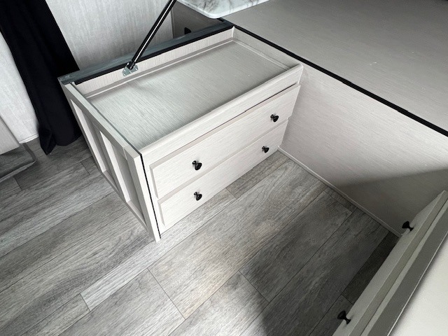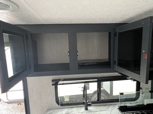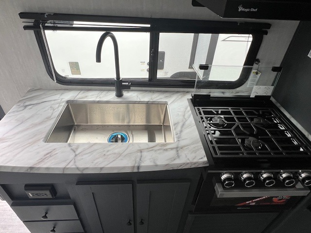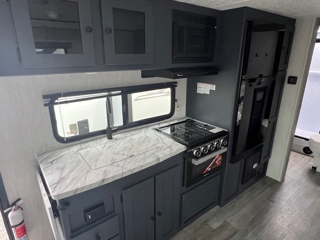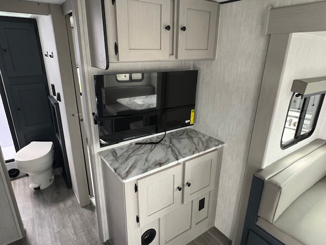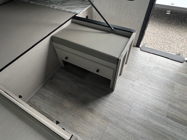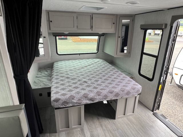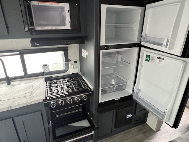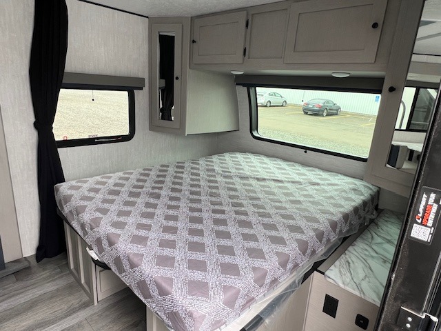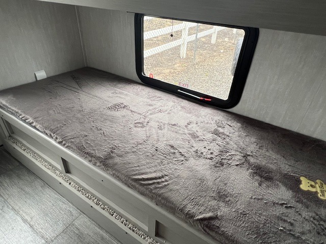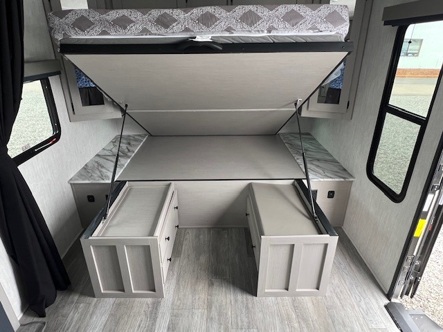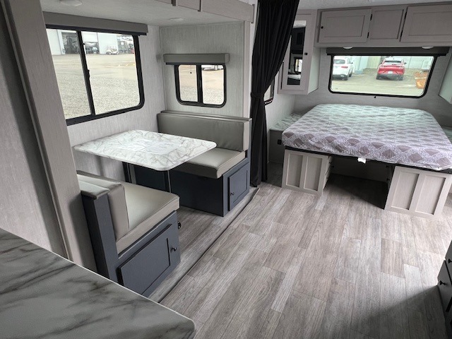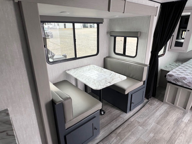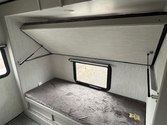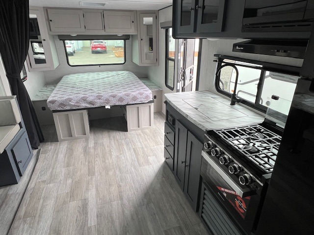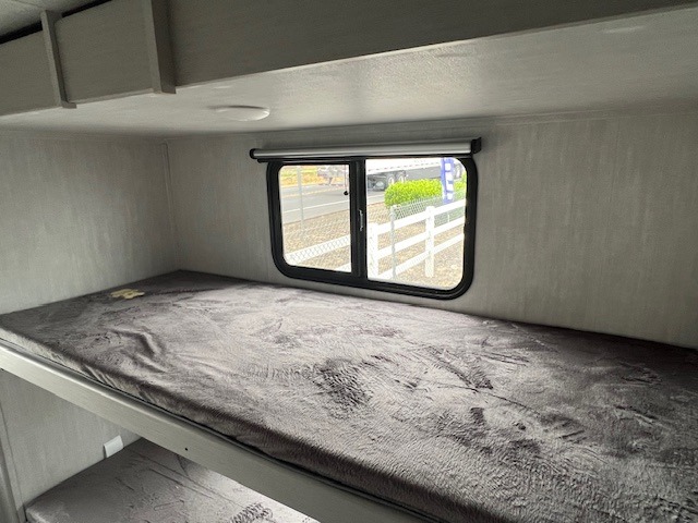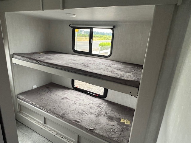 The whole gang will love weekend stays at the campground in this double slide out trailer! The little ones or your guests can take the rear corner bunkhouse that includes flip-up bunks. You'll have the queen bed with super storage up front all to yourselves, and the dual wardrobes plus overhead cabinet will help keep your space tidy. The chef of your group will have a three burner cooktop and an air fryer to cook meals, and there is a booth dinette with a table for dining space. In the evening, you can stay in to watch a movie LED Smart TV, or head outdoors to relax under the power awning.