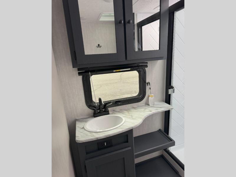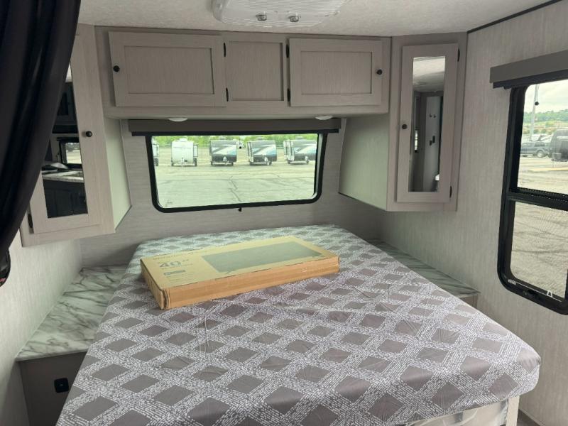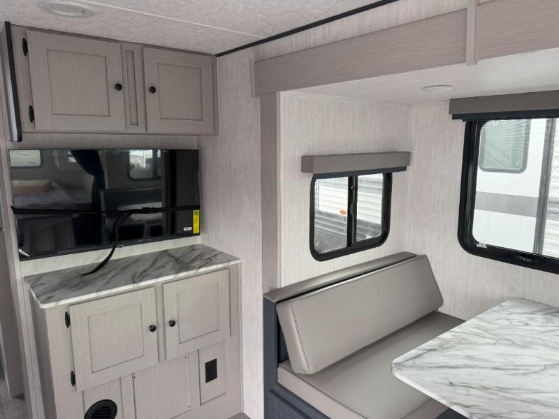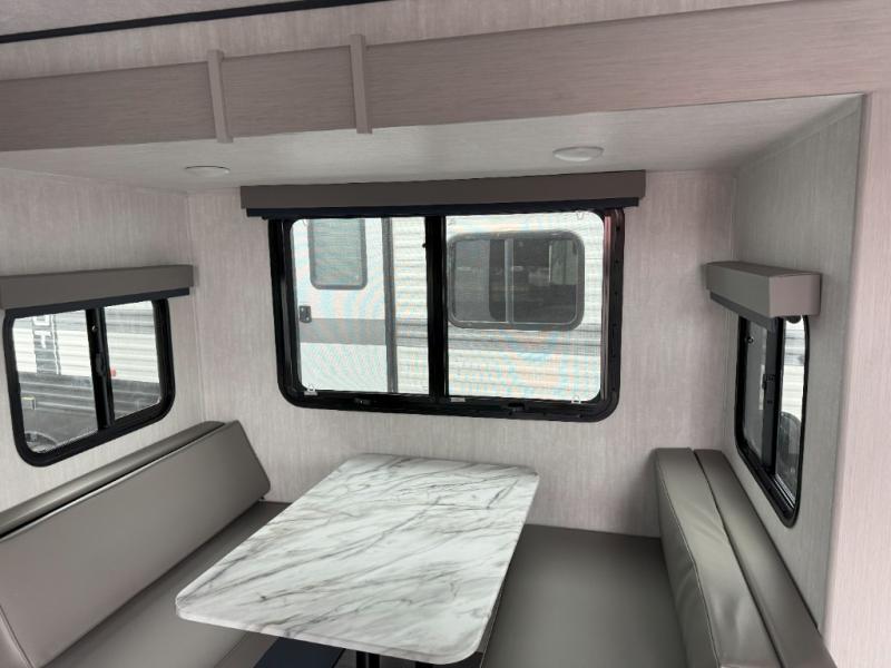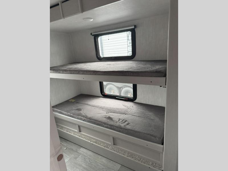 The whole gang will love weekend stays at the campground in this double slide out trailer! The little ones or your guests can take the rear corner bunkhouse that includes flip-up bunks. You'll have the queen bed with super storage up front all to yourselves, and the dual wardrobes plus overhead cabinet will help keep your space tidy. The chef of your group will have a three burner cooktop and an air fryer to cook meals, and there is a booth dinette with a table for dining space. In the evening, you can stay in to watch a movie LED Smart TV, or head outdoors to relax under the power awning.