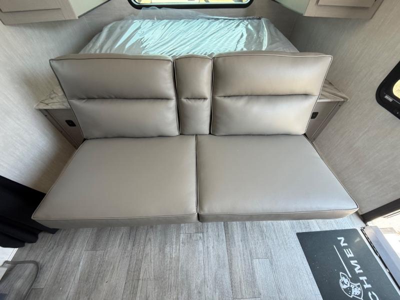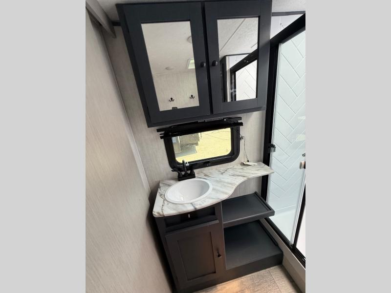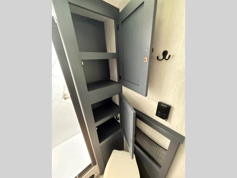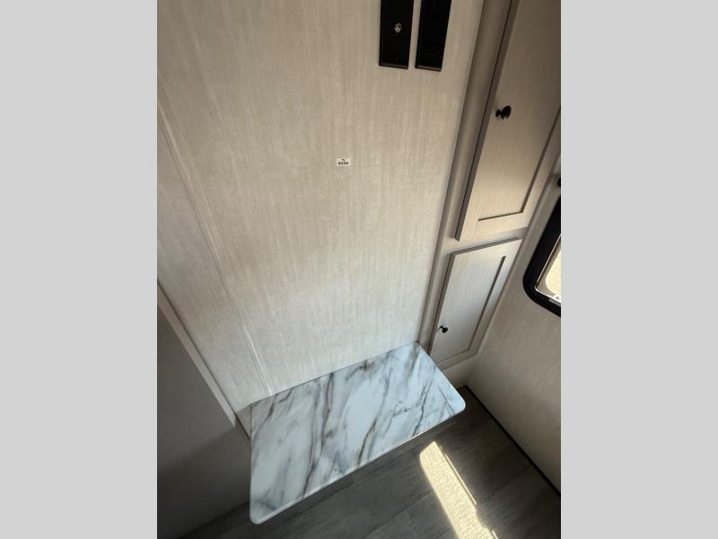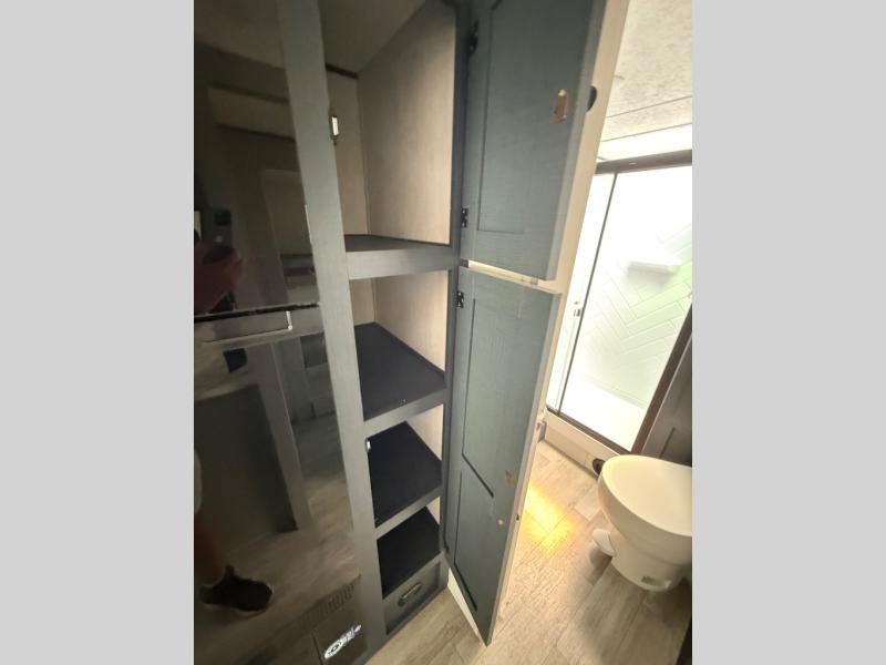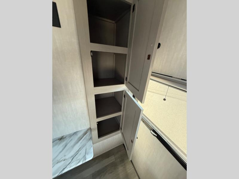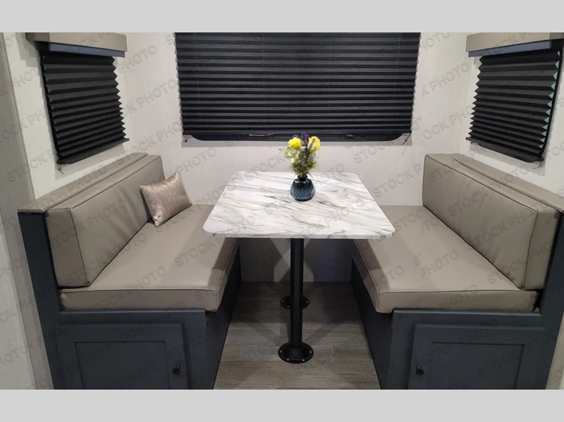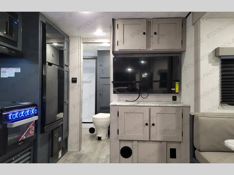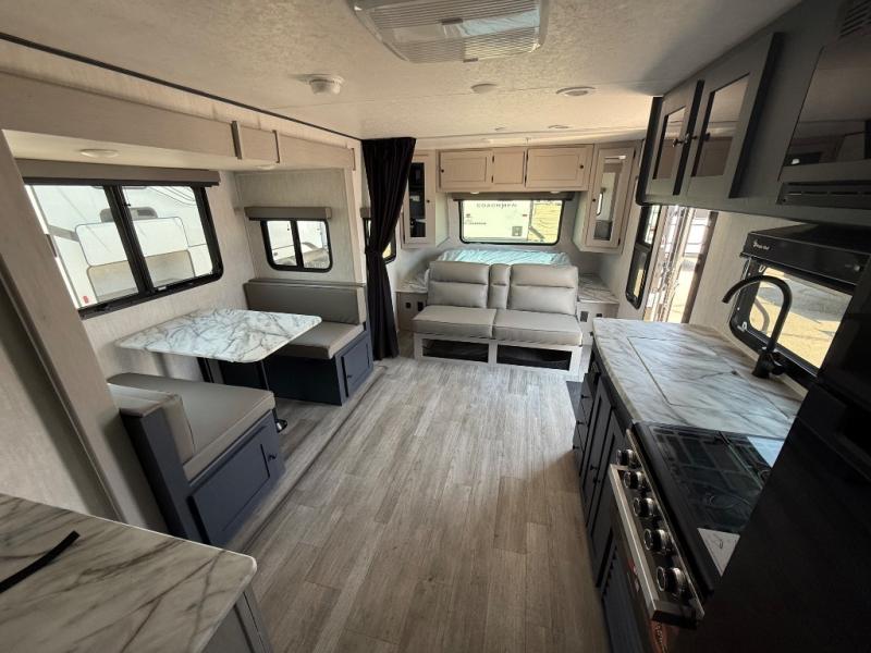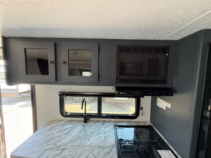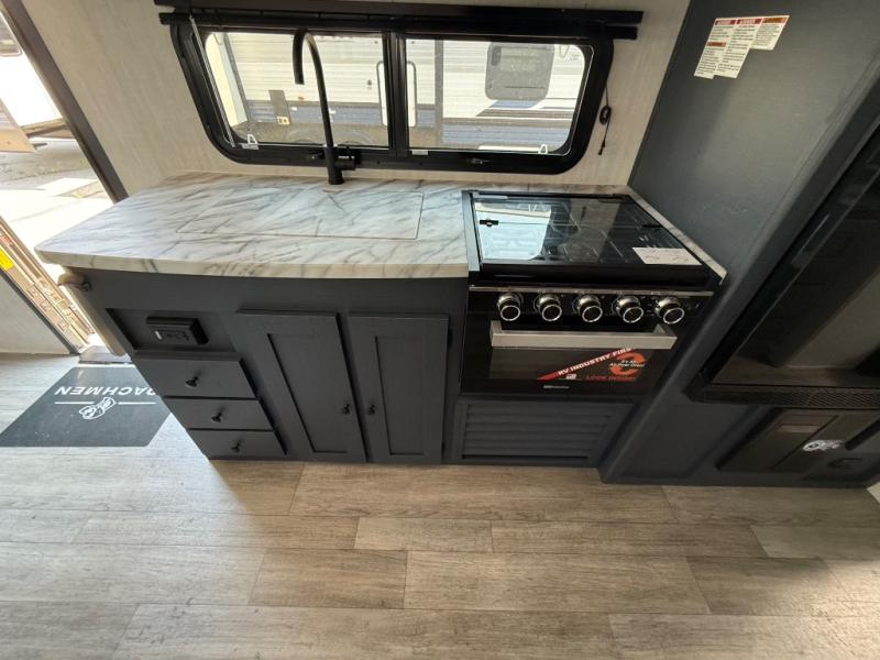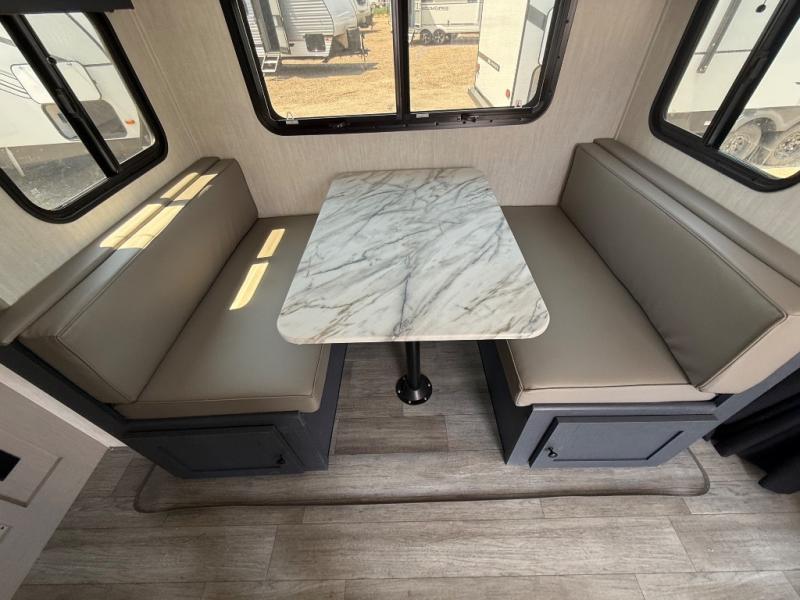 The whole gang will love weekend stays at the campground in this double slide out trailer! The little ones or your guests can take the rear corner bunkhouse that includes flip-up bunks. You'll have the queen bed with super storage up front all to yourselves, and the dual wardrobes plus overhead cabinet will help keep your space tidy. The chef of your group will have a three burner cooktop and an air fryer to cook meals, and there is a booth dinette with a table for dining space. In the evening, you can stay in to watch a movie LED Smart TV, or head outdoors to relax under the power awning.