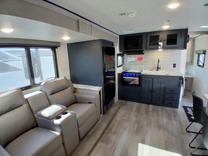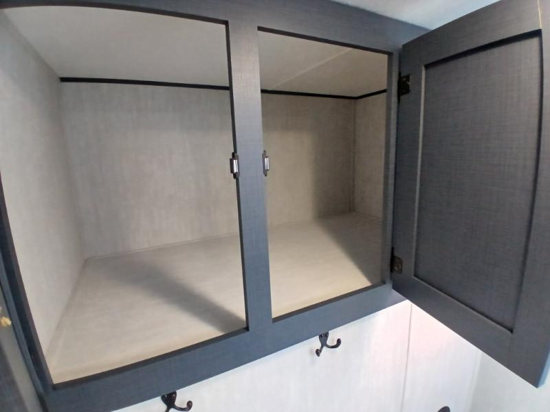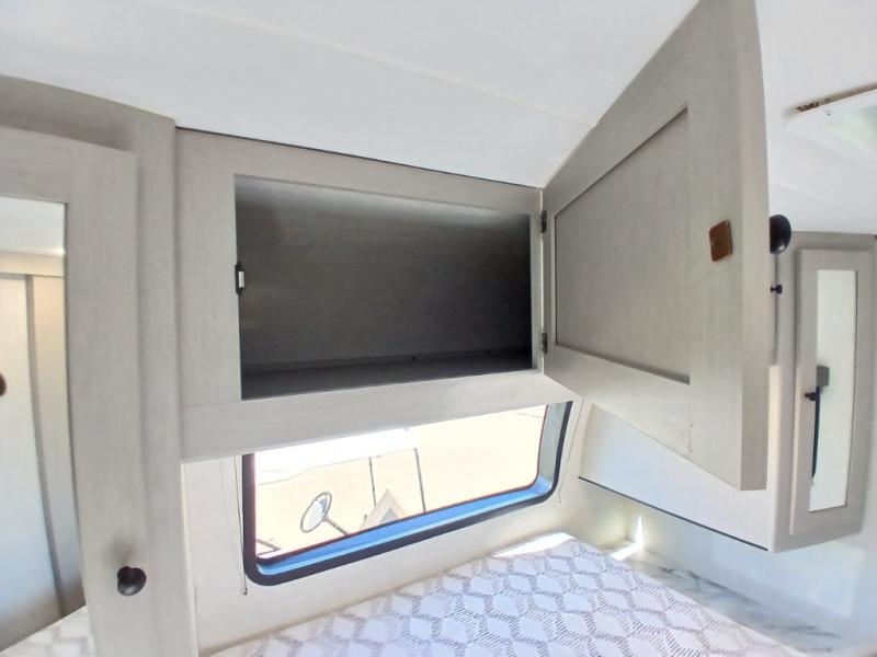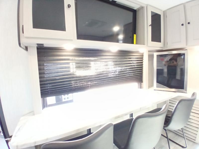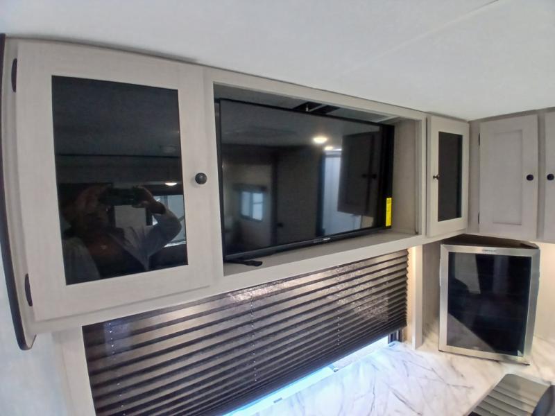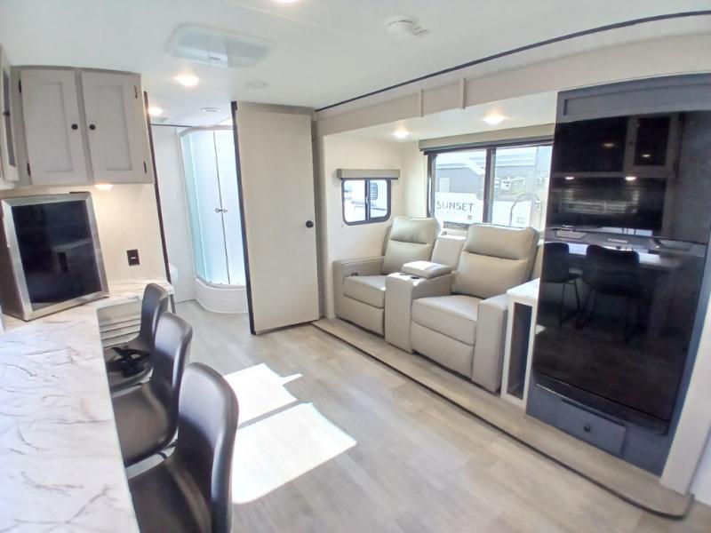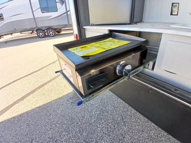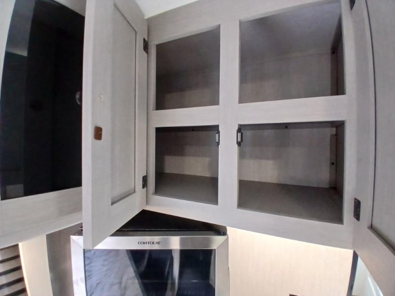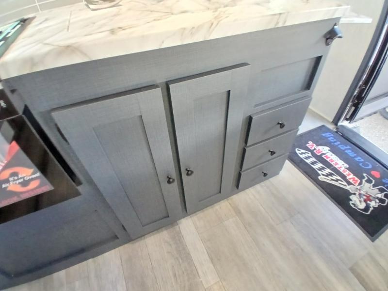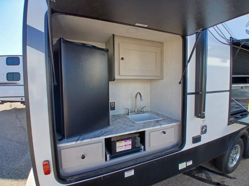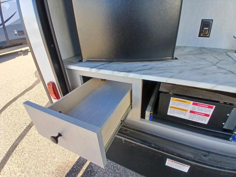 You will love this travel trailer front bedroom. Ideal for you and your partner, this bedroom is fitted with a 60x80 queen bed with super storage, dual wardrobes beside the bed and a over head cabinet. On the kitchen area you will find a 12V refrigerator, pantry, three burner cooktop and a bar countertop with stools, for have a nice drink on a hot day, in addition, you or your guests can rest on the 68" trifold sofa. Take a relaxing bath in the full bathroom furnished with 34" shower and overhead cabinets. You will also love the outdoor kitchen, perfect to have a meal while admiring nature.