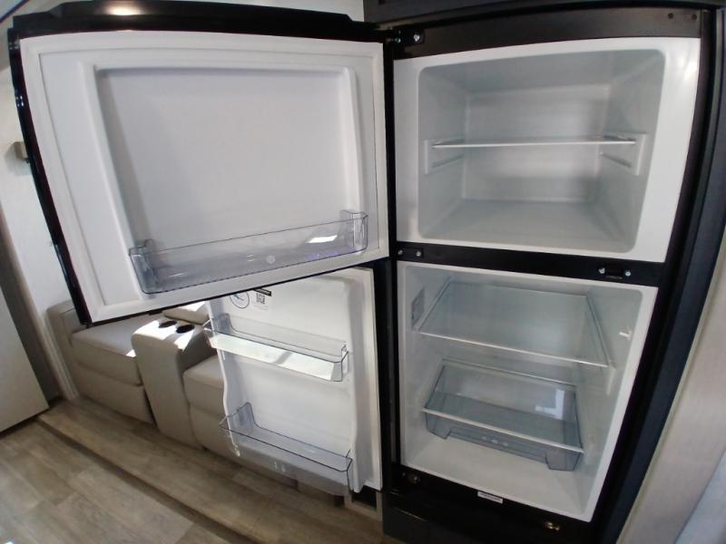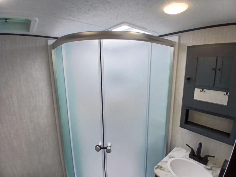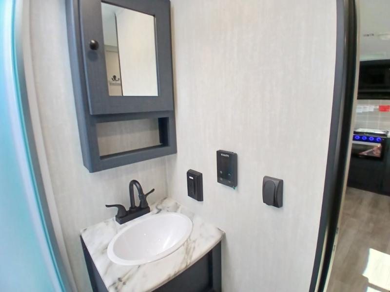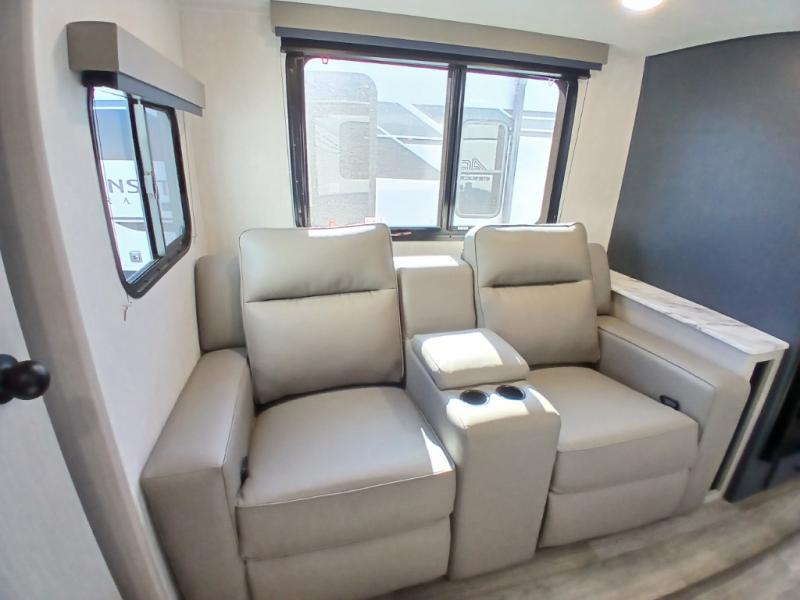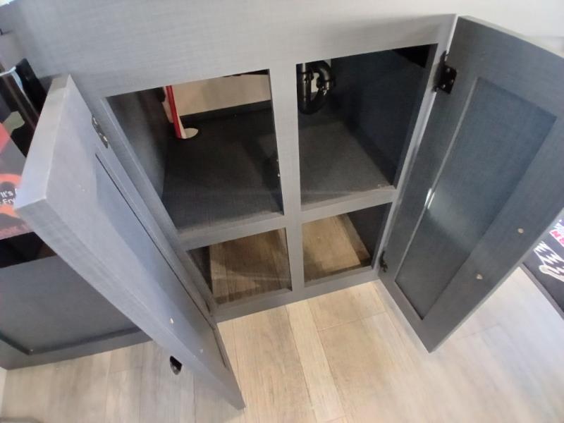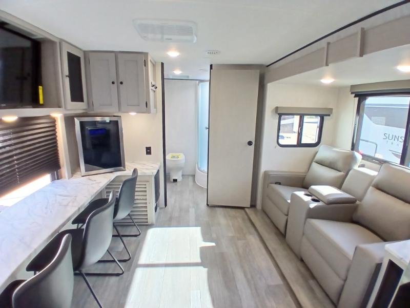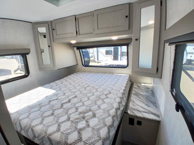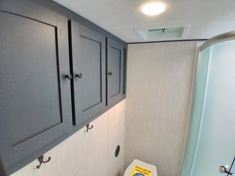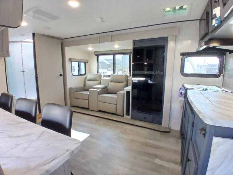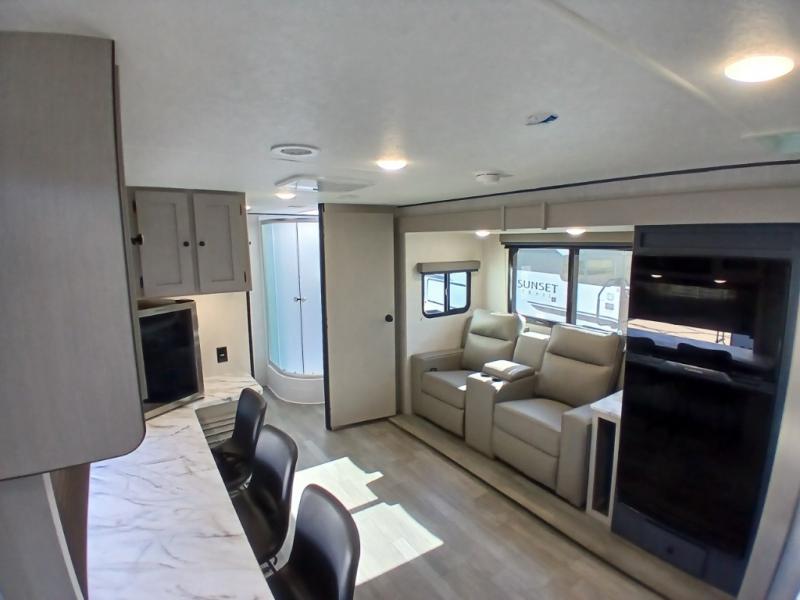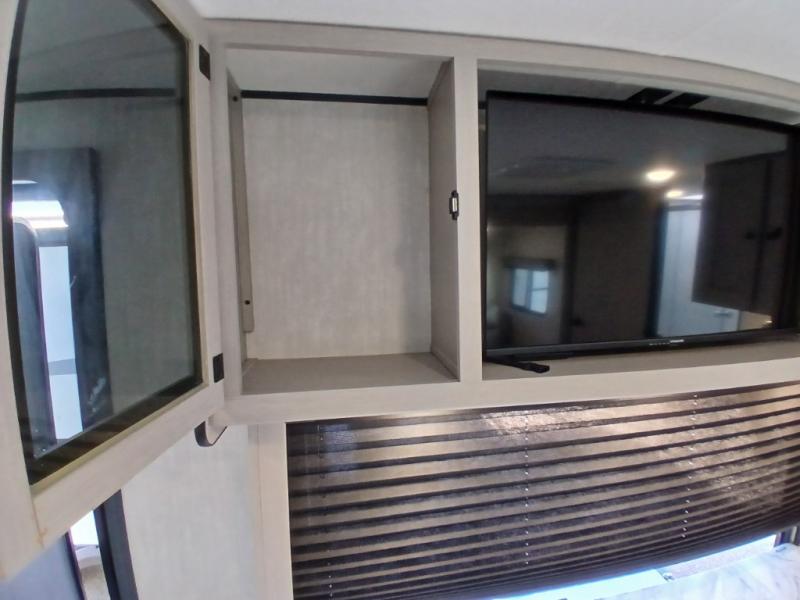 You will love this travel trailer front bedroom. Ideal for you and your partner, this bedroom is fitted with a 60x80 queen bed with super storage, dual wardrobes beside the bed and a over head cabinet. On the kitchen area you will find a 12V refrigerator, pantry, three burner cooktop and a bar countertop with stools, for have a nice drink on a hot day, in addition, you or your guests can rest on the 68" trifold sofa. Take a relaxing bath in the full bathroom furnished with 34" shower and overhead cabinets. You will also love the outdoor kitchen, perfect to have a meal while admiring nature.