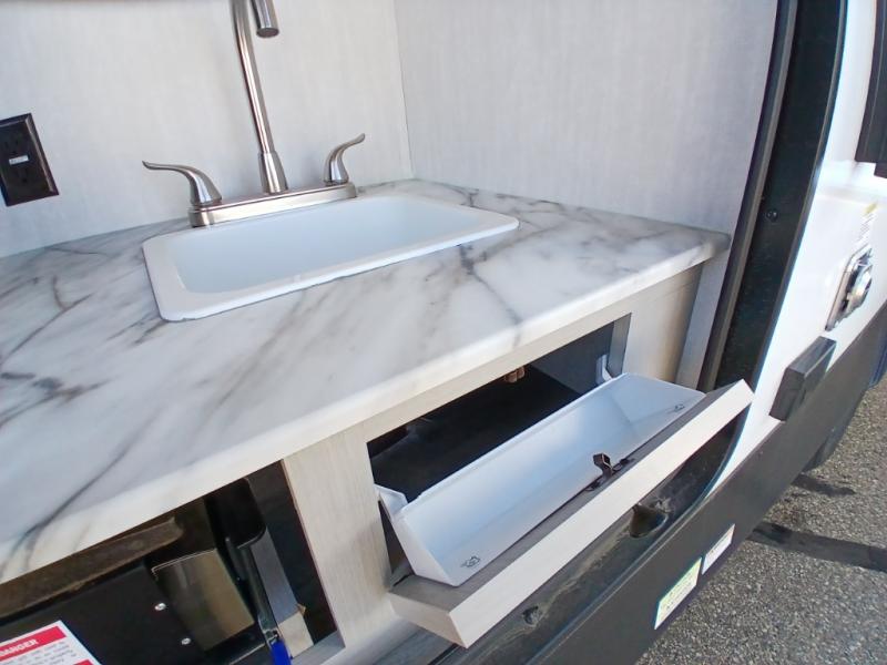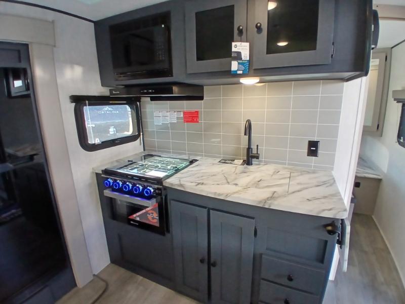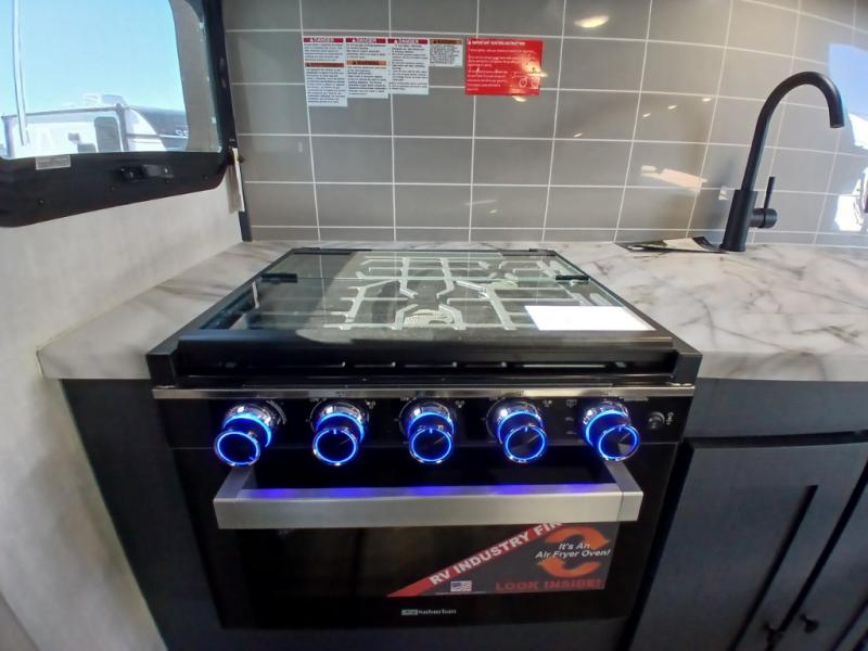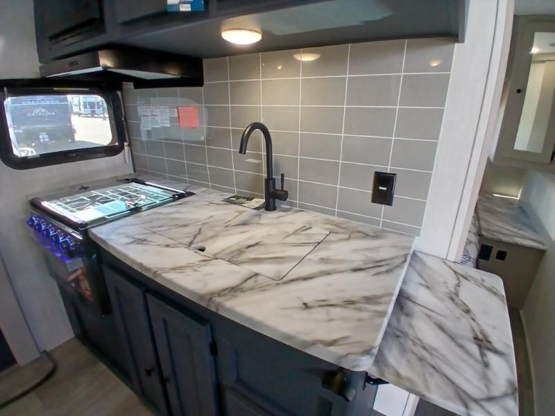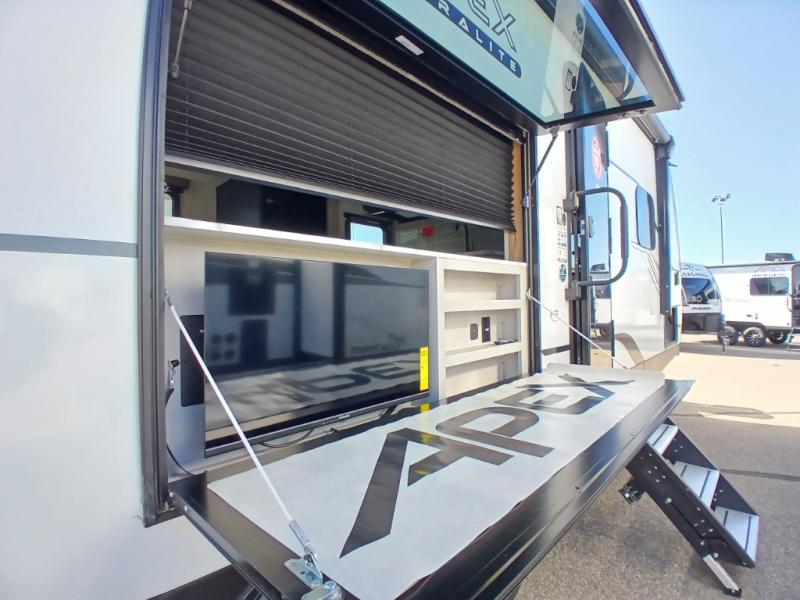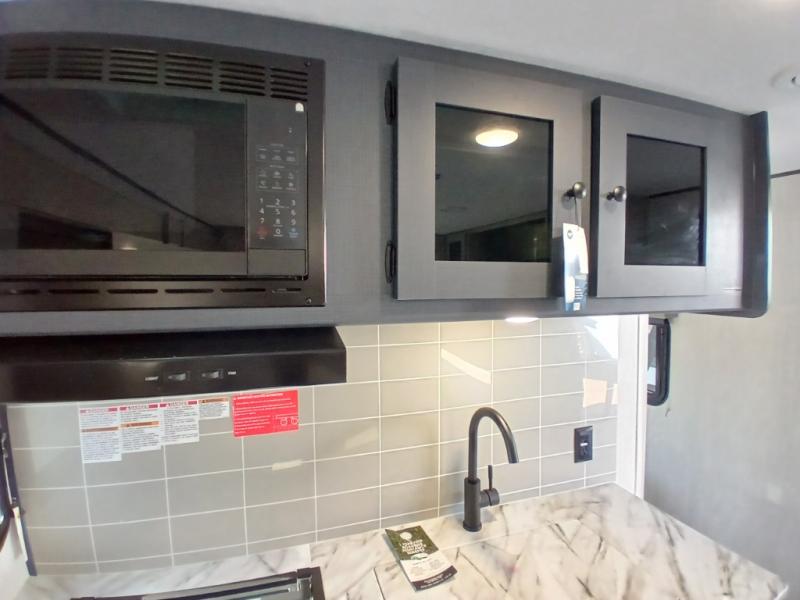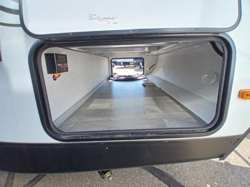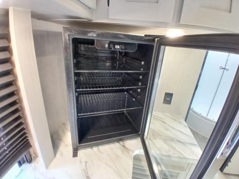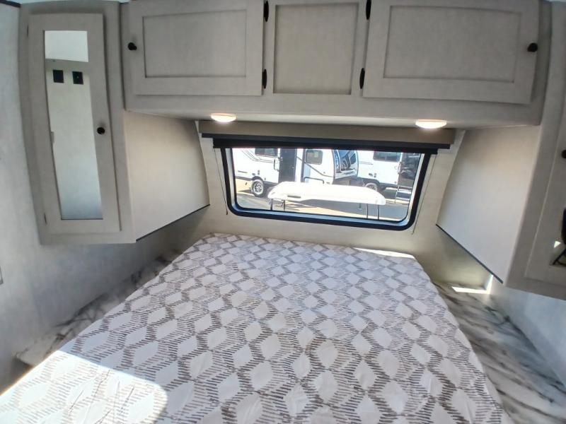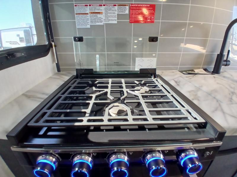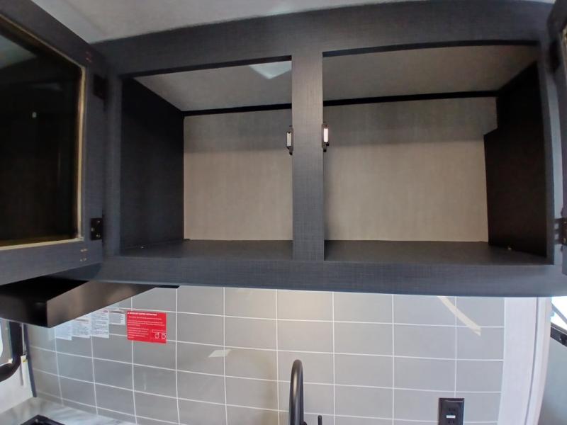 You will love this travel trailer front bedroom. Ideal for you and your partner, this bedroom is fitted with a 60x80 queen bed with super storage, dual wardrobes beside the bed and a over head cabinet. On the kitchen area you will find a 12V refrigerator, pantry, three burner cooktop and a bar countertop with stools, for have a nice drink on a hot day, in addition, you or your guests can rest on the 68" trifold sofa. Take a relaxing bath in the full bathroom furnished with 34" shower and overhead cabinets. You will also love the outdoor kitchen, perfect to have a meal while admiring nature.