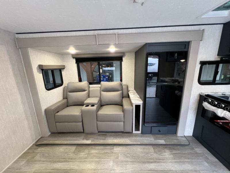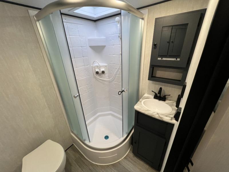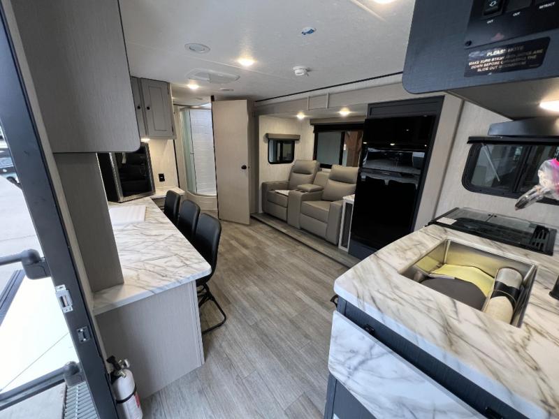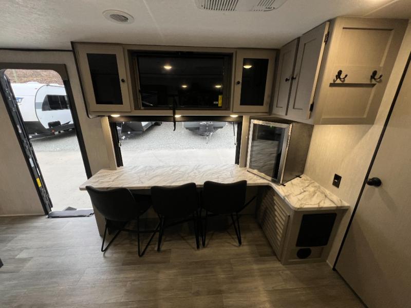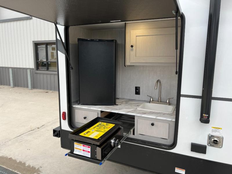 You will love this travel trailer front bedroom. Ideal for you and your partner, this bedroom is fitted with a 60x80 queen bed with super storage, dual wardrobes beside the bed and a over head cabinet. On the kitchen area you will find a 12V refrigerator, pantry, three burner cooktop and a bar countertop with stools, for have a nice drink on a hot day, in addition, you or your guests can rest on the 68" trifold sofa. Take a relaxing bath in the full bathroom furnished with 34" shower and overhead cabinets. You will also love the outdoor kitchen, perfect to have a meal while admiring nature.