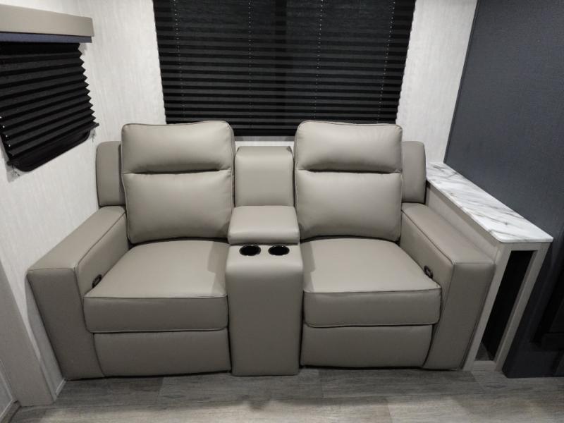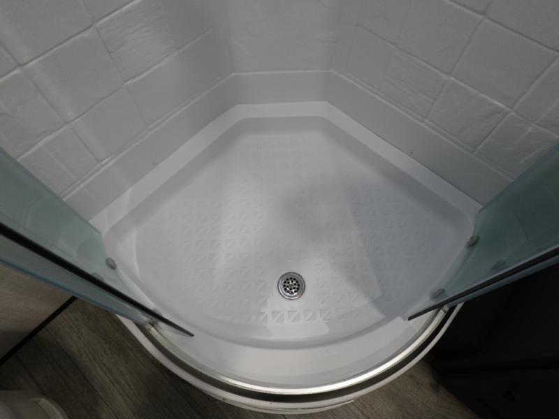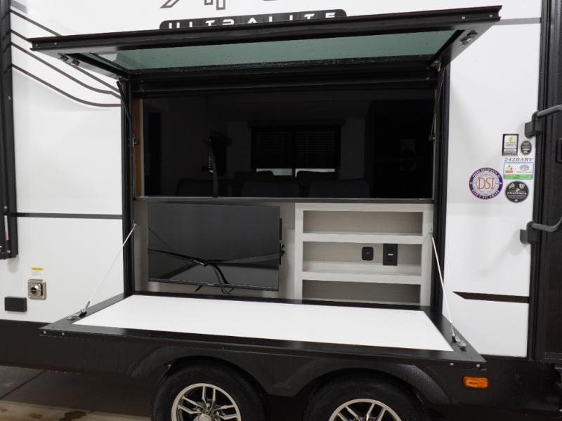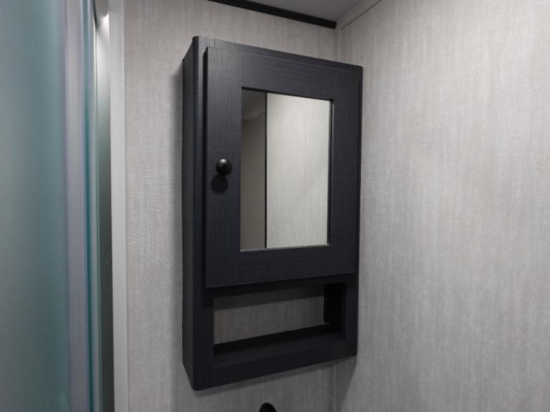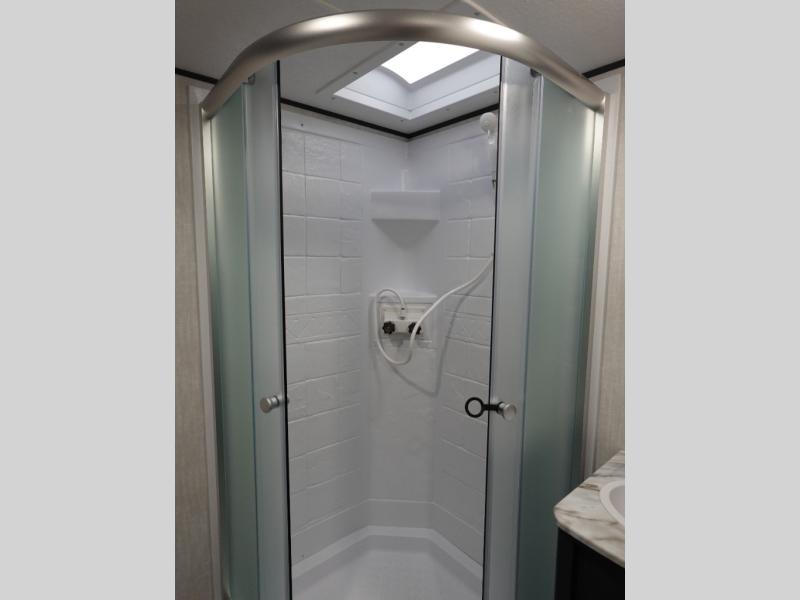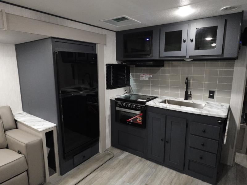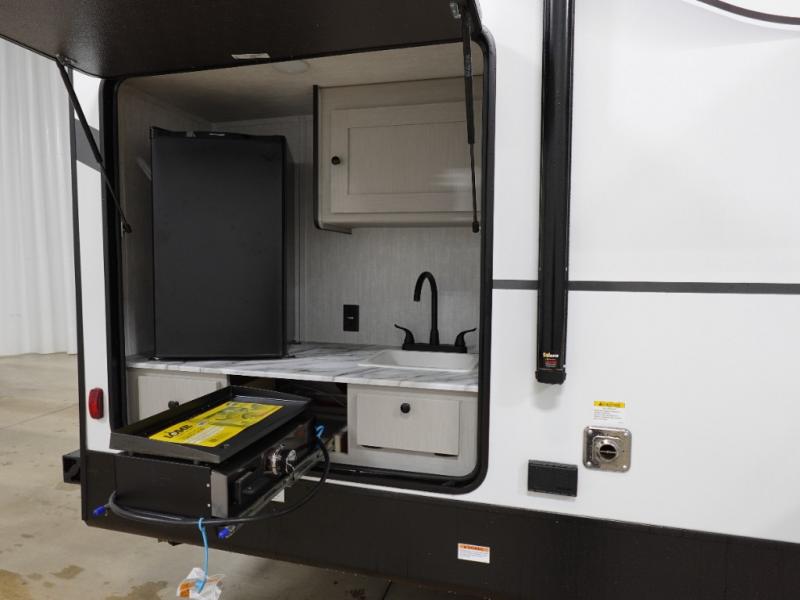 You will love this travel trailer front bedroom. Ideal for you and your partner, this bedroom is fitted with a 60x80 queen bed with super storage, dual wardrobes beside the bed and a over head cabinet. On the kitchen area you will find a 12V refrigerator, pantry, three burner cooktop and a bar countertop with stools, for have a nice drink on a hot day. Take a relaxing bath in the full bathroom furnished with 34" shower and overhead cabinets. You will also love the outdoor kitchen, perfect to have a meal while admiring nature.