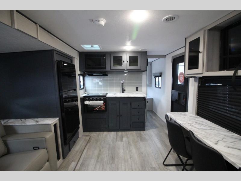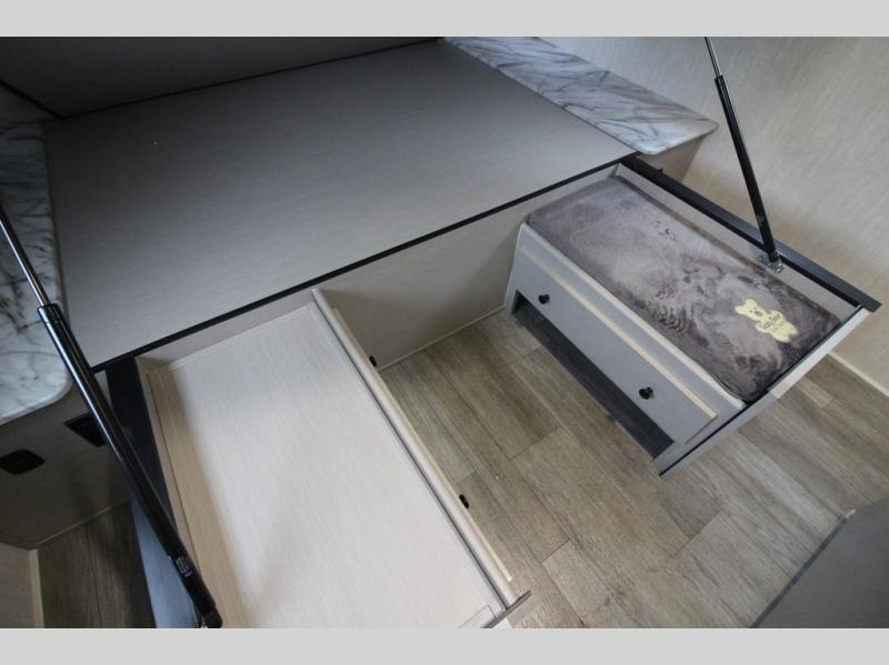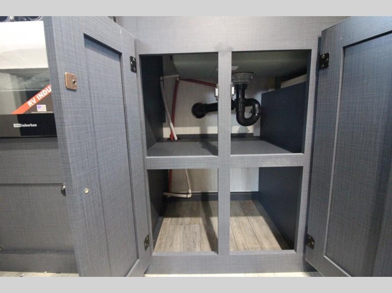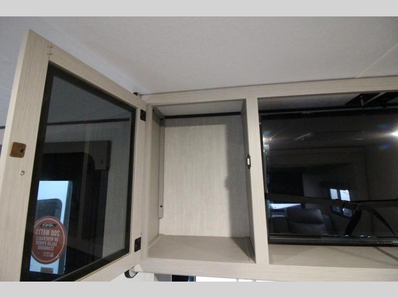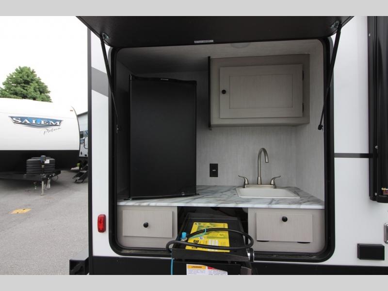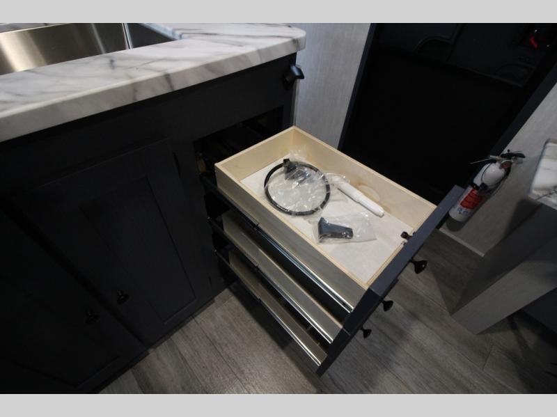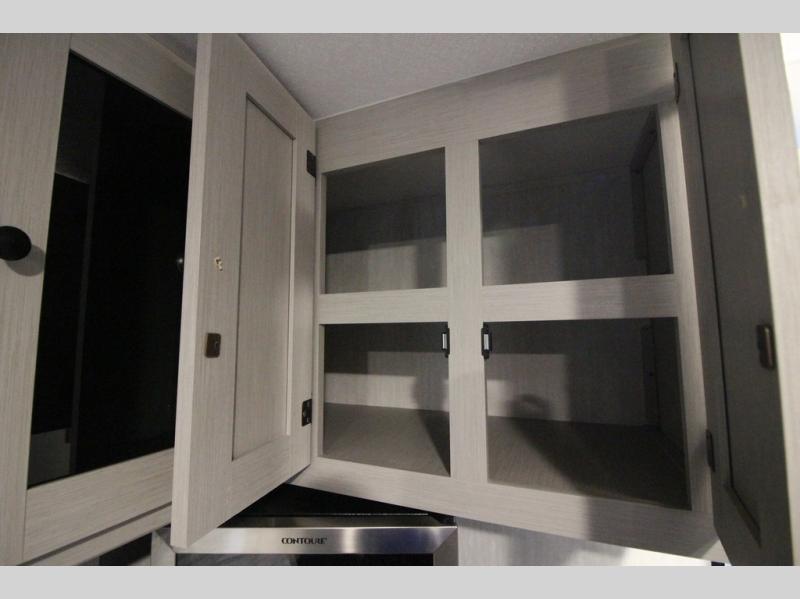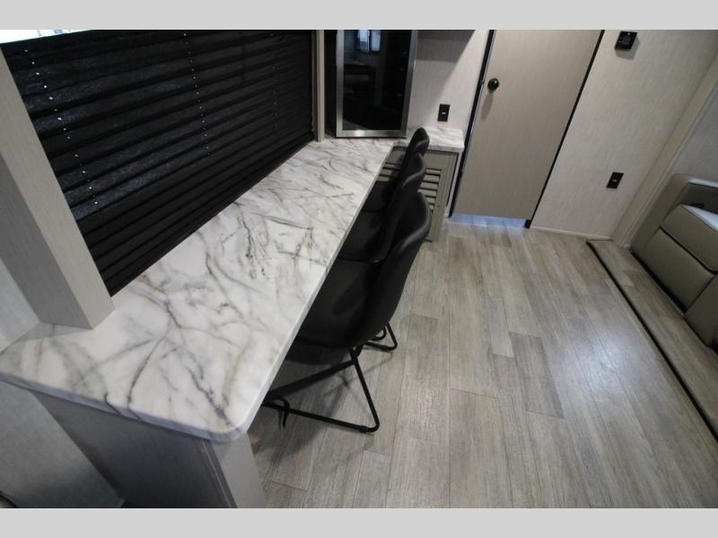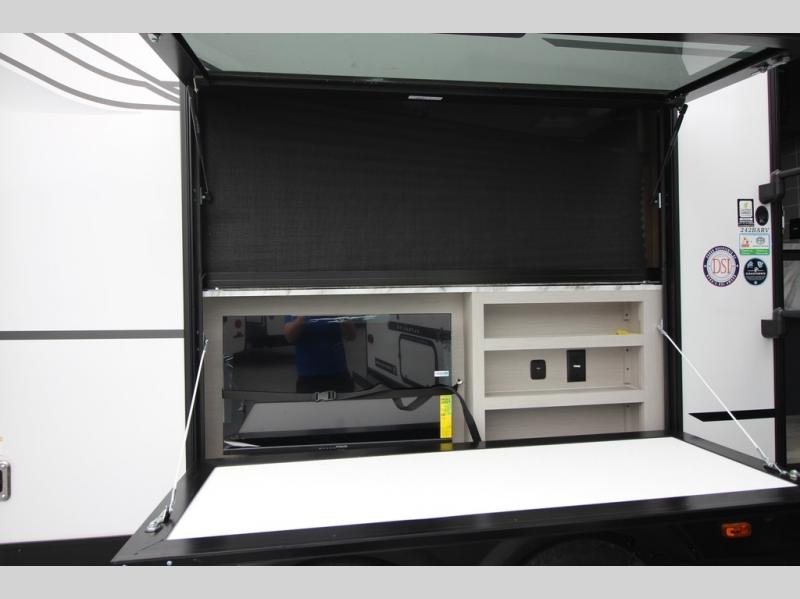 You will love this travel trailer front bedroom. Ideal for you and your partner, this bedroom is fitted with a 60x80 queen bed with super storage, dual wardrobes beside the bed and a over head cabinet. On the kitchen area you will find a 12V refrigerator, pantry, three burner cooktop and a bar countertop with stools, for have a nice drink on a hot day, in addition, you or your guests can rest on the 68" trifold sofa. Take a relaxing bath in the full bathroom furnished with 34" shower and overhead cabinets. You will also love the outdoor kitchen, perfect to have a meal while admiring nature.