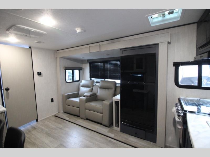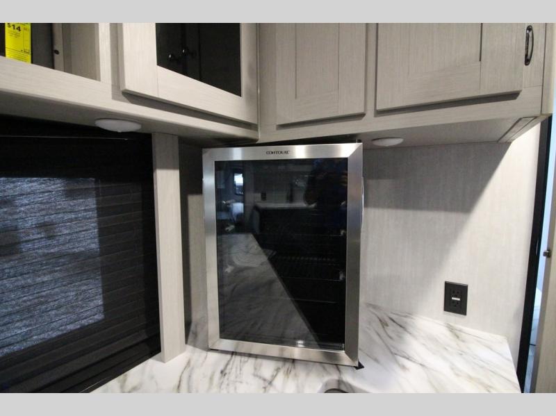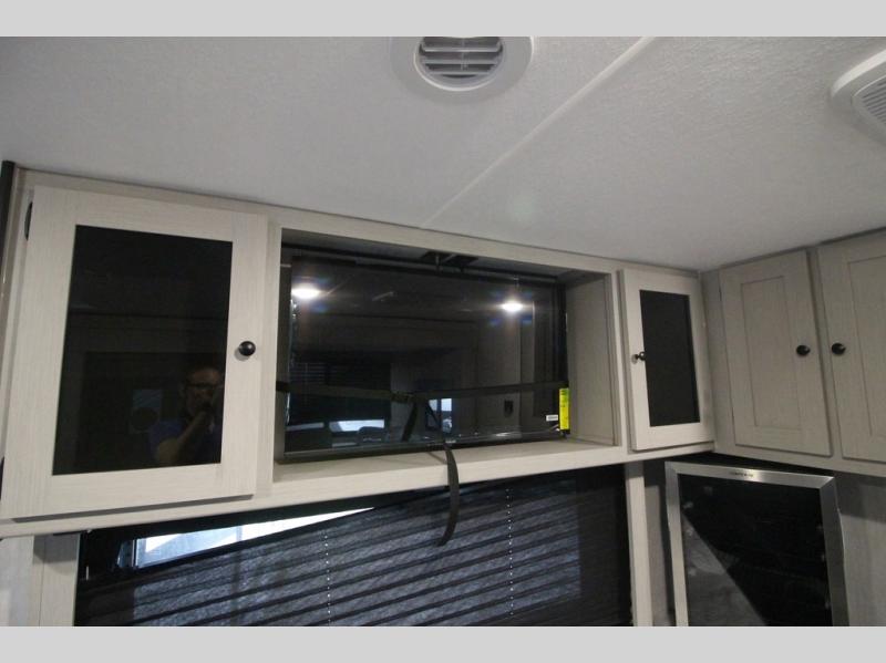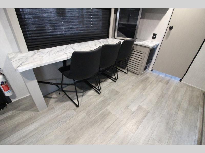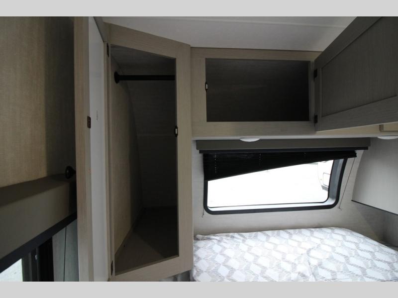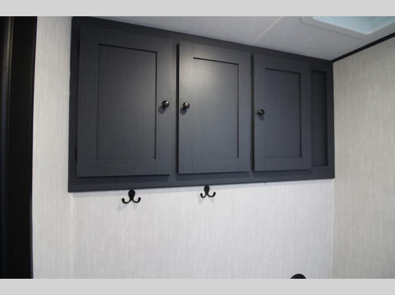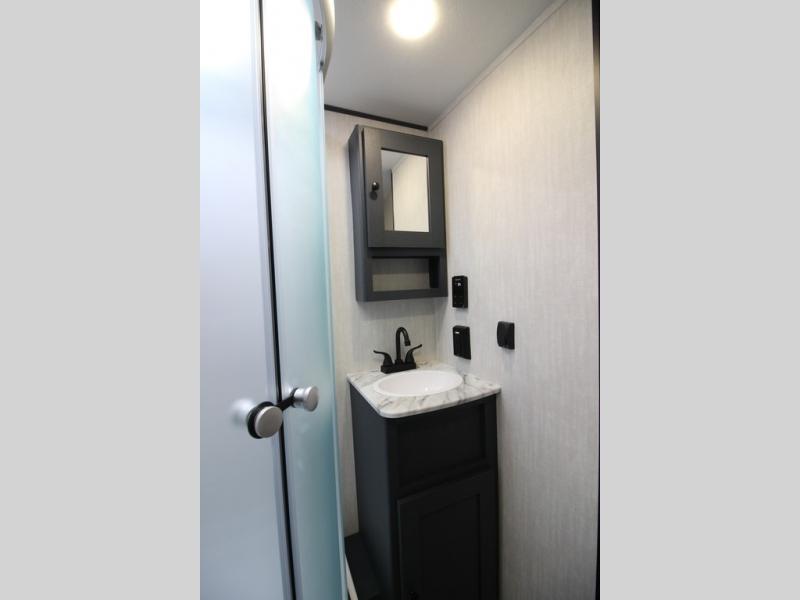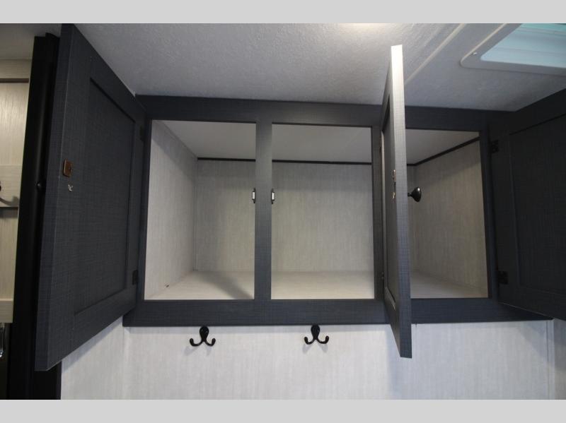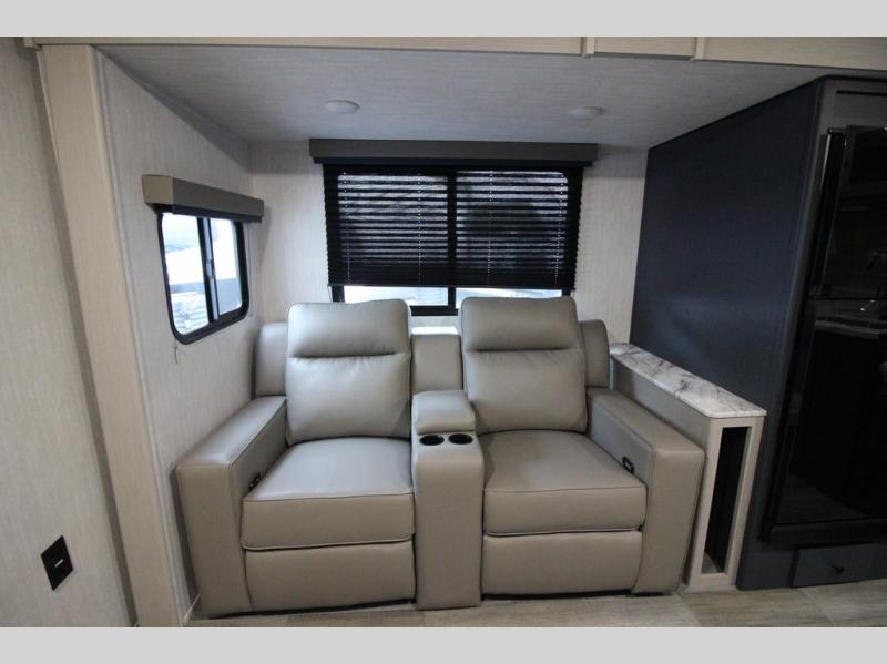 You will love this travel trailer front bedroom. Ideal for you and your partner, this bedroom is fitted with a 60x80 queen bed with super storage, dual wardrobes beside the bed and a over head cabinet. On the kitchen area you will find a 12V refrigerator, pantry, three burner cooktop and a bar countertop with stools, for have a nice drink on a hot day, in addition, you or your guests can rest on the 68" trifold sofa. Take a relaxing bath in the full bathroom furnished with 34" shower and overhead cabinets. You will also love the outdoor kitchen, perfect to have a meal while admiring nature.