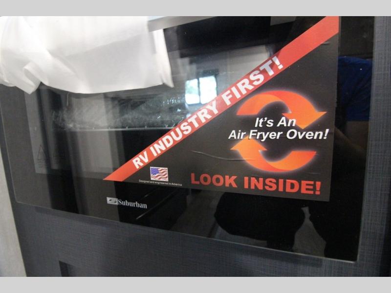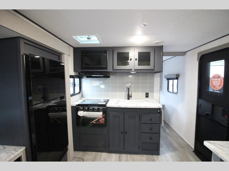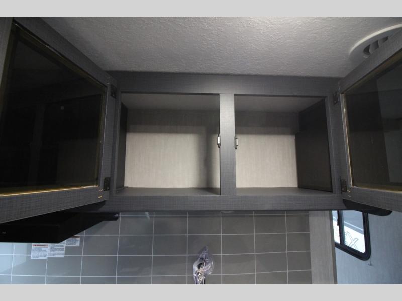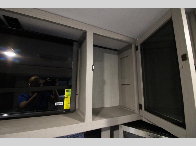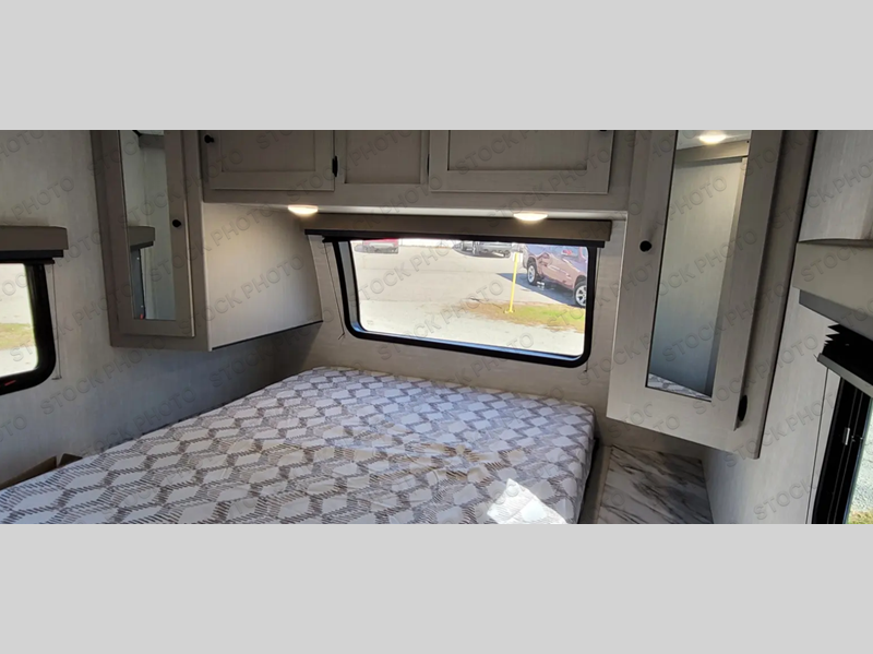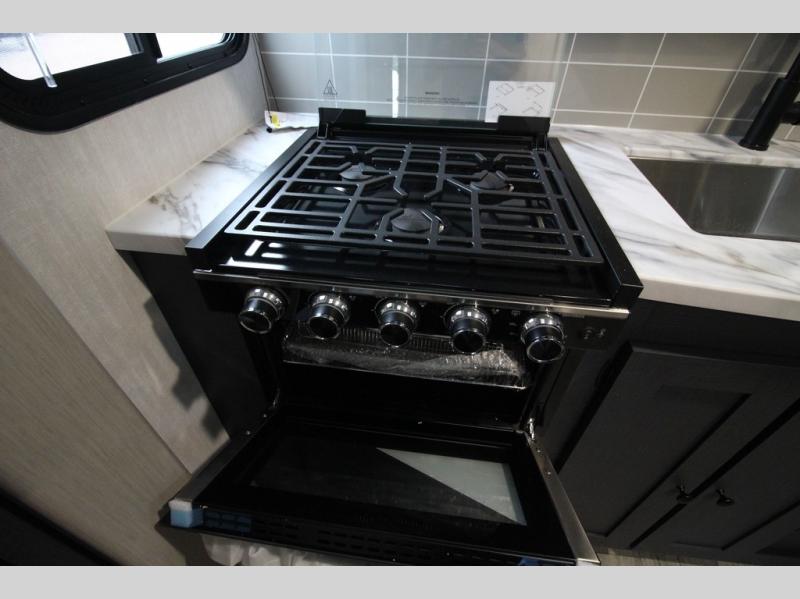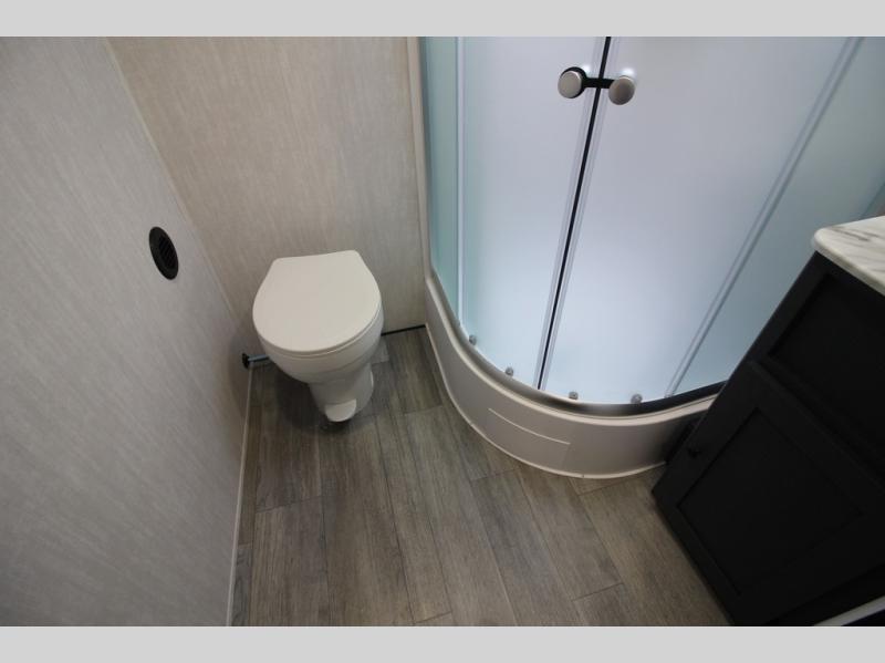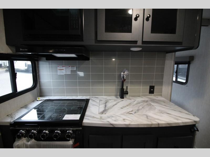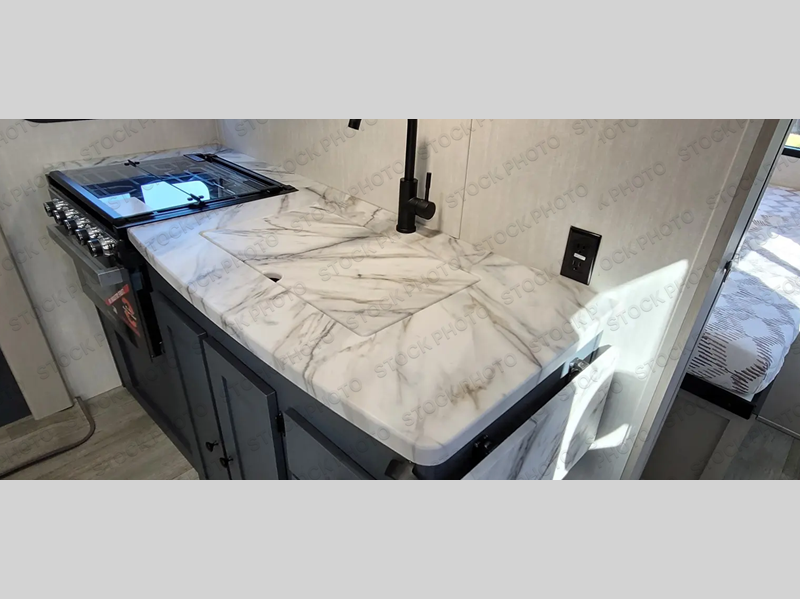 You will love this travel trailer front bedroom. Ideal for you and your partner, this bedroom is fitted with a 60x80 queen bed with super storage, dual wardrobes beside the bed and a over head cabinet. On the kitchen area you will find a 12V refrigerator, pantry, three burner cooktop and a bar countertop with stools, for have a nice drink on a hot day, in addition, you or your guests can rest on the 68" trifold sofa. Take a relaxing bath in the full bathroom furnished with 34" shower and overhead cabinets. You will also love the outdoor kitchen, perfect to have a meal while admiring nature.