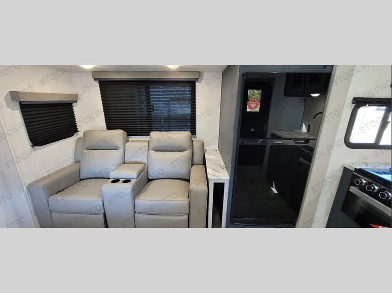 You will love this travel trailer front bedroom. Ideal for you and your partner, this bedroom is fitted with a 60x80 queen bed with super storage, dual wardrobes beside the bed and a over head cabinet. On the kitchen area you will find a 12V refrigerator, pantry, three burner cooktop and a bar countertop with stools, for have a nice drink on a hot day, in addition, you or your guests can rest on the 68" trifold sofa. Take a relaxing bath in the full bathroom furnished with 34" shower and overhead cabinets. You will also love the outdoor kitchen, perfect to have a meal while admiring nature.