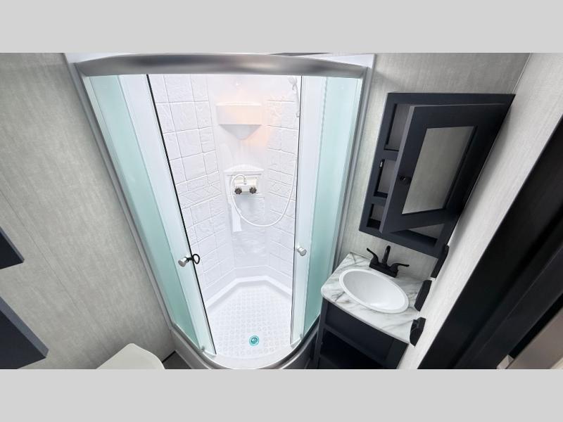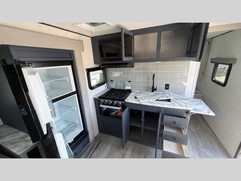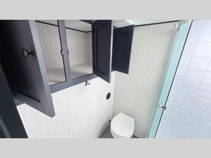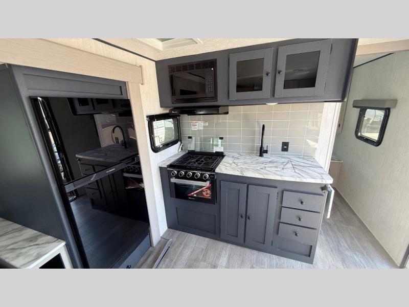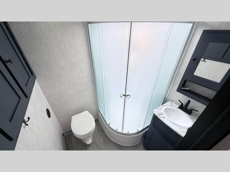 You will love this travel trailer front bedroom. Ideal for you and your partner, this bedroom is fitted with a 60x80 queen bed with super storage, dual wardrobes beside the bed and a over head cabinet. On the kitchen area you will find a 12V refrigerator, pantry, three burner cooktop and a bar countertop with stools, for have a nice drink on a hot day, in addition, you or your guests can rest on the 68" trifold sofa. Take a relaxing bath in the full bathroom furnished with 34" shower and overhead cabinets. You will also love the outdoor kitchen, perfect to have a meal while admiring nature.
