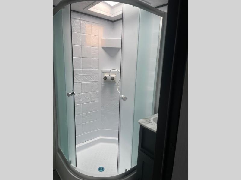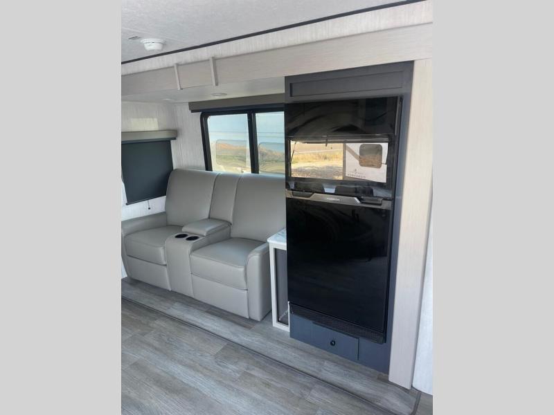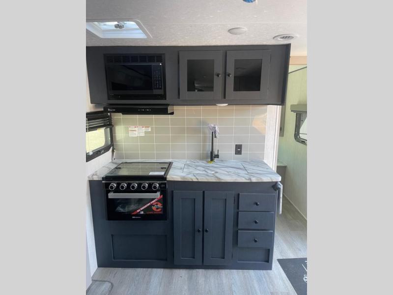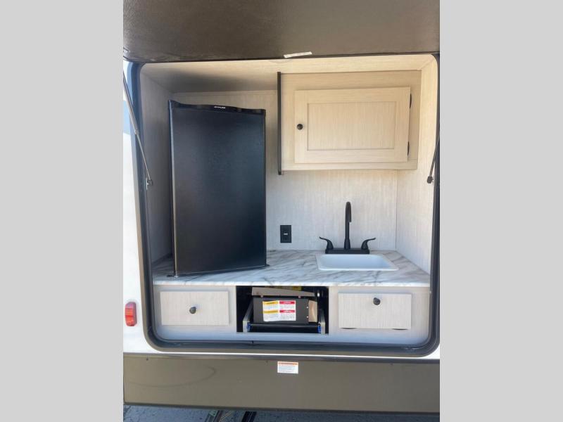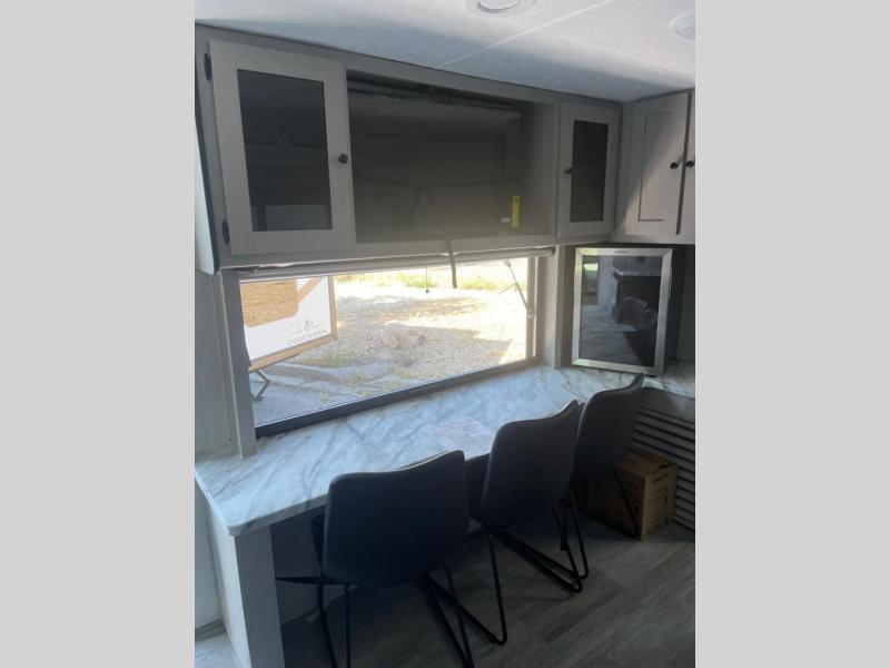 You will love this travel trailer front bedroom. Ideal for you and your partner, this bedroom is fitted with a 60x80 queen bed with super storage, dual wardrobes beside the bed and a over head cabinet. On the kitchen area you will find a 12V refrigerator, pantry, three burner cooktop and a bar countertop with stools, for have a nice drink on a hot day, in addition, you or your guests can rest on the 68" trifold sofa. Take a relaxing bath in the full bathroom furnished with 34" shower and overhead cabinets. You will also love the outdoor kitchen, perfect to have a meal while admiring nature.