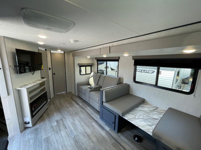 Enjoy each adventure camping in this Apex Ultra-Lite unit featuring dual entry doors. There is sleeping for up to six with the convertible dinette and sofa, plus a queen bed slide in the rear private bedroom that includes super storage beneath. This bedroom also features a large wardrobe near the private bedroom entry door. The front kitchen has everything you need to prepare hearty camp meals easily thanks to the large counter space for prepping. A booth dinette and sofa slide offer seating for everyone and all will easily be able to view the entertainment center with TV and cozy fireplace from either one. A large pantry is conveniently located just inside the main front entry door where you can quickly grab a snack for outside, or load up groceries once you shop for your trip. You will also love the exterior camp kitchen to cook meals outdoors!