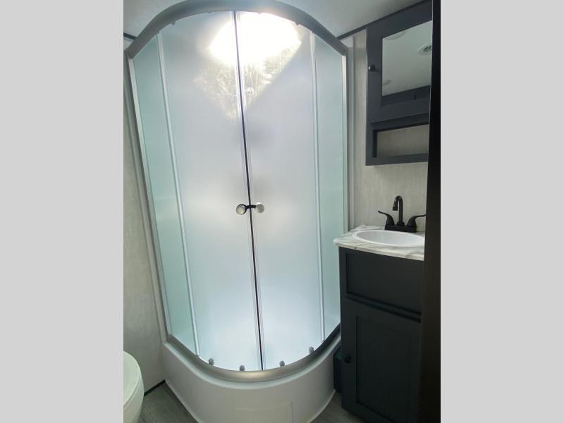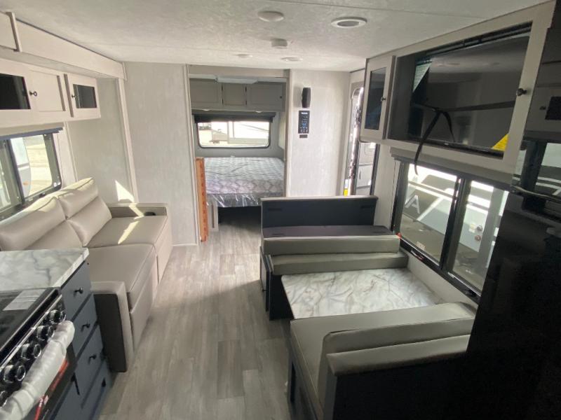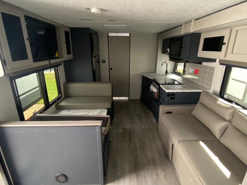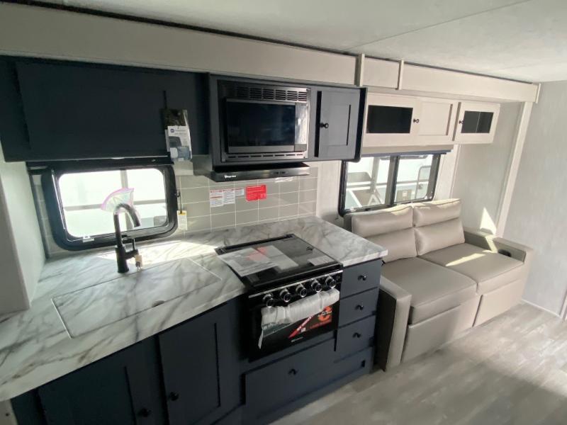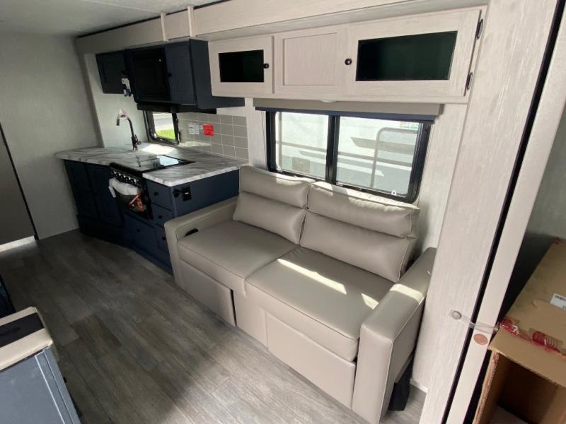 Escape the city life for relaxing weekend in this spacious travel trailer. A large slide out provides plenty of space to relax on the sofa or dine at the booth dinette. The full rear bath will allow you to stay clean throughout your trip. The chef can choose to cook indoors on the three burner cooktop, or head outdoors to cook on the outside kitchen! And when it's time to turn in for the night you'll have your own private bedroom up front with a queen bed and dual wardrobes, and any guests you have can sleep on the sofa and booth dinette!