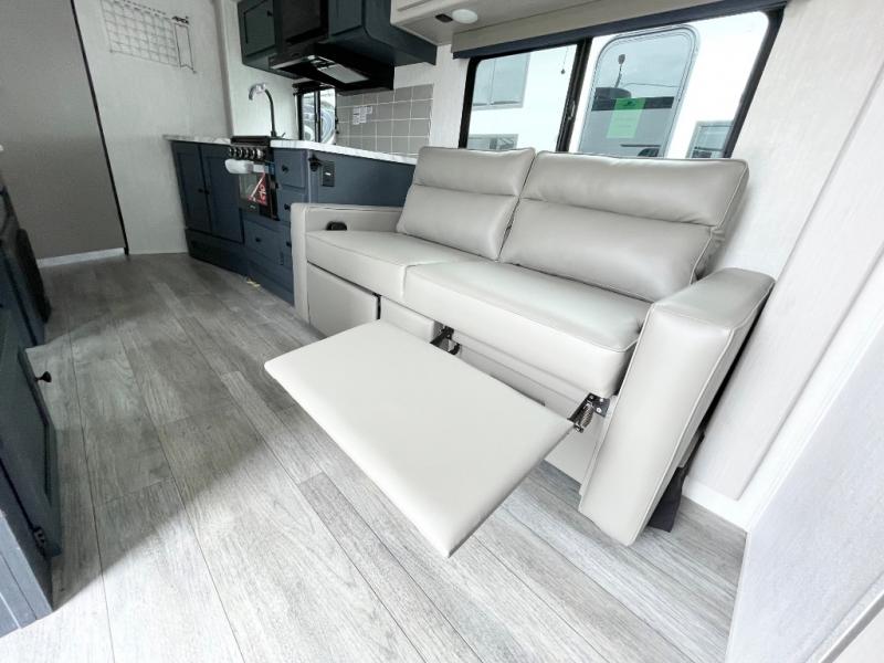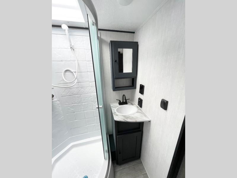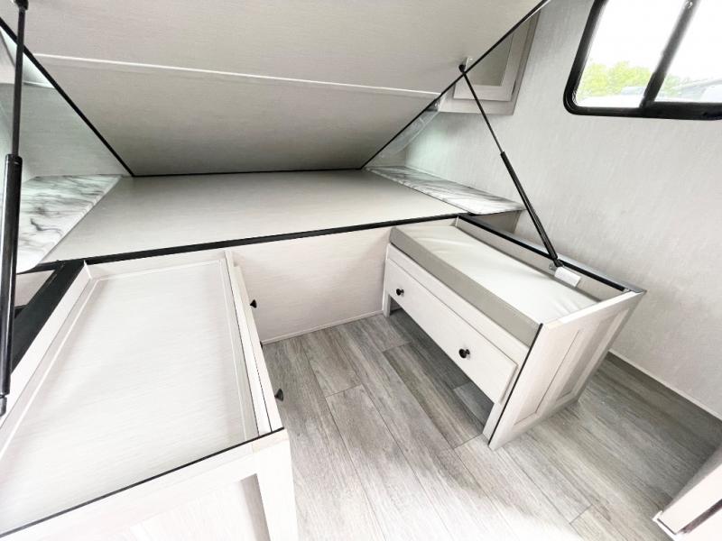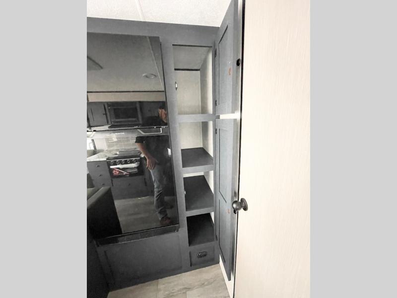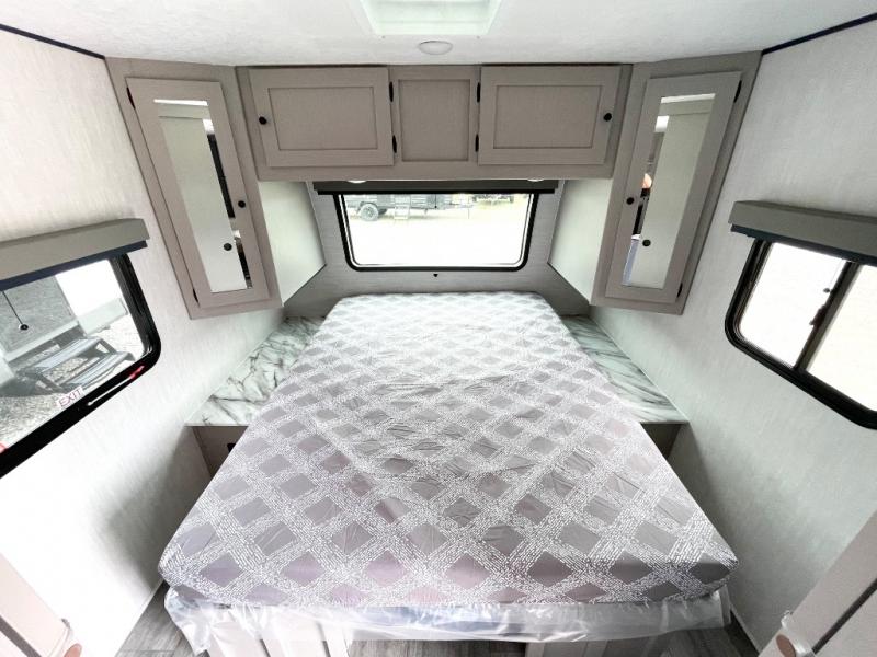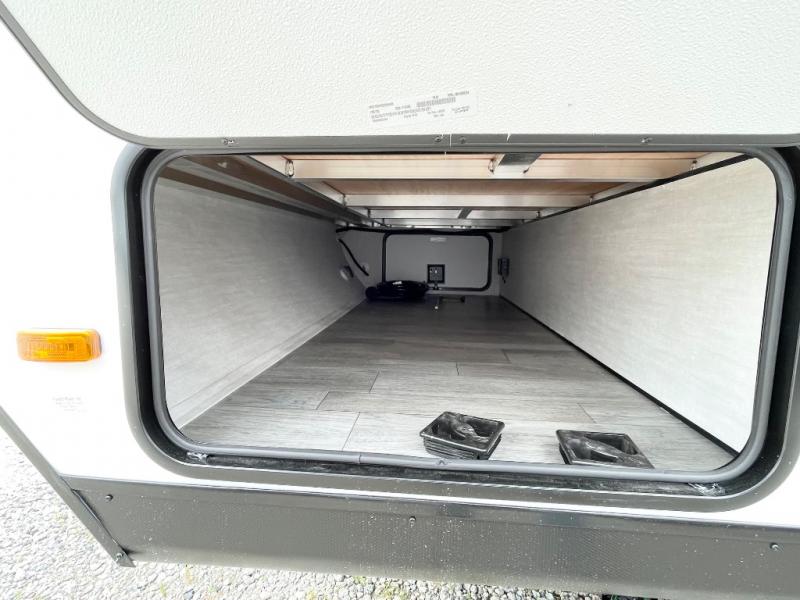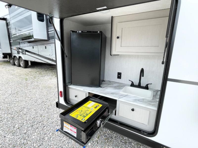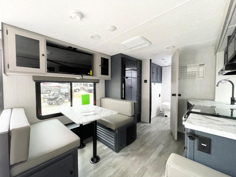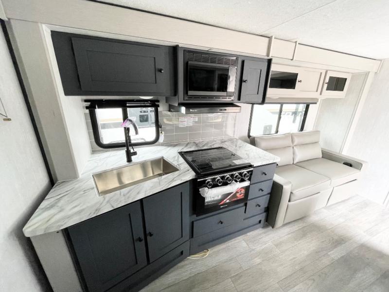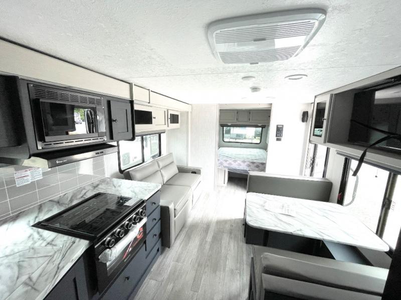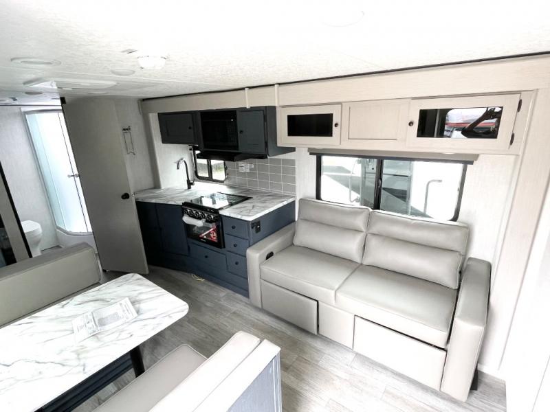 Escape the city life for relaxing weekend in this spacious travel trailer. A large slide out provides plenty of space to relax on the sofa or dine at the booth dinette. The full rear bath will allow you to stay clean throughout your trip. The chef can choose to cook indoors on the three burner cooktop, or head outdoors to cook on the outside kitchen! And when it's time to turn in for the night you'll have your own private bedroom up front with a queen bed and dual wardrobes, and any guests you have can sleep on the sofa and booth dinette!