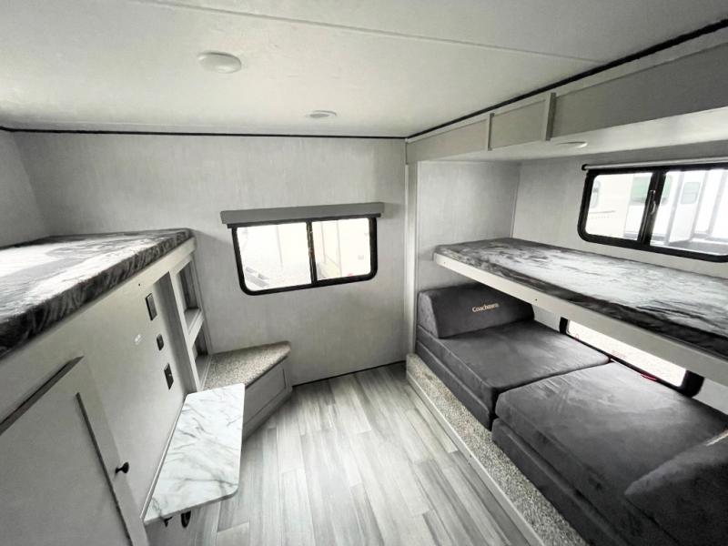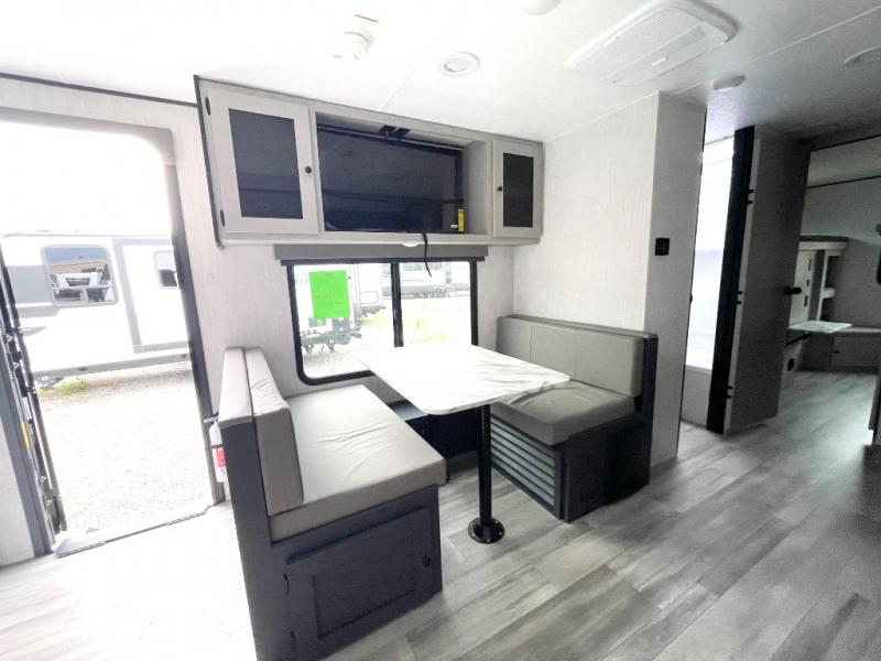 Double slides, a bunkhouse, plus a private bedroom and sleeping for nine make this model ready for anything! There is a private bunkhouse with a slide out futon and an overhead bunk, plus a second bunk for the kids to enjoy. Up front, a queen bed with super storage will provide two a comfortable night's rest in a private bedroom, and any other guests can sleep on the booth dinette and sofa in the main living area. The chef can cook indoors, or outdoors on the outside kitchen, and since there is an 18' power awning with LED lights, you can enjoy a bit of outdoor living space as well!