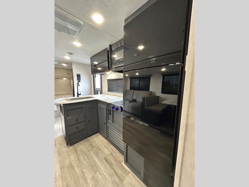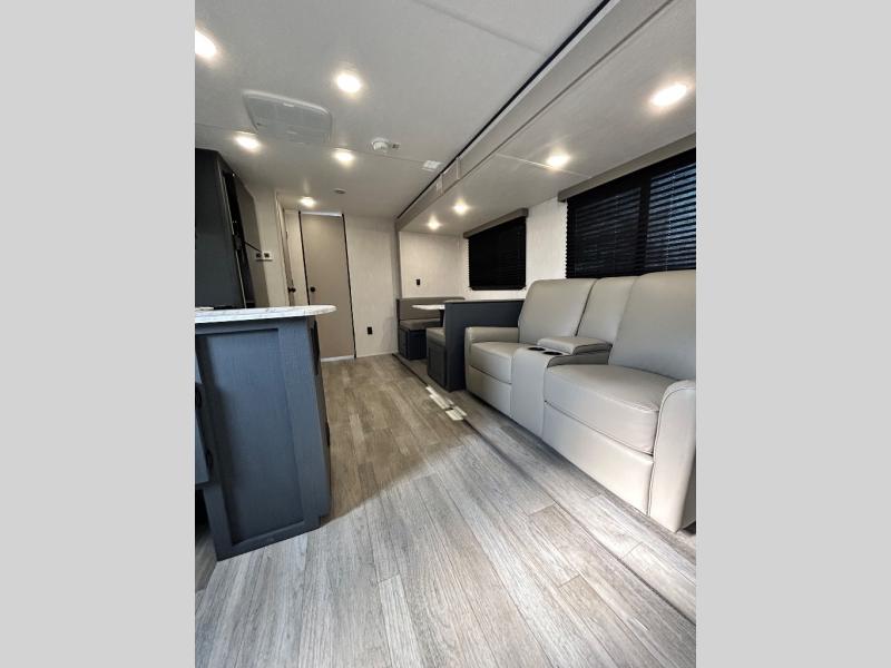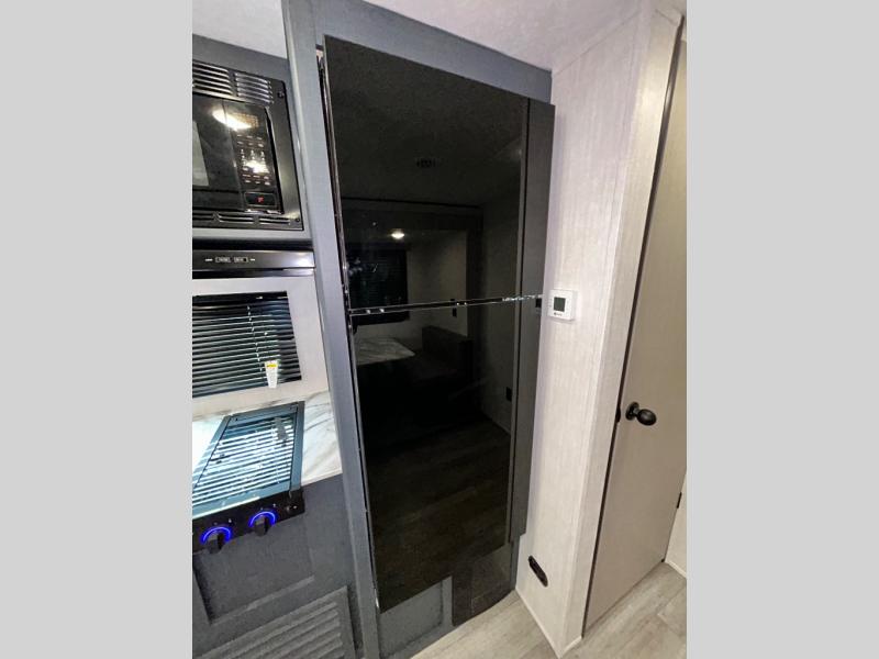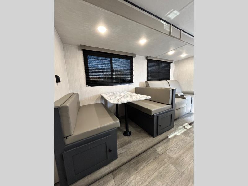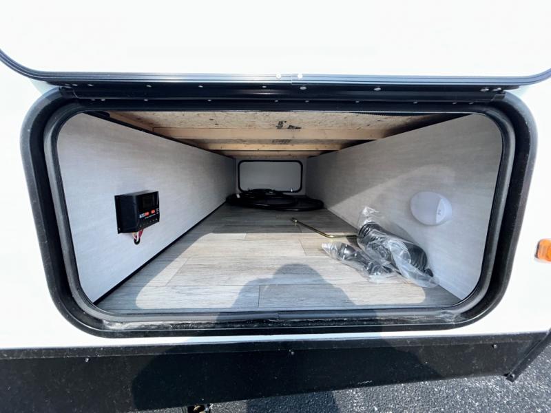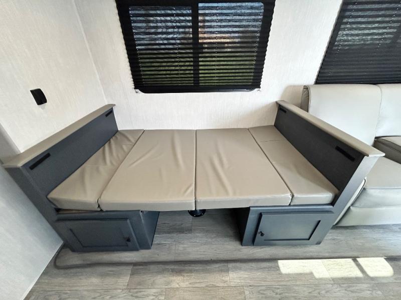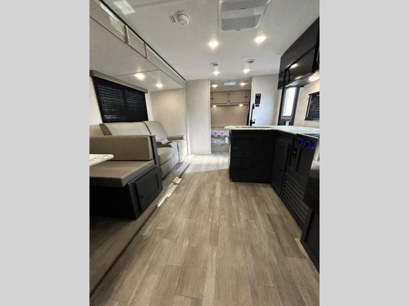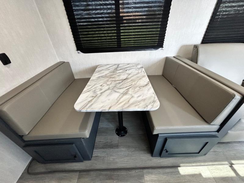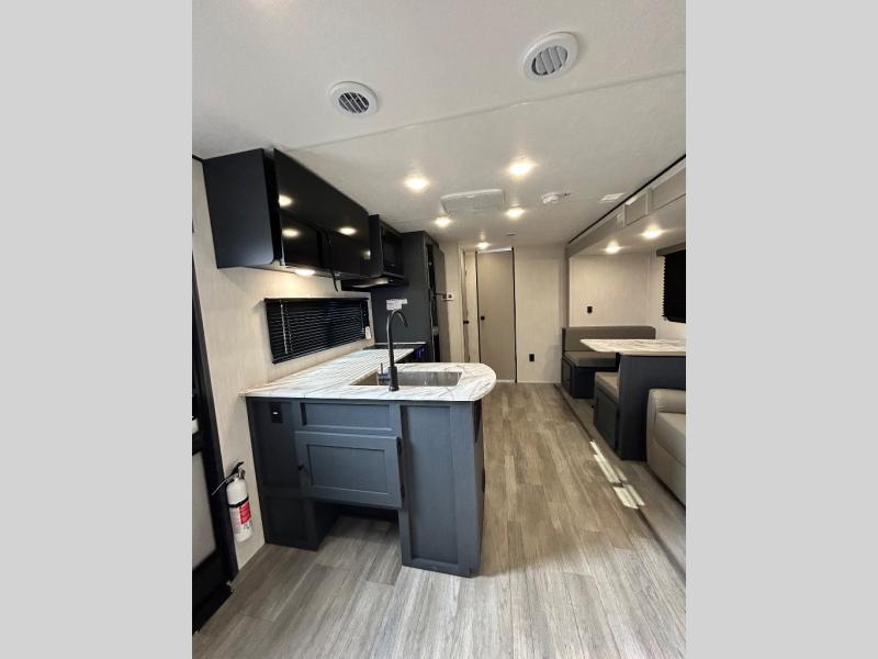 Answer the call of the wild with this travel trailer in tow! You will love having your own bedroom up front that includes a queen bed with storage below plus an overhead cabinet for books and more. A large slide out in the combined kitchen and living area houses the sofa and booth dinette, and these pieces of furniture can double as sleeping space for guests as well. The chef of your group will appreciate the L-shaped kitchen counter with a large sink, a microwave and range plus a refrigerator and pantry for food storage. And the full rear bath will let you freshen up each day. There is a counter with a sink, toilet, and a radius shower/tub!