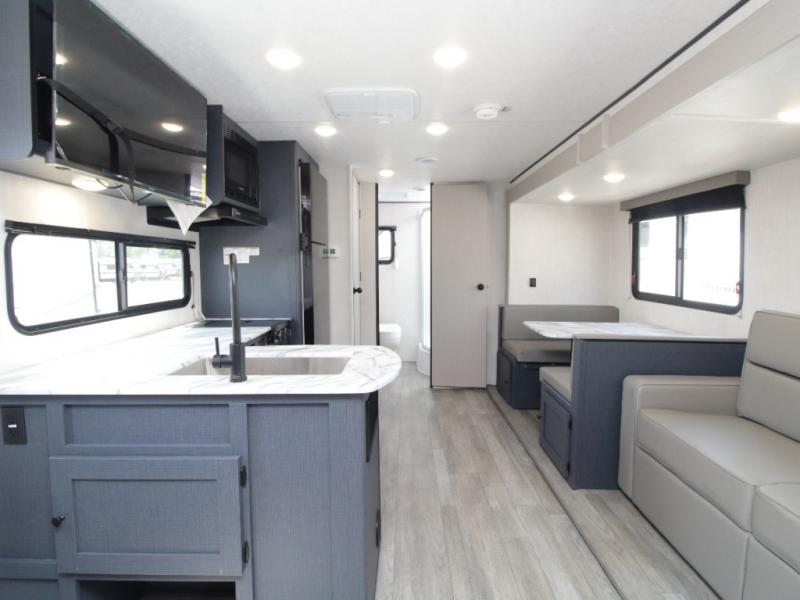 The kitchen is equipped with everything you need for campground cooking, including a microwave, three-burner range, refrigerator, pantry, and a roomy L-shaped counter with a large sink. Whether you're preparing breakfast or dinner, you'll have the space and tools to do it right.