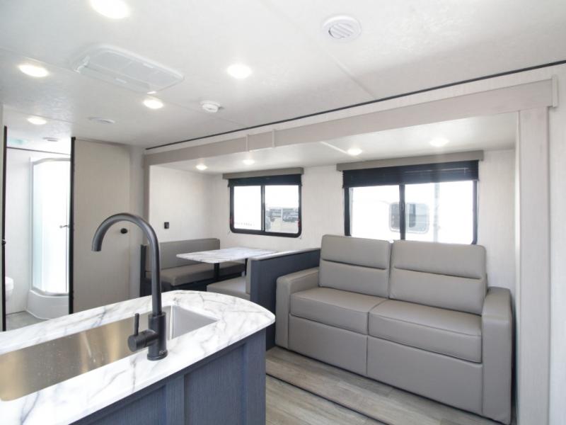 Up front, you'll find a private bedroom featuring a queen bed, under-bed storage, and overhead cabinetry—offering a cozy, organized retreat after a day of exploring. The large slide-out in the central living area extends the space and houses a sofa and booth dinette, both of which can be converted into additional sleeping spots for guests or kids.