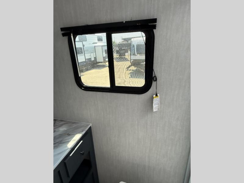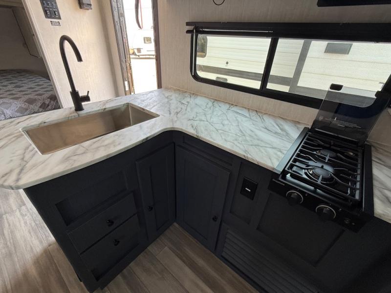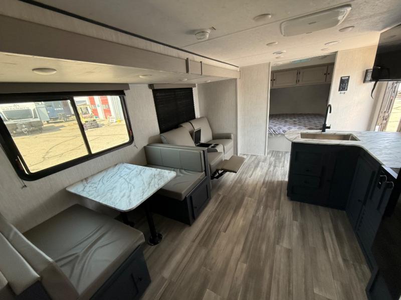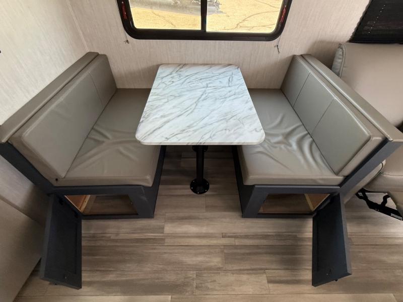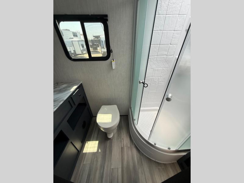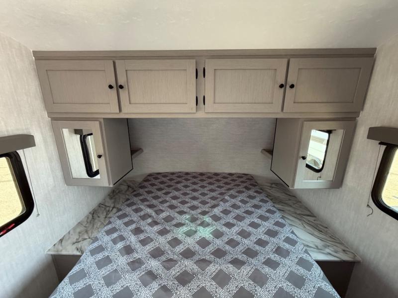 Answer the call of the wild with this travel trailer in tow! You will love having your own bedroom up front that includes a queen bed with storage below plus an overhead cabinet for books and more. A large slide out in the combined kitchen and living area houses the sofa and booth dinette, and these pieces of furniture can double as sleeping space for guests as well. The chef of your group will appreciate the L-shaped kitchen counter with a large sink, a microwave and range plus a refrigerator and pantry for food storage. And the full rear bath will let you freshen up each day. There is a counter with a sink, toilet, and a radius shower/tub!