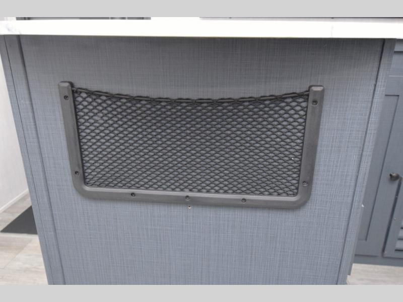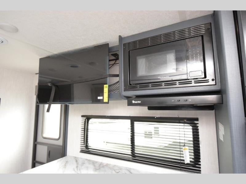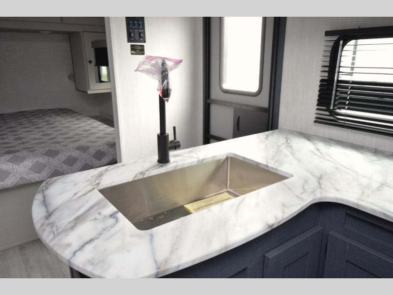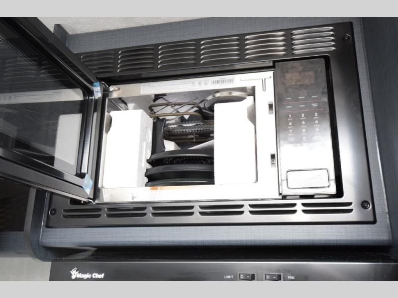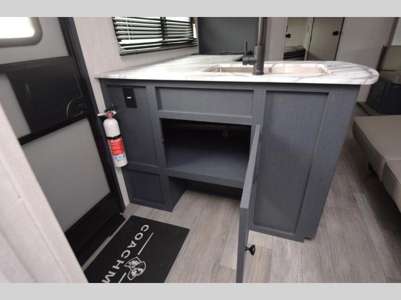 The kitchen is designed for convenience with an L-shaped counter, large sink, microwave, range, pantry, and refrigerator – everything you need to cook up delicious meals on the road. Plus, you’ll love the generous outside storage for all your camping essentials.