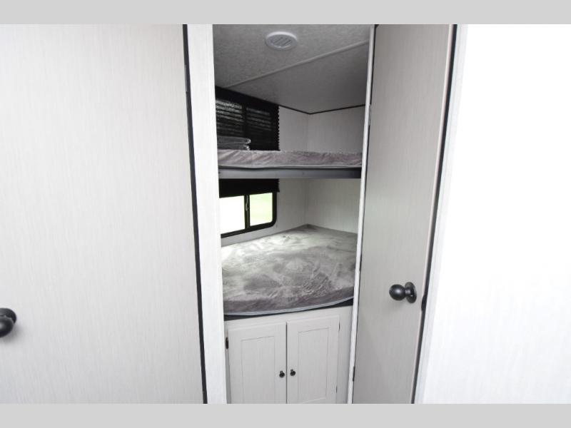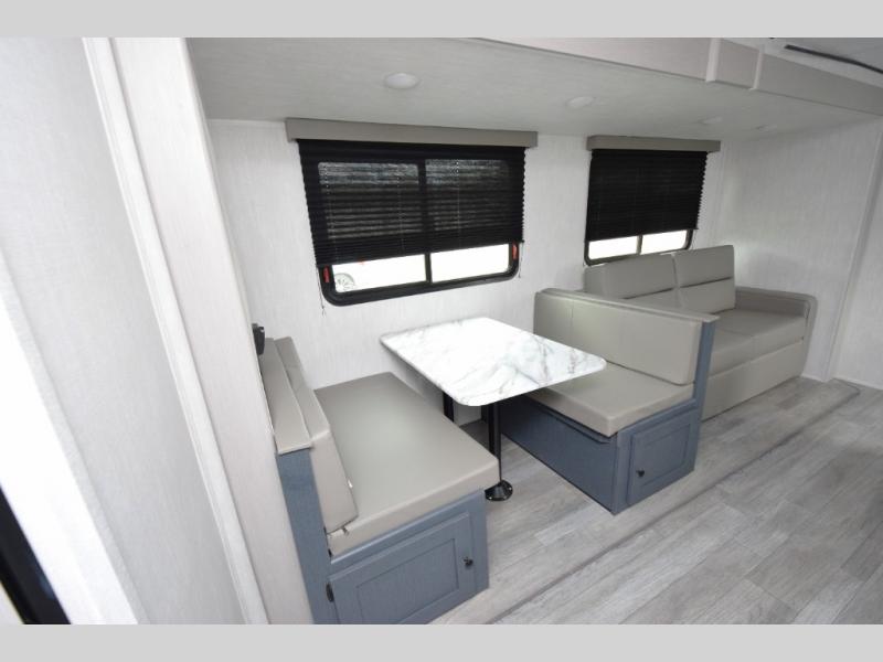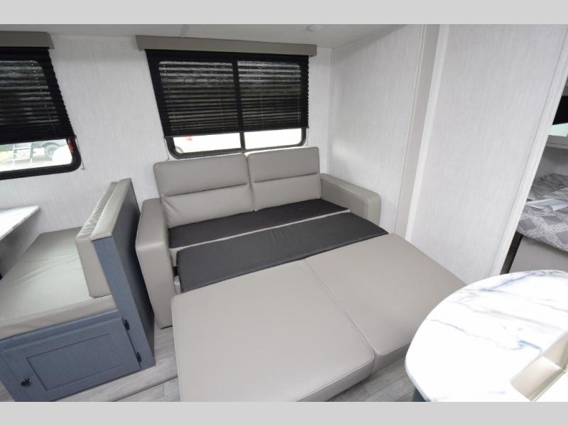 Relax in your private front bedroom with a queen-size bed and under-bed storage, while your guests or kids enjoy the double-size bunk beds in the rear. The spacious slide-out living area creates an open feel and includes both a sofa and booth dinette – perfect for dining, relaxing, or converting into extra sleeping space.