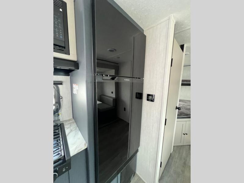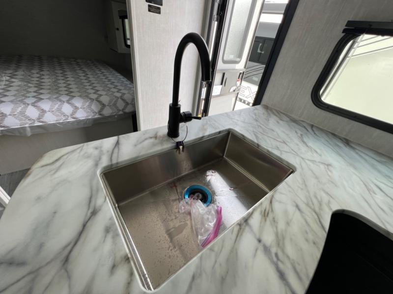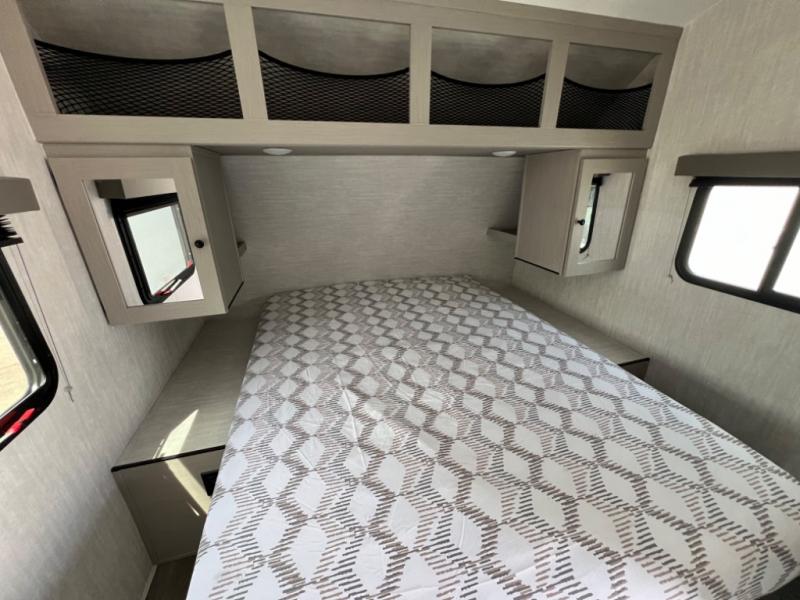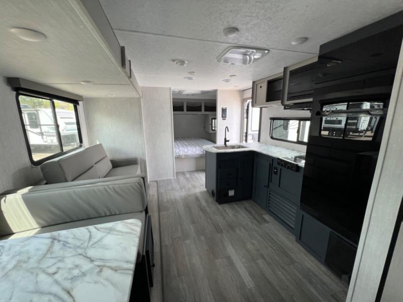 Make each camping trip count in this spacious travel trailer! You will love having your own bedroom up front that includes a queen bed with super storage below plus an overhead cabinet for books and more. A large slide out in the combined kitchen and living area houses the sofa and booth dinette, and these pieces of furniture can double as sleeping space for guests as well. The chef of your group will appreciate the L-shaped kitchen counter with a large sink, a microwave and range plus a refrigerator and pantry for food storage. This unit also includes 30" x 74" double-size bunks for your guests or kids!