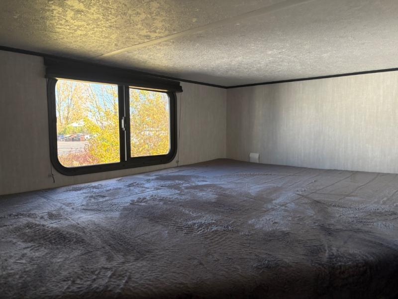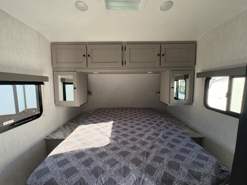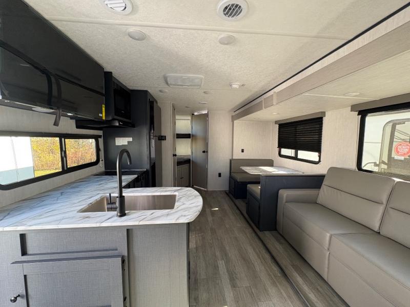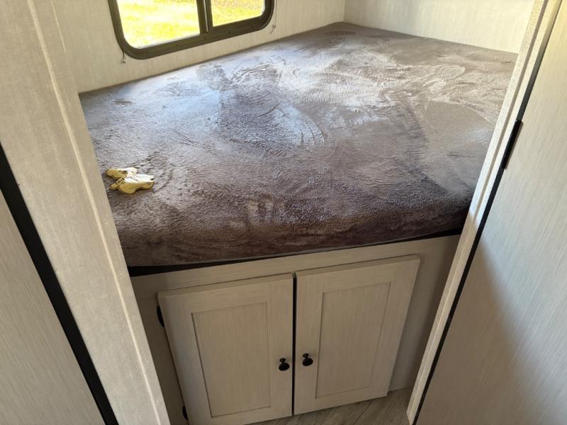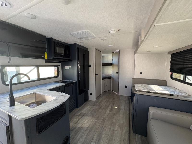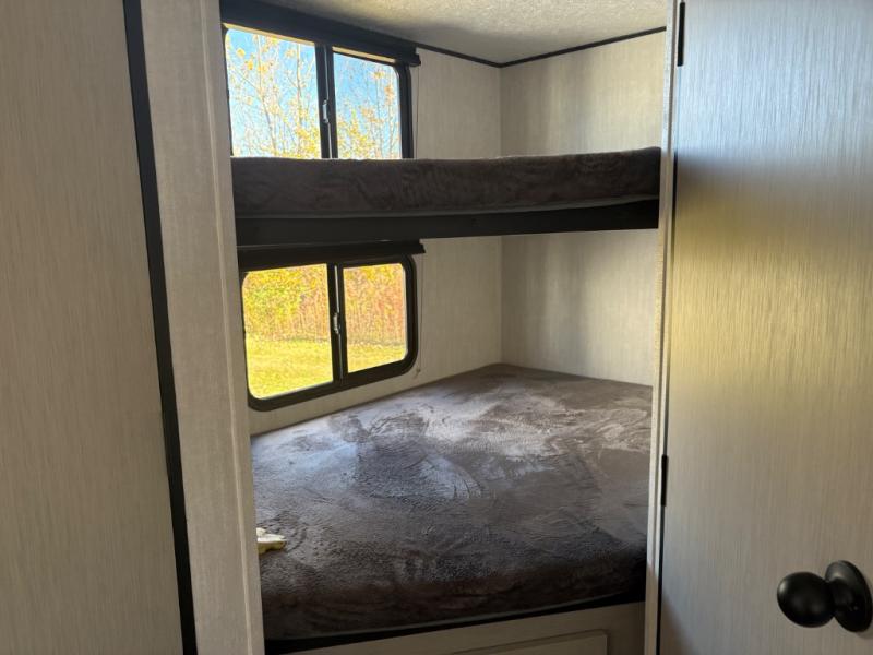 Make each camping trip count in this spacious travel trailer! You will love having your own bedroom up front that includes a queen bed with super storage below plus an overhead cabinet for books and more. A large slide out in the combined kitchen and living area houses the sofa and booth dinette, and these pieces of furniture can double as sleeping space for guests as well. The chef of your group will appreciate the L-shaped kitchen counter with a large sink, a microwave and range plus a refrigerator and pantry for food storage. This unit also includes 30" x 74" double-size bunks for your guests or kids!
